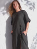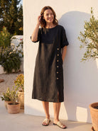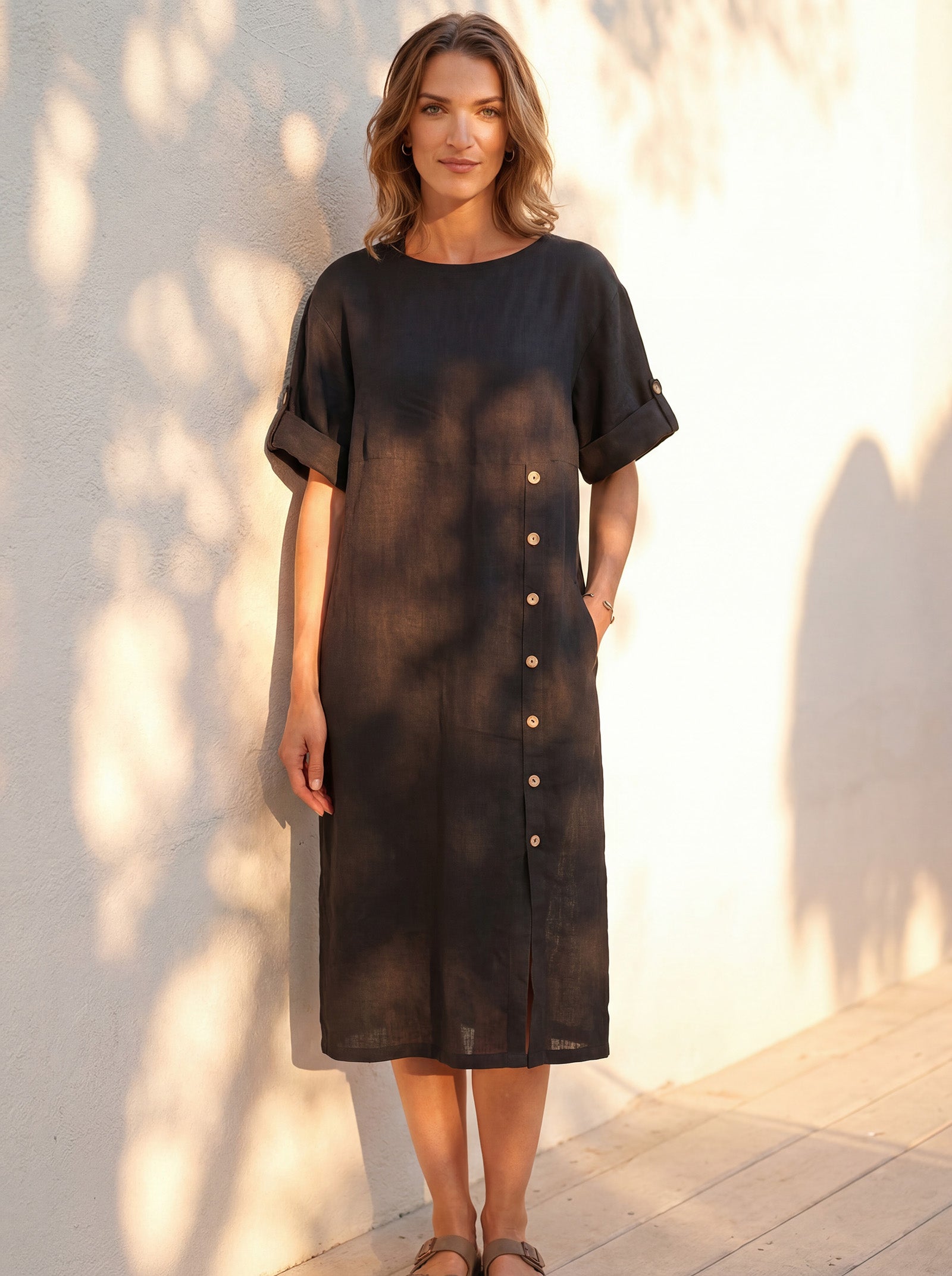 100% Linen Round Neck Button Detail Midi Dress JELENA