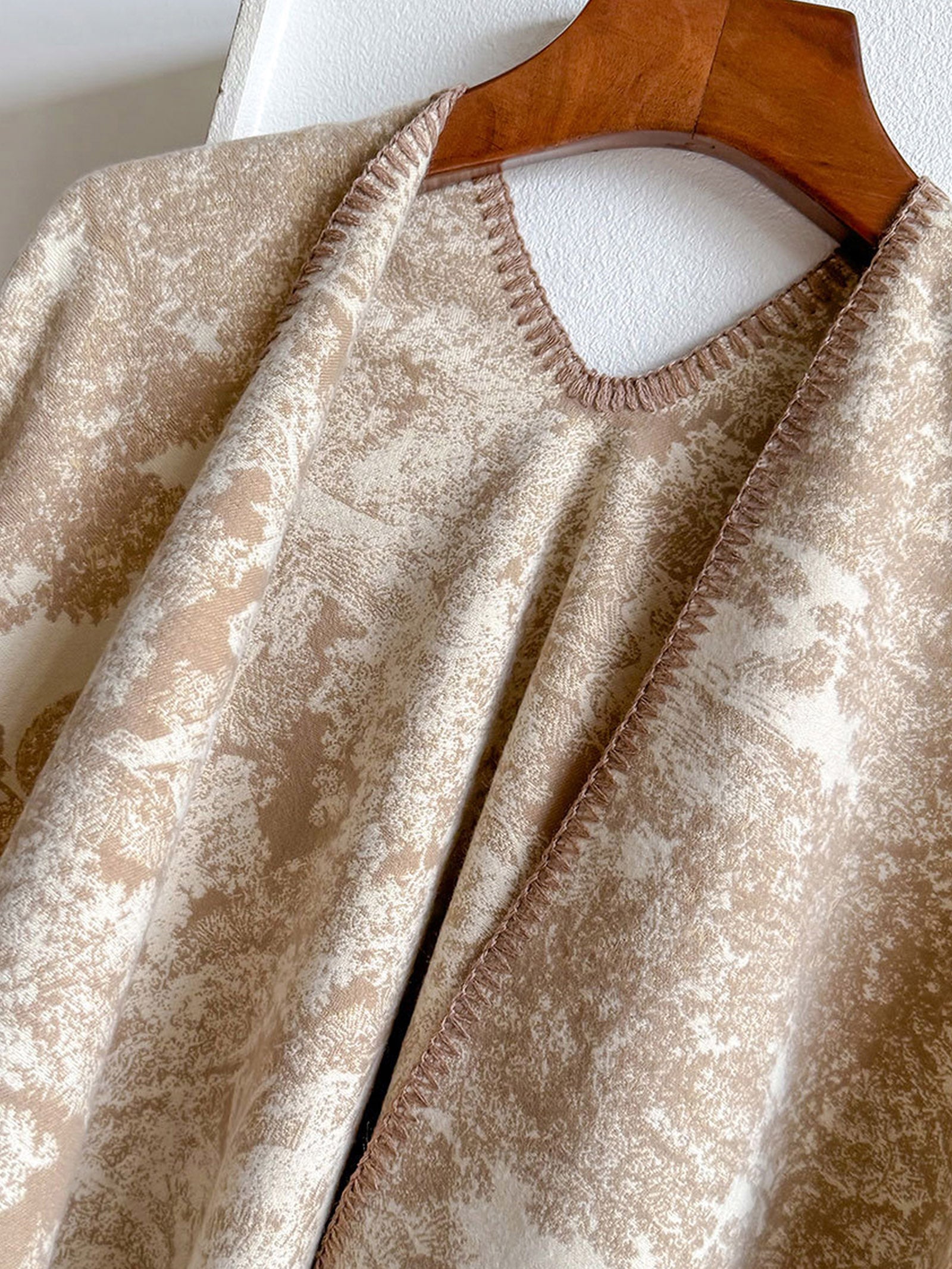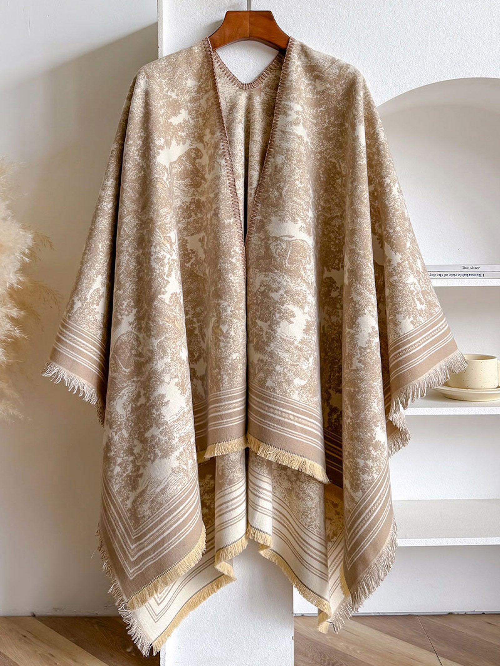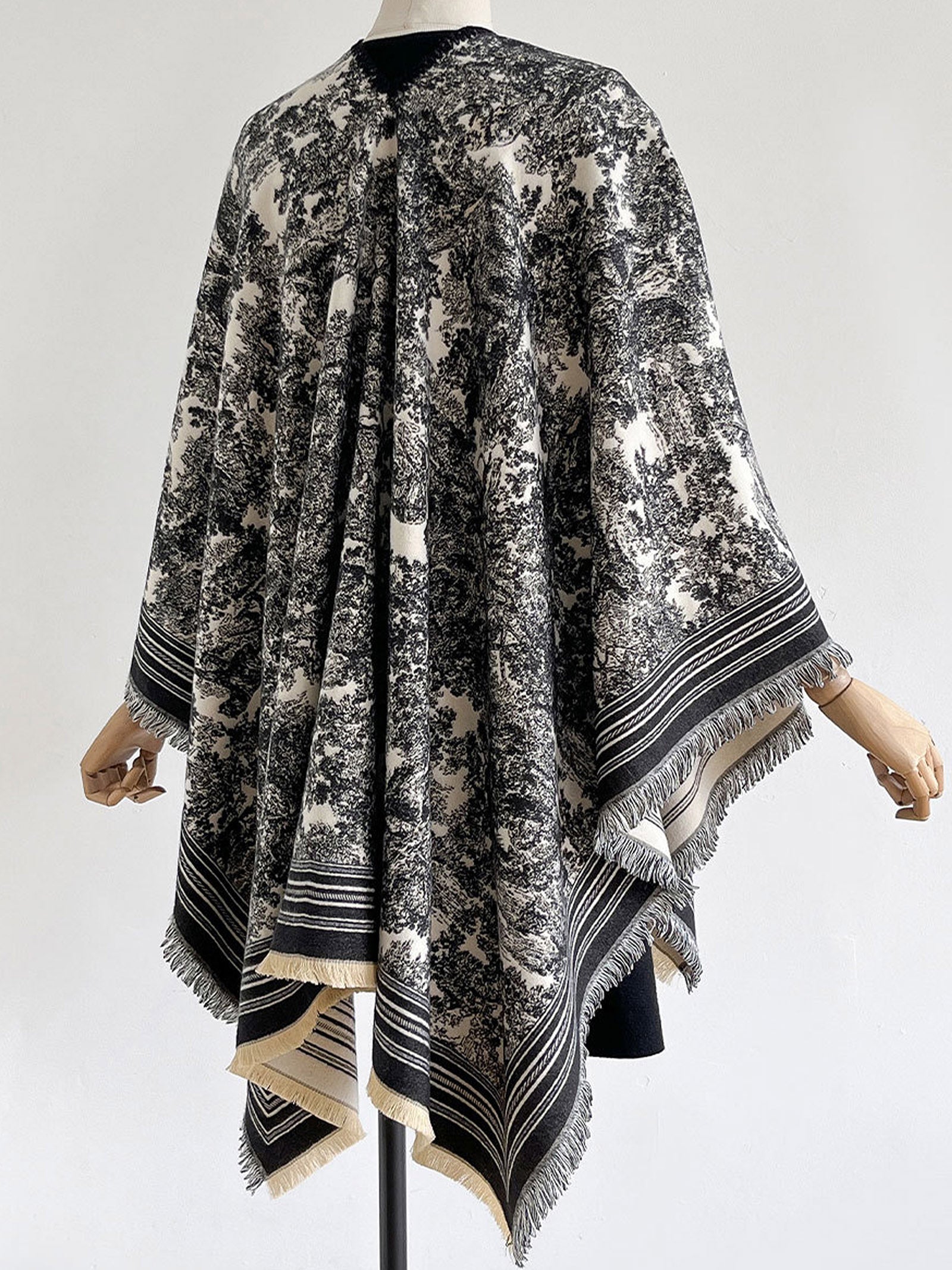 This scarf cape features delicate fringe details and intricate totem prints, exuding a unique artistic vibe. It boasts a soft and plush texture that wraps you in cozy warmth, with neat, precise edge stitching to prevent fraying. Measuring 145 ×130cm, it offers ample coverage for versatile styling as a scarf or cape.