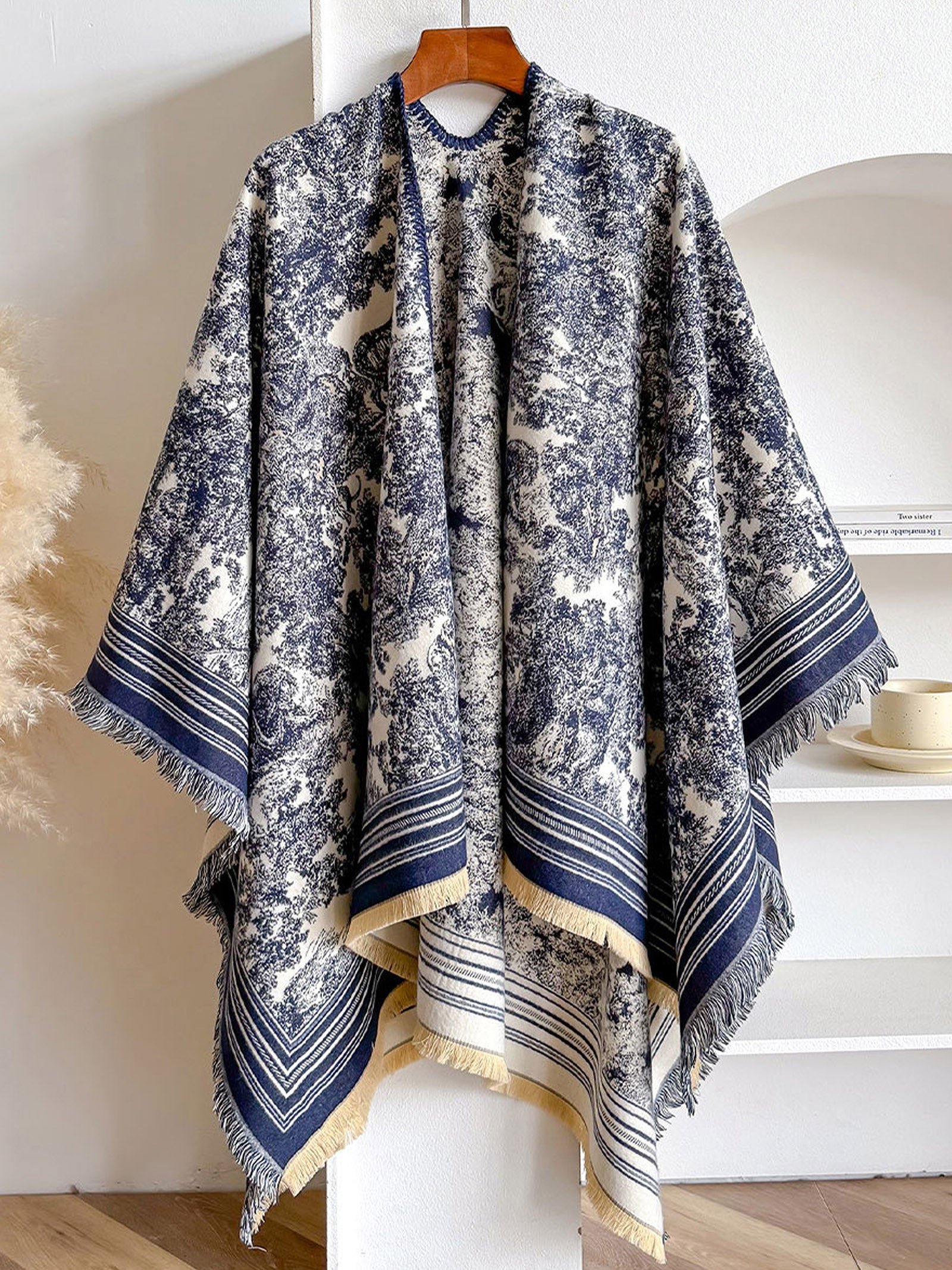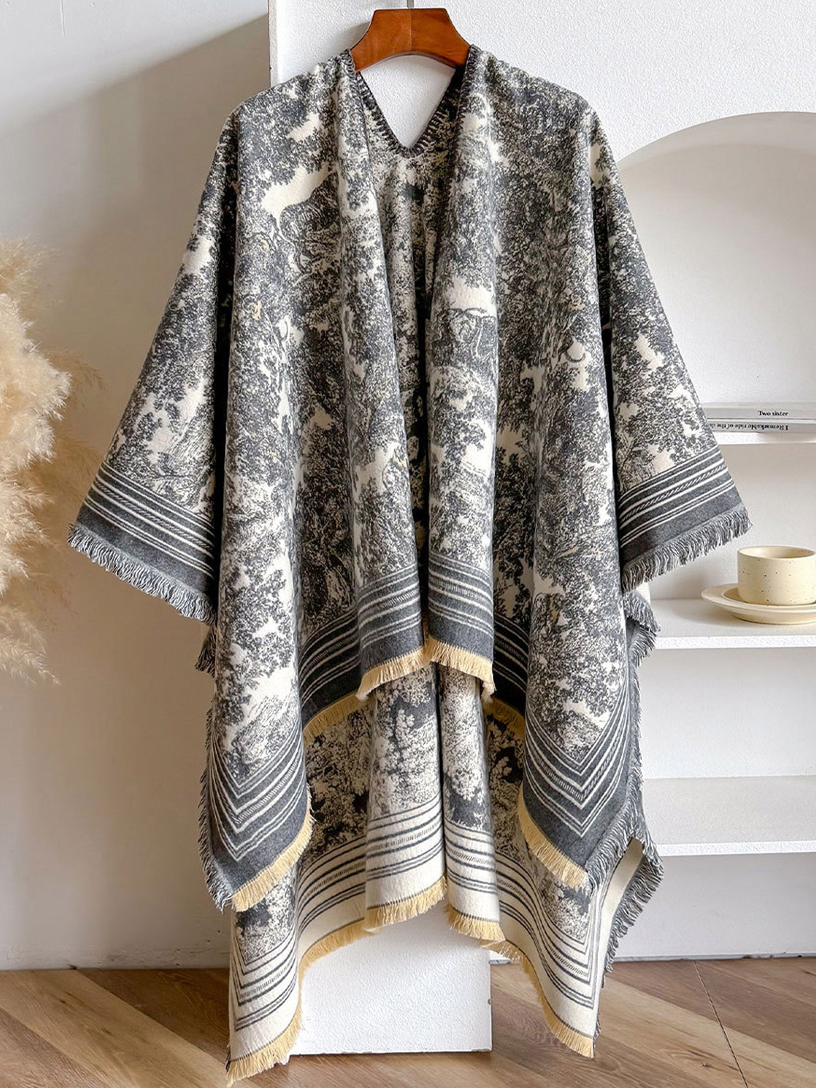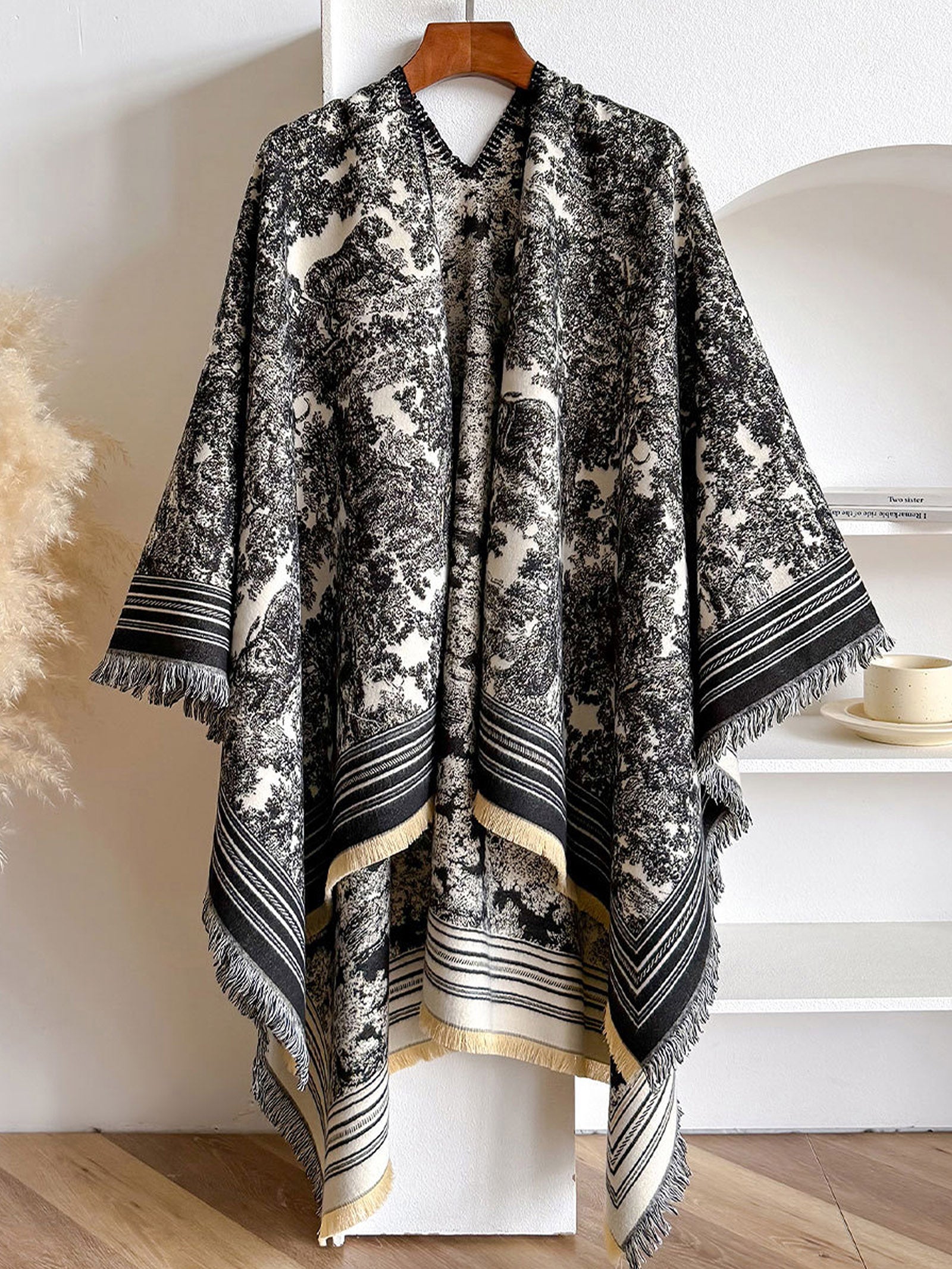 This scarf cape features delicate fringe details and intricate totem prints, exuding a unique artistic vibe. It boasts a soft and plush texture that wraps you in cozy warmth, with neat, precise edge stitching to prevent fraying. Measuring 145 ×130cm, it offers ample coverage for versatile styling as a scarf or cape.