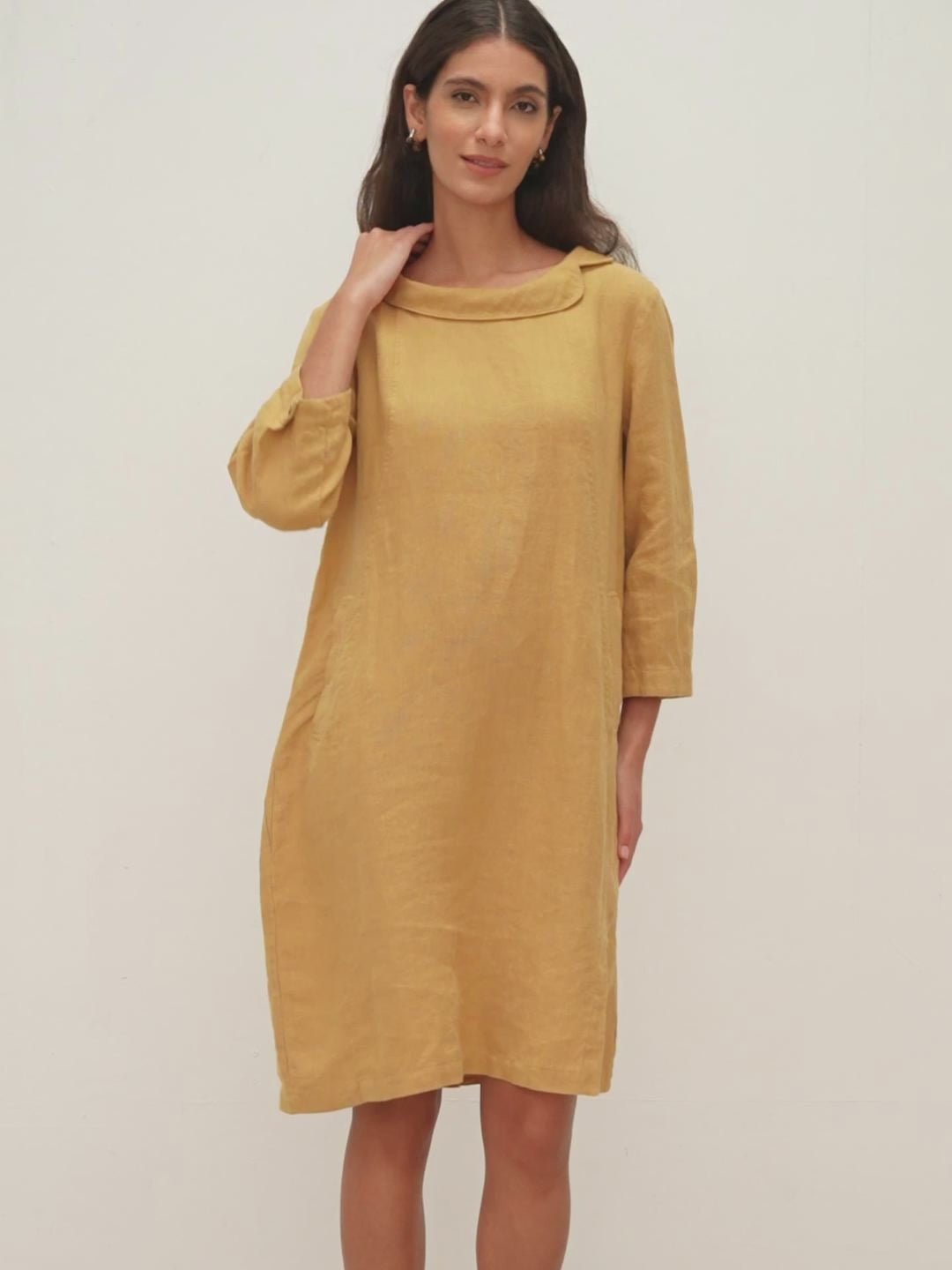 100% Linen Round Soft-Fold Collar Midi Dress DORALEE