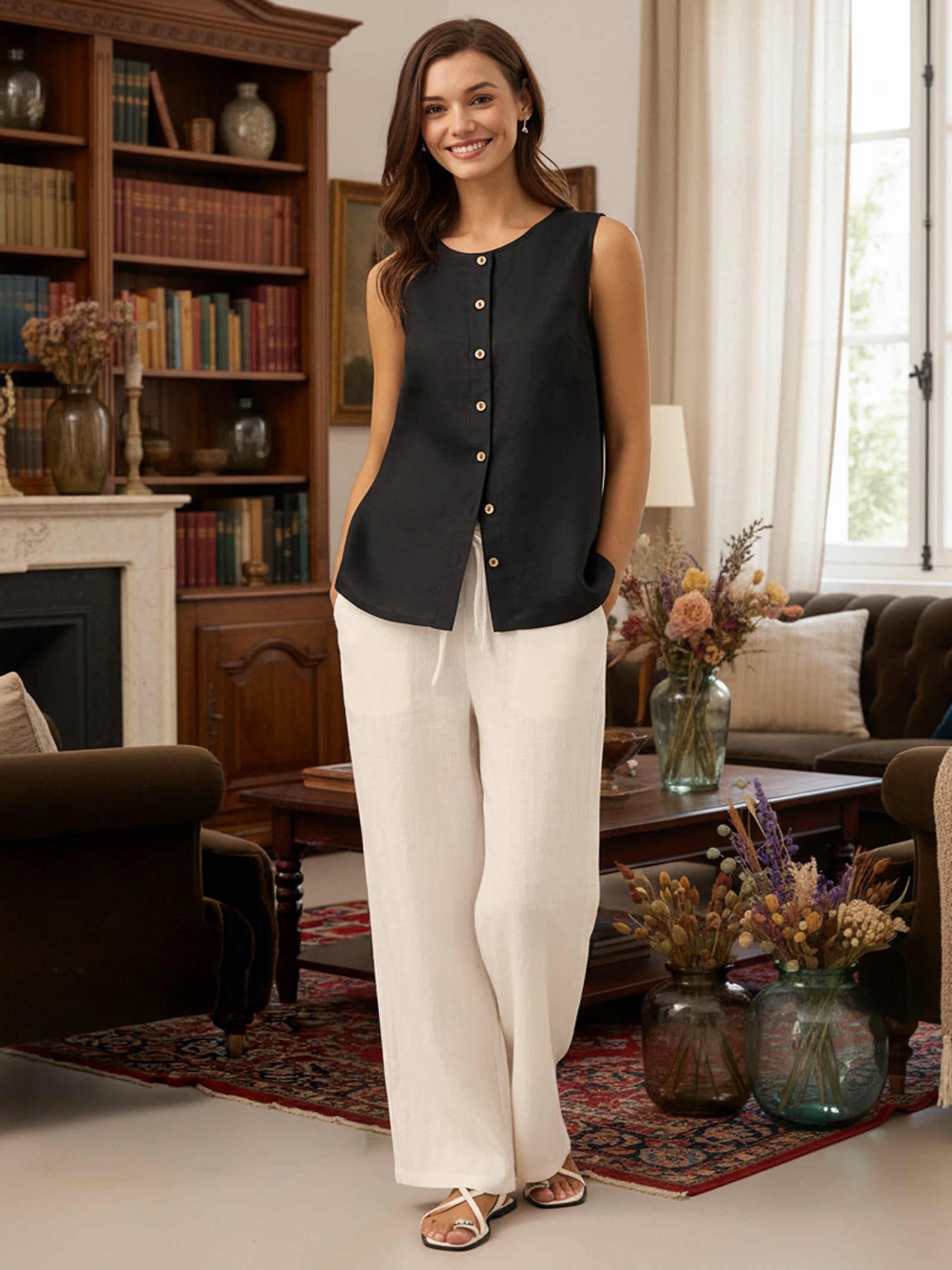 Linen Gingham Checked Round Soft-Fold Collar Top LAURA