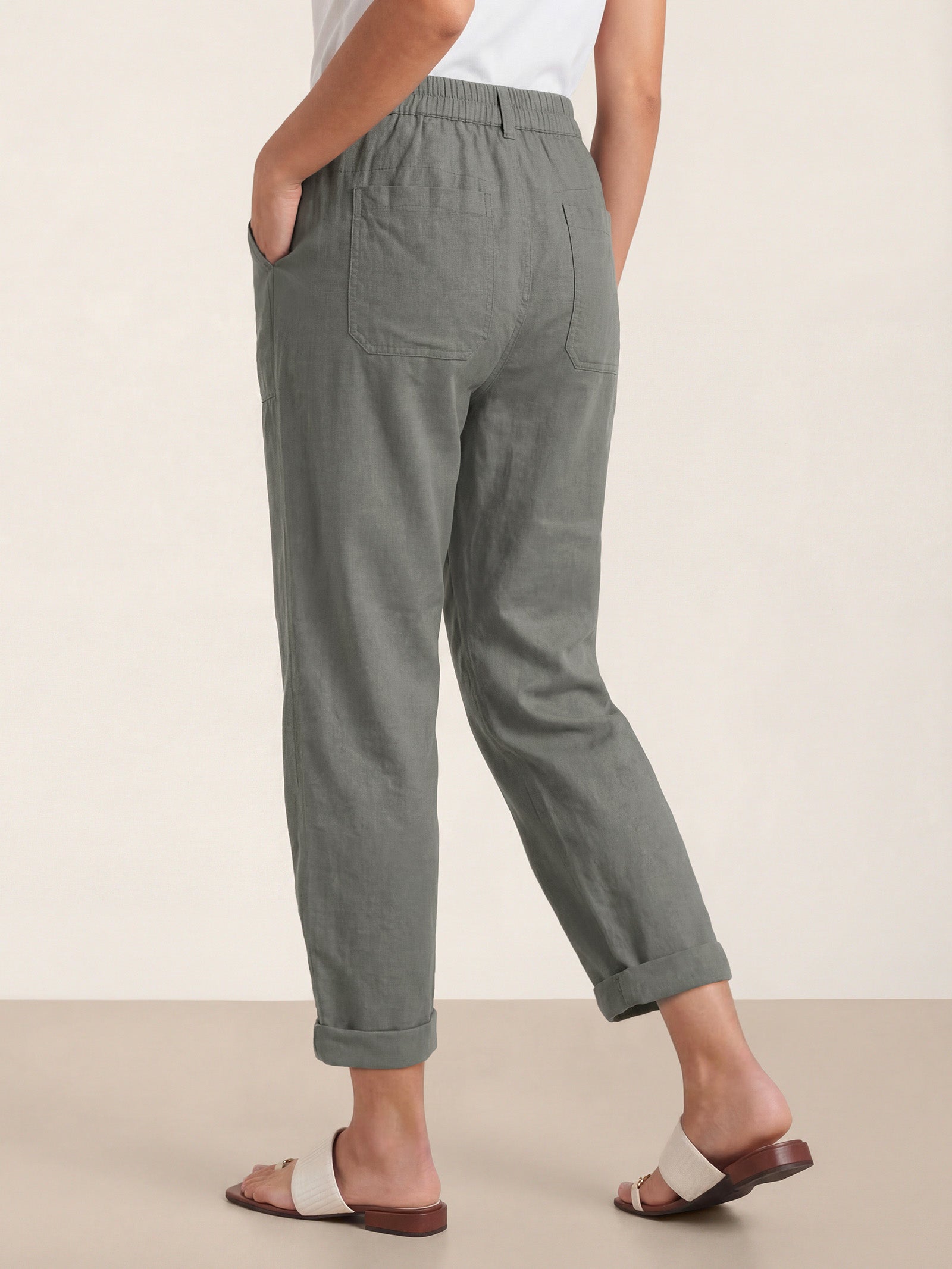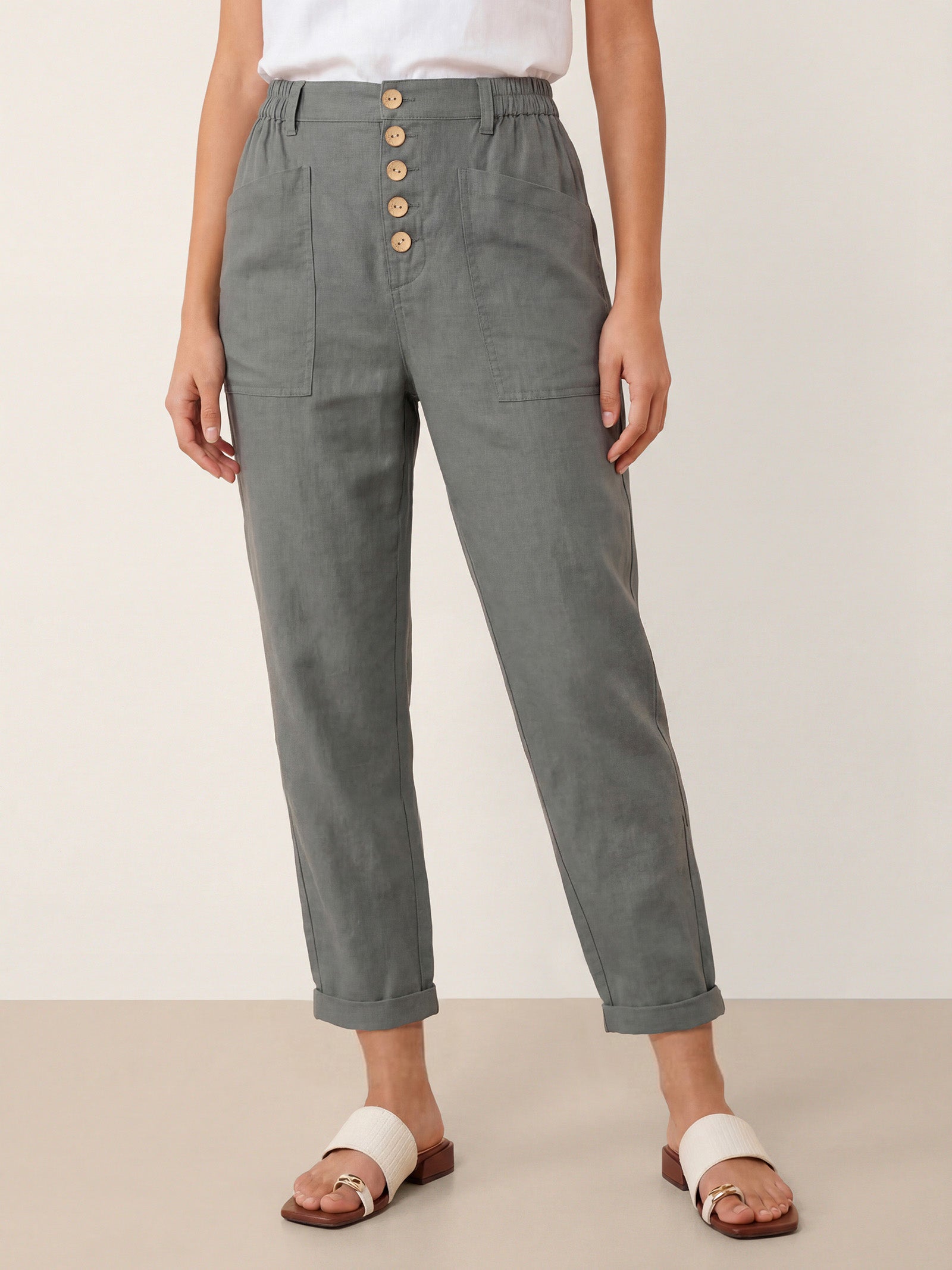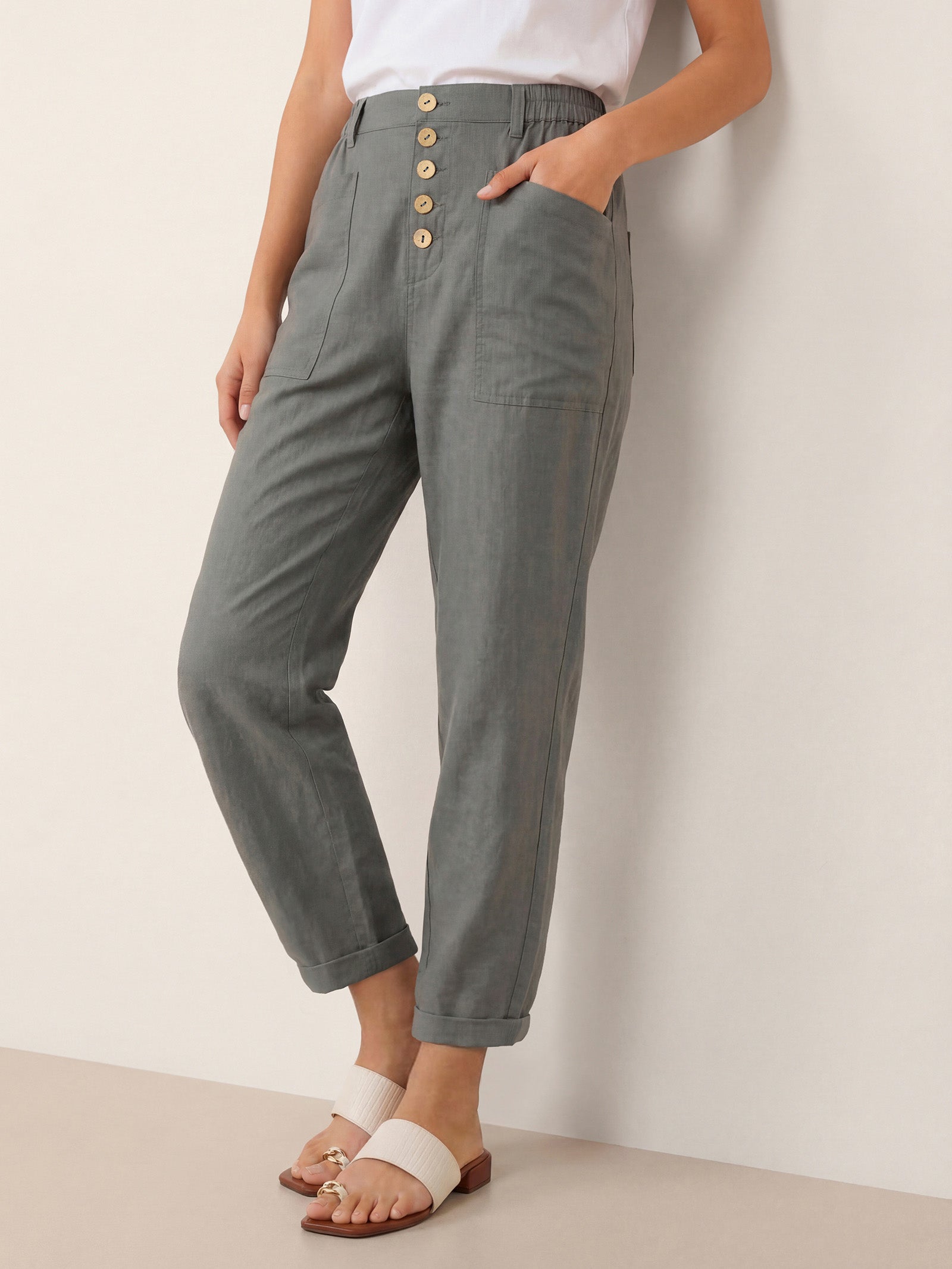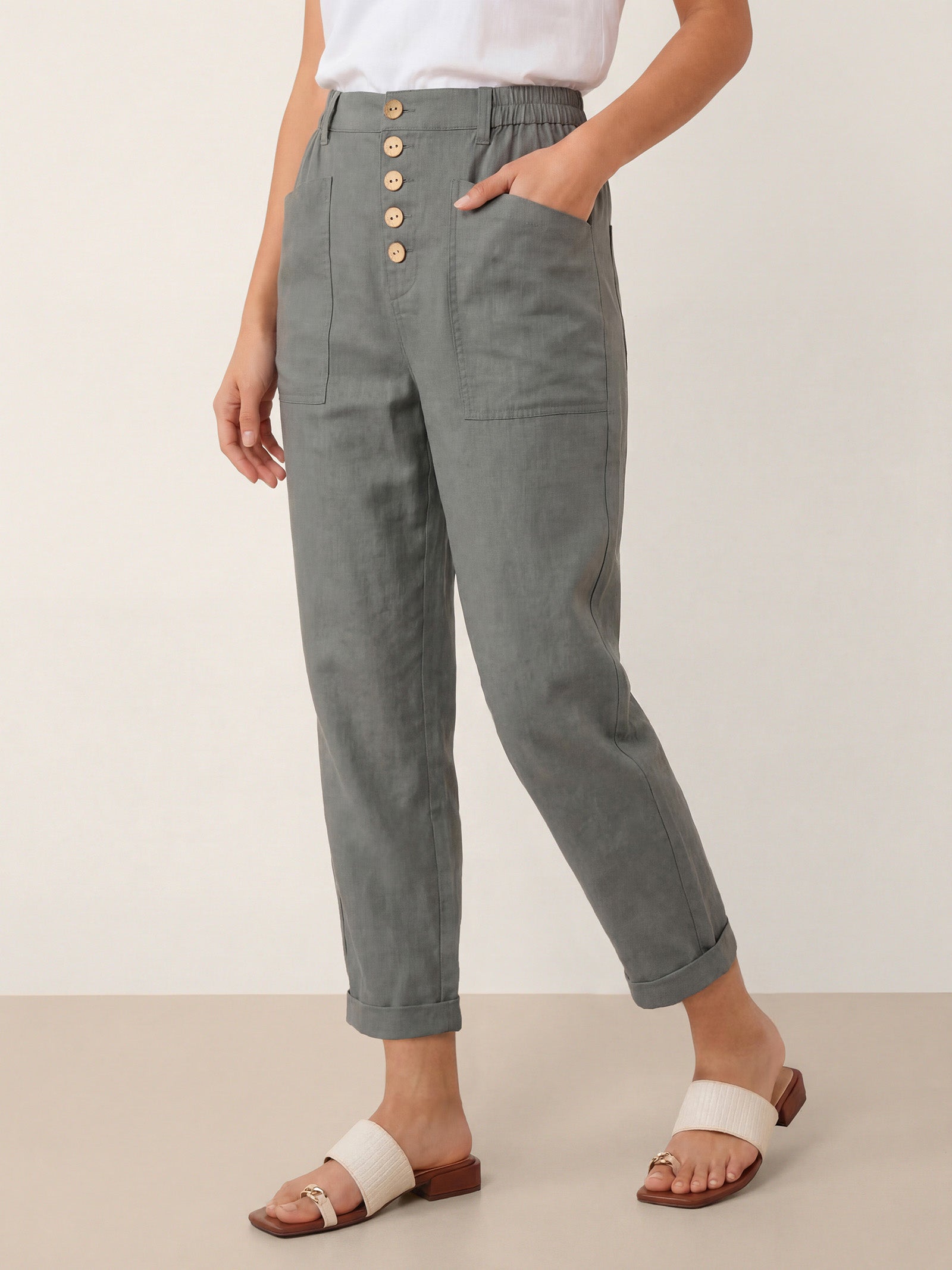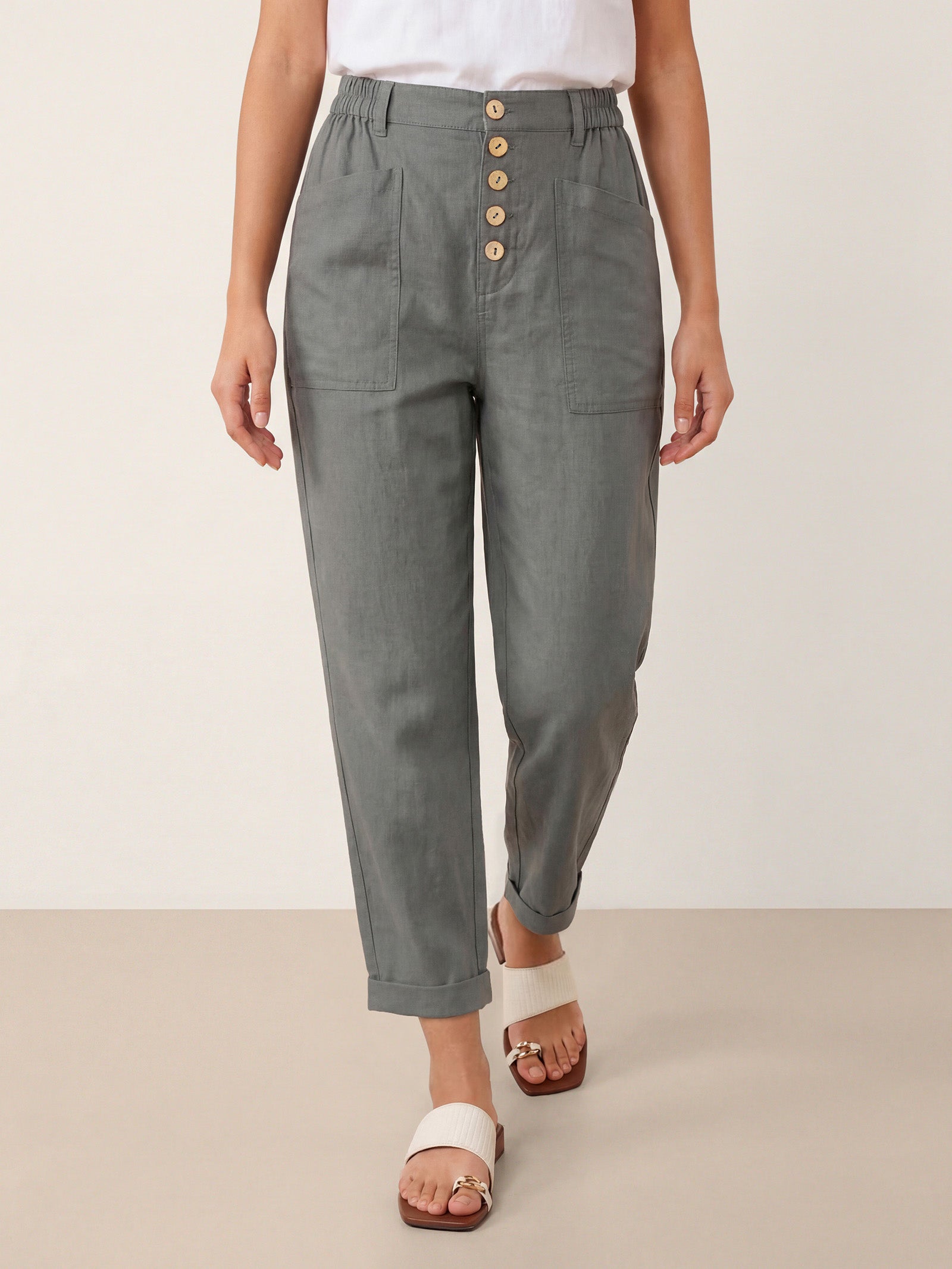 Asymmetric linen ease—modern lines, everyday comfort.