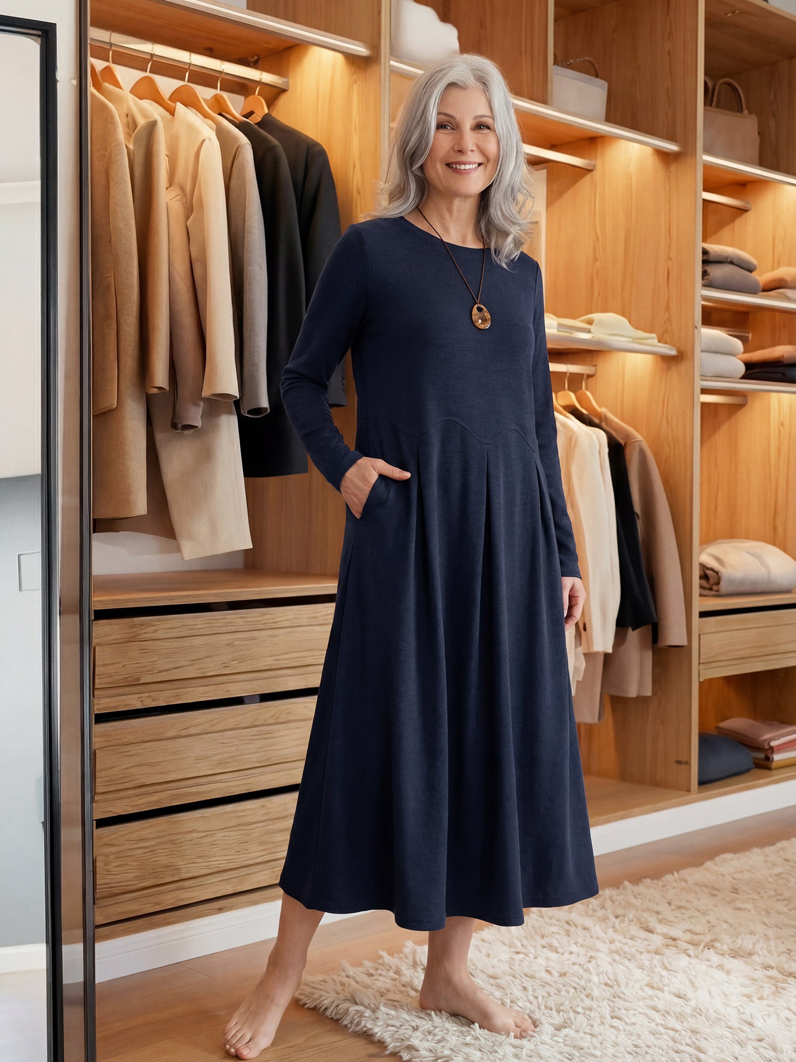 A Merino wool maxi dress that artfully drapes your silhouette with dimensional pleats and fluid curves, harmonizing timeless elegance with modern comfort for effortless all-day allure.