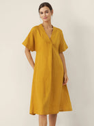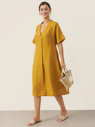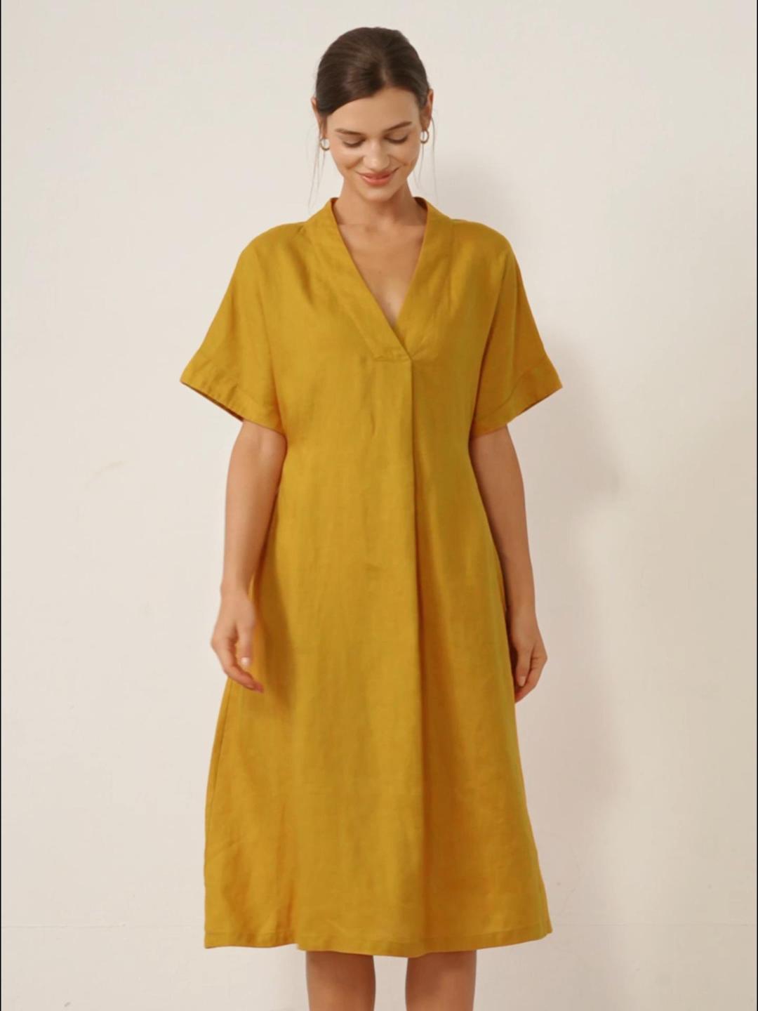 100% Linen V-Neck Tie-Waist Midi Dress BONNIE