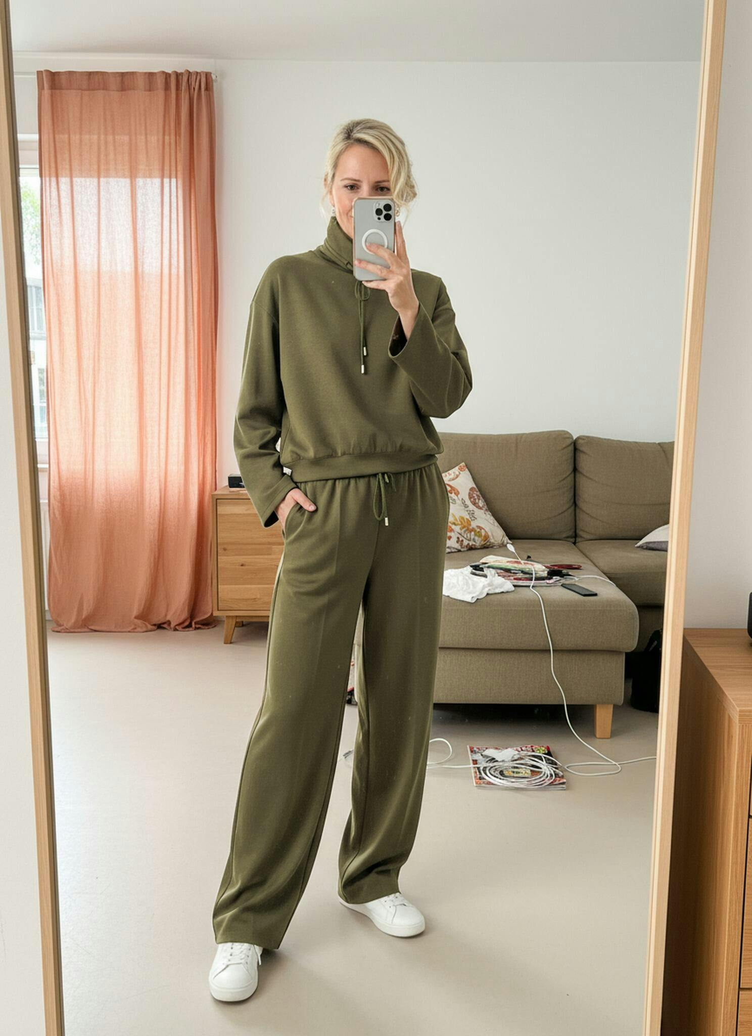 Softly embraces your silhouette in frost-defying comfort, this mossy green knit top blends relaxed elegance with adjustable drawstring detailing for effortless, cocoon-like warmth.