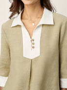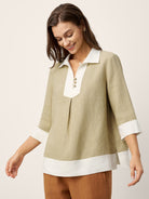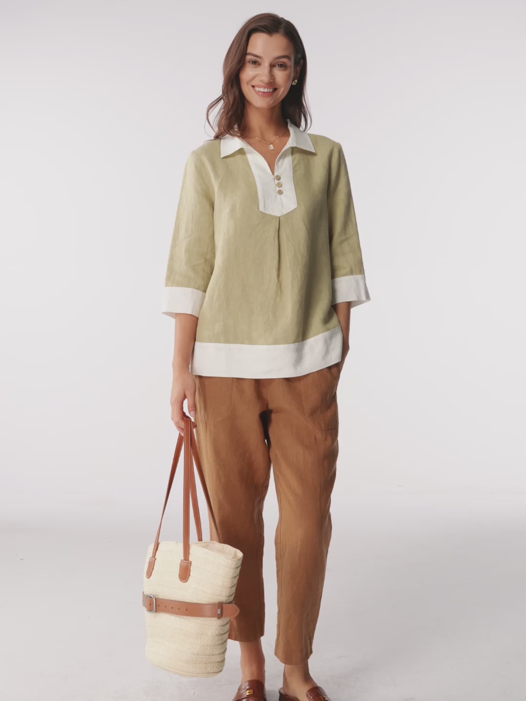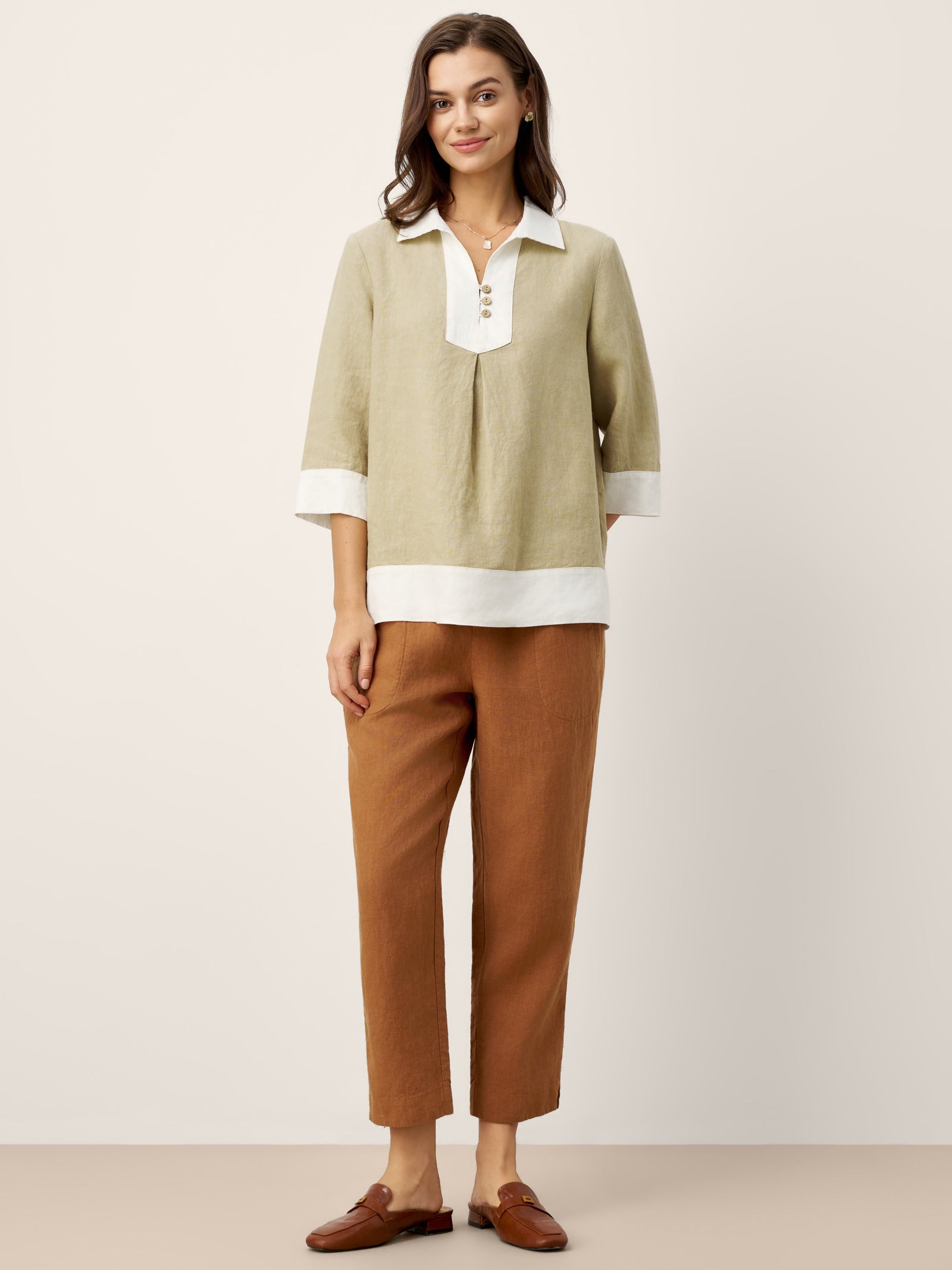 100% Linen Contrast Panel Lapel Sculpted Pleated Pullover Top VICTORIA