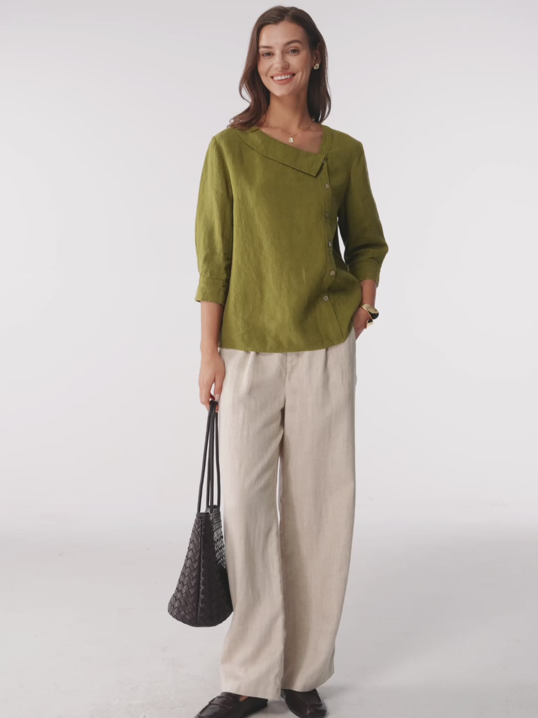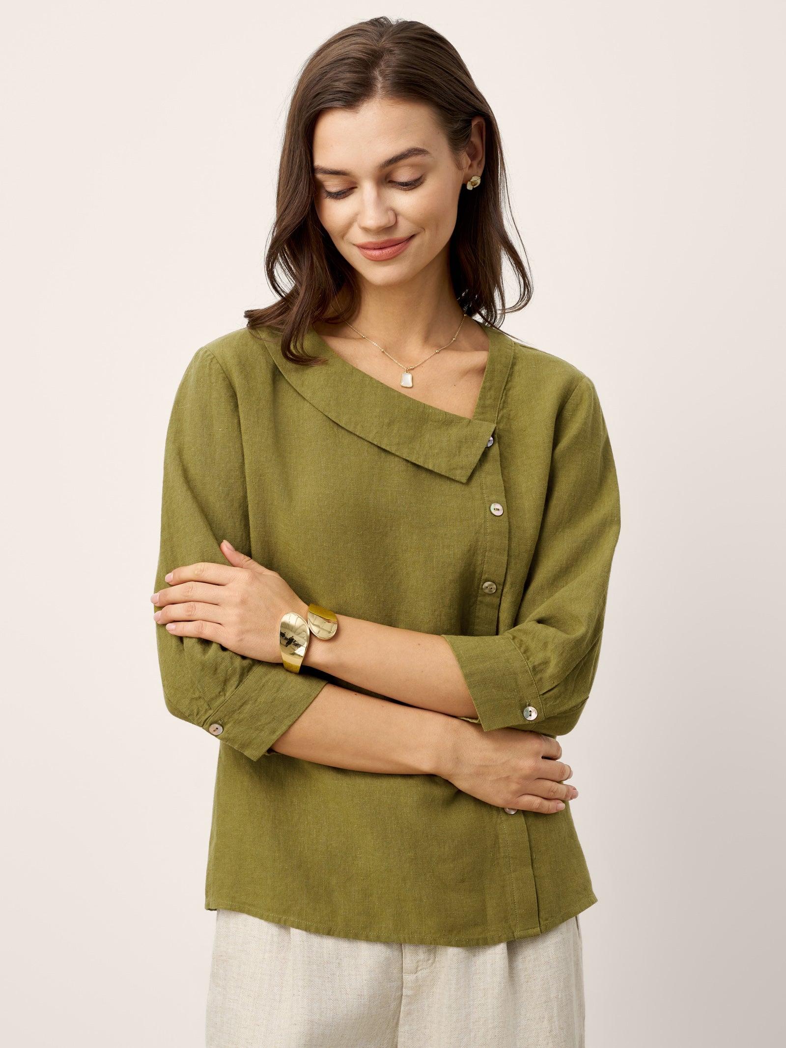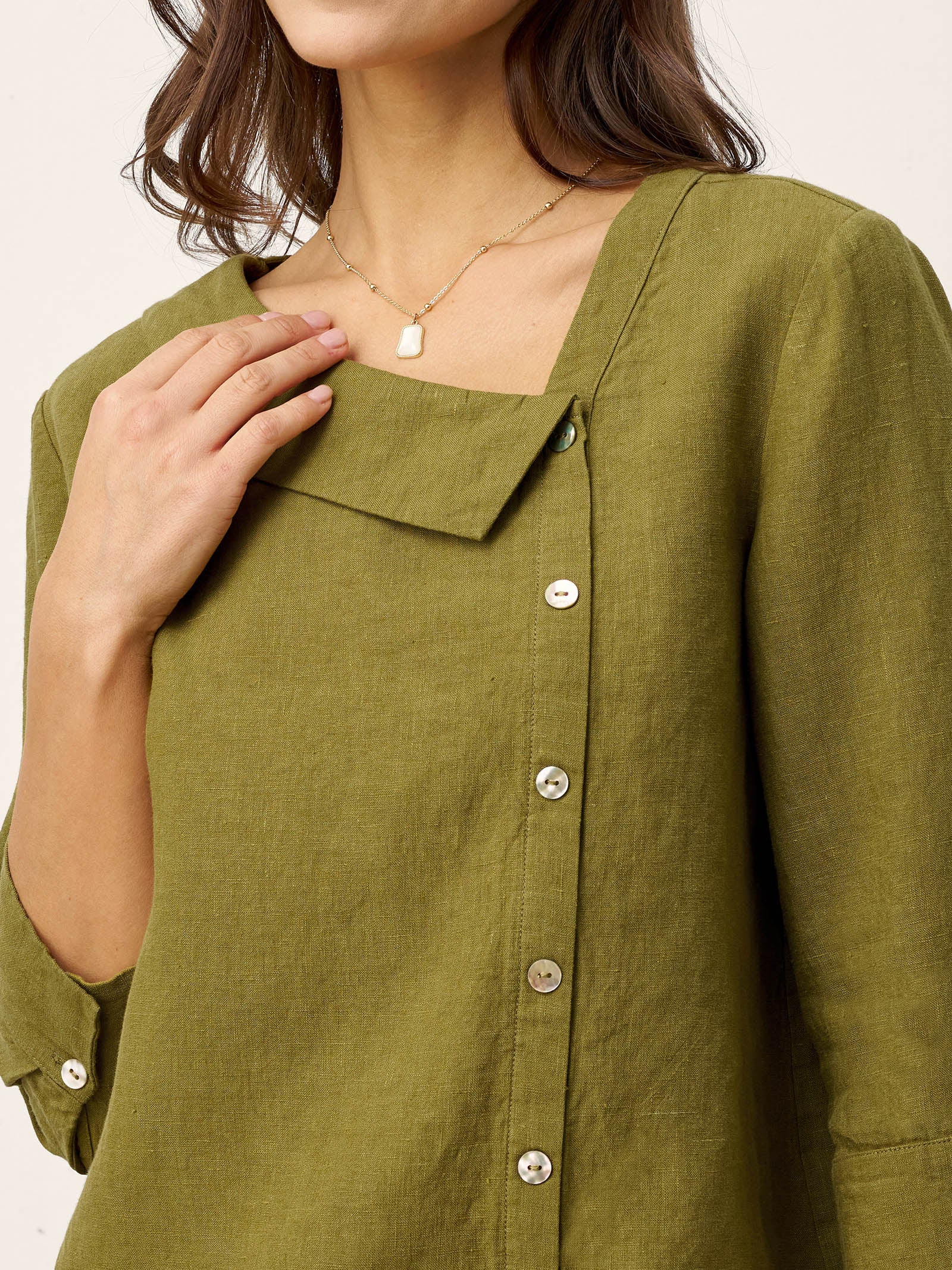 - Asymmetric Placket & Crescent Collar: Diagonal placket and soft curved collar balance proportions and elegantly frame the neckline.