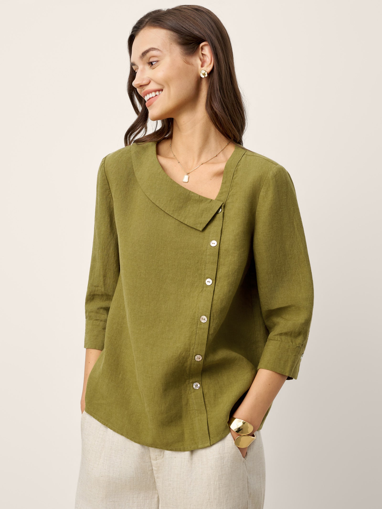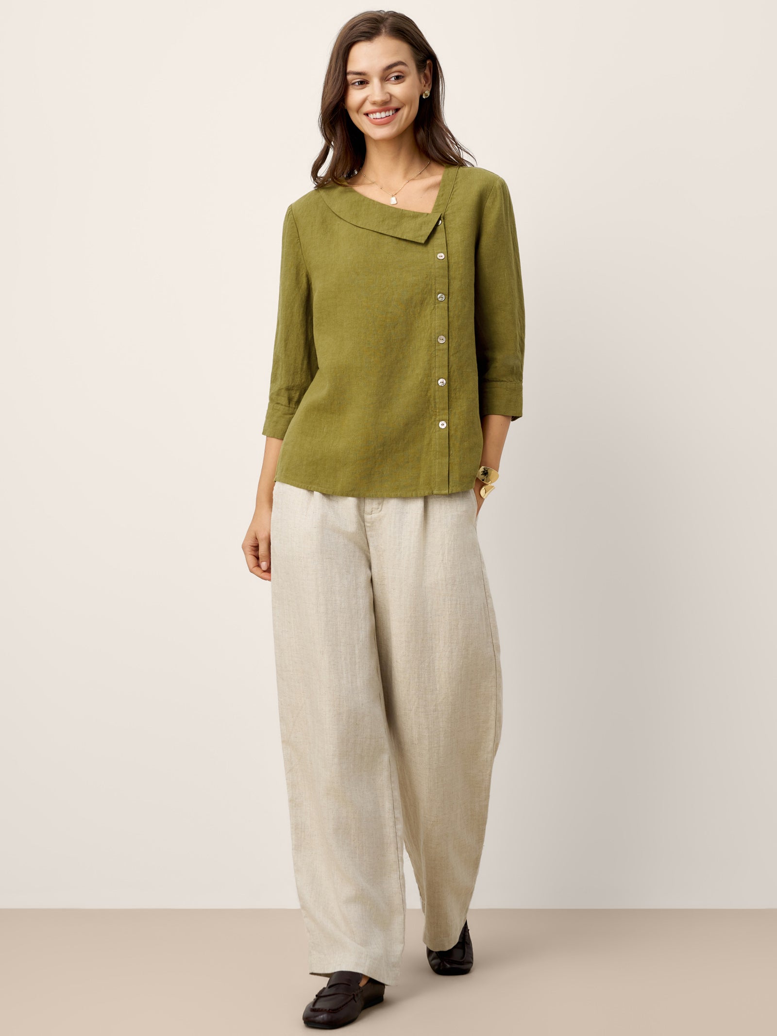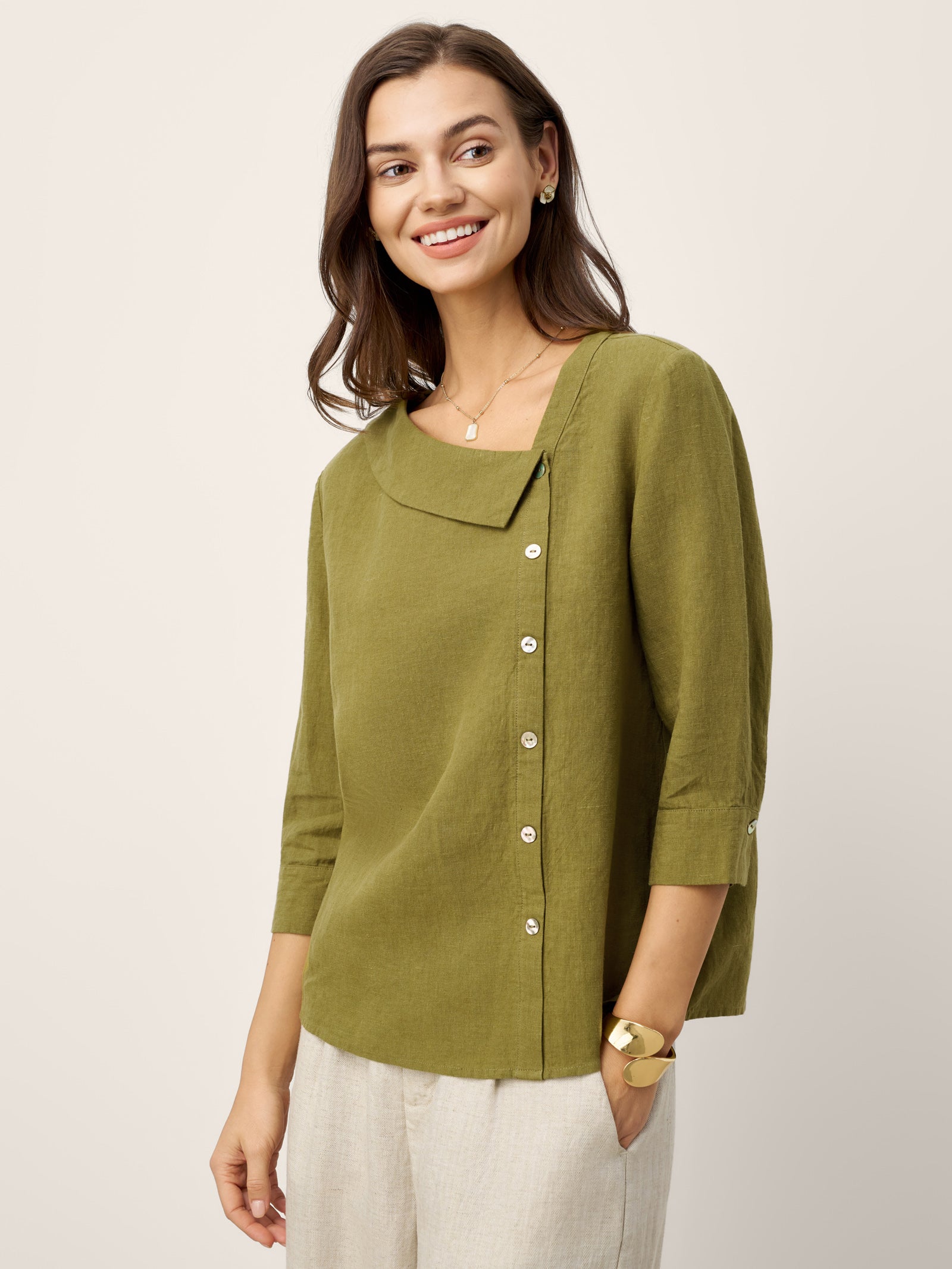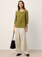 100% Linen Crescent Neck Button Detail 3/4 Sleeve Top ADALYN
