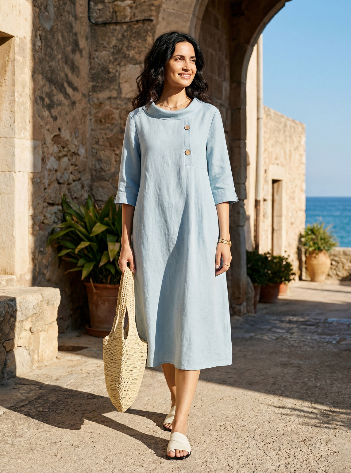 100% Linen Rolled Collar Asymmetric PlacketMaxi Dress ELARAINE