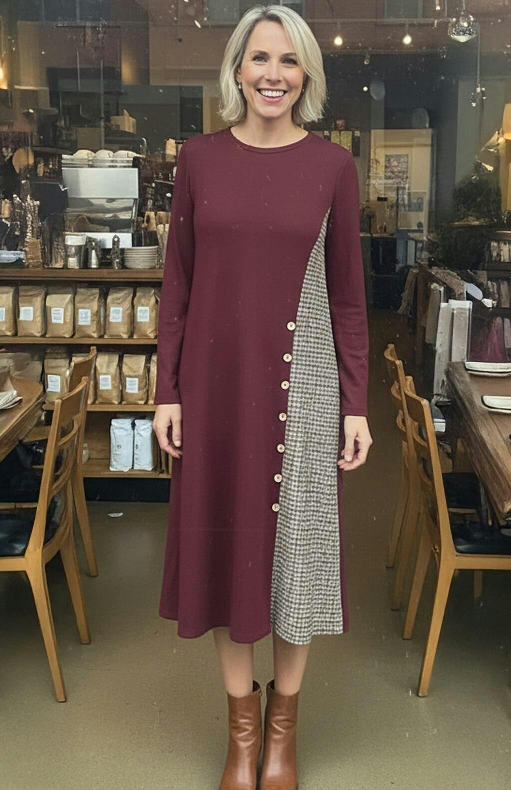 Embrace artistic contrast ALIA Midi Dress, where fluid wool-knit meets structured plaid in an asymmetrical dance that sculpts your silhouette with tactile luxury and poetic motion.