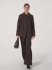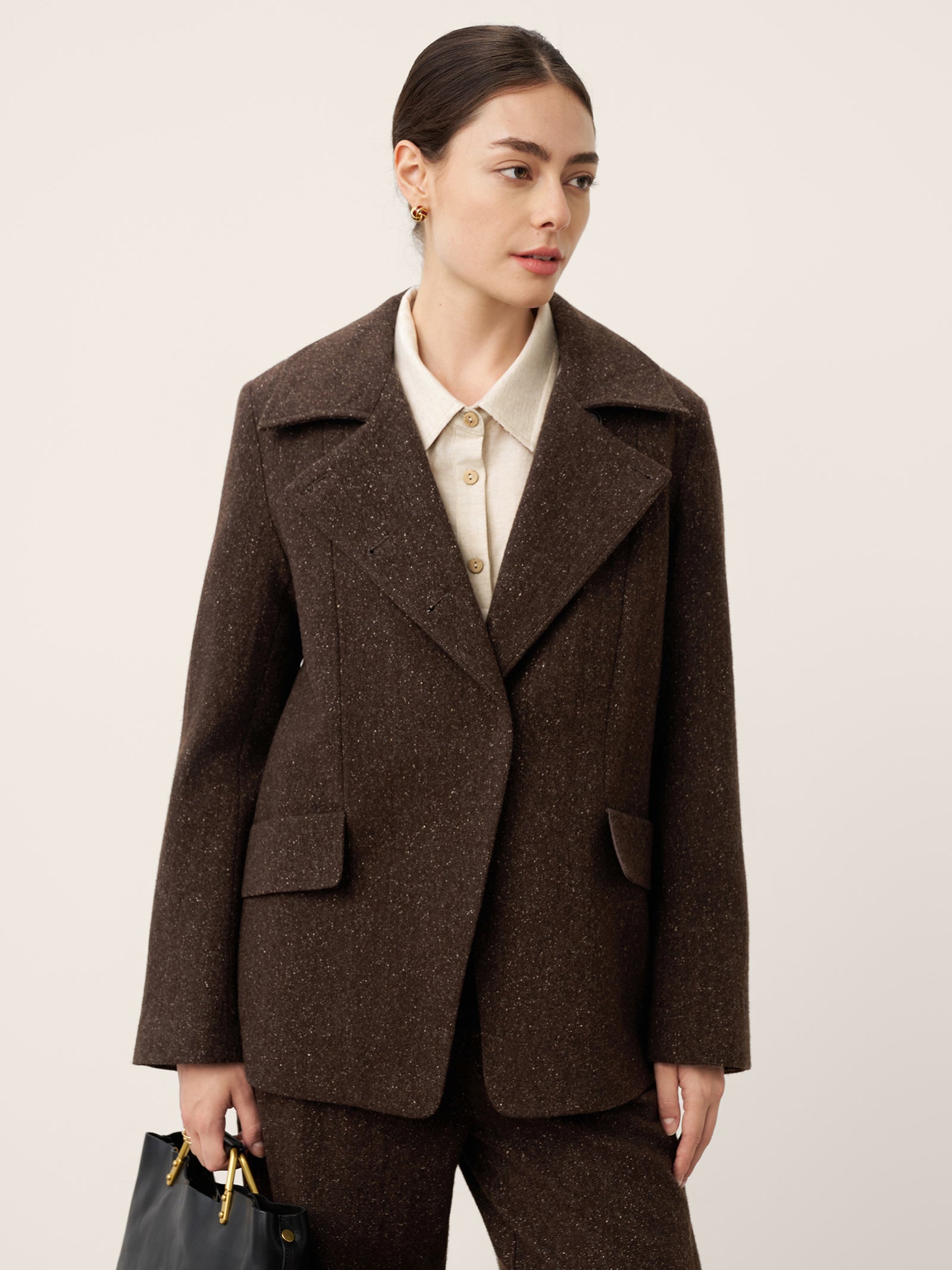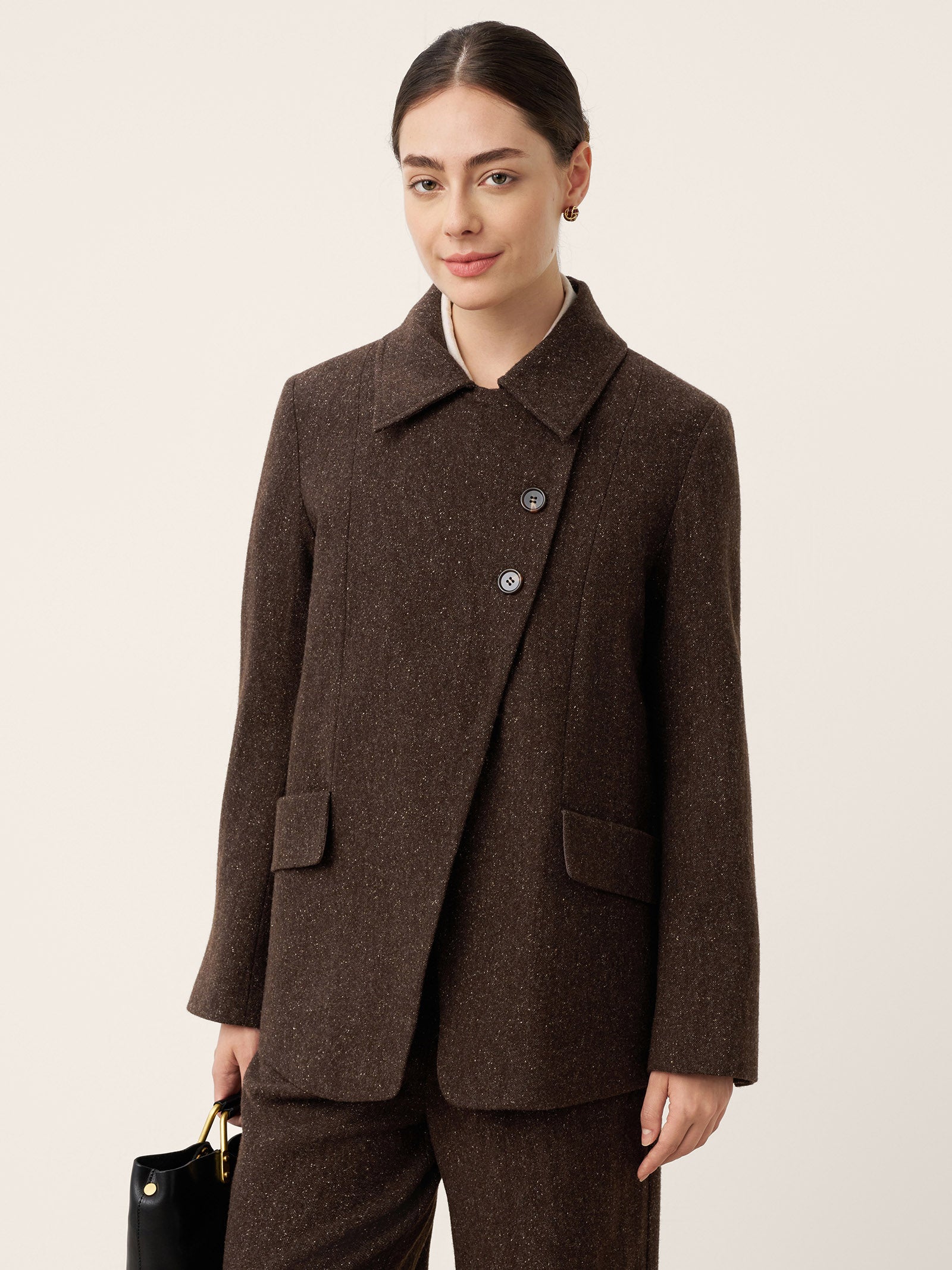 A wool-silk blend jacket with a contemporary twist, blending double-breasted structure and asymmetric design for refined versatility.