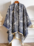 This scarf cape features delicate fringe details and intricate totem prints, exuding a unique artistic vibe. It boasts a soft and plush texture that wraps you in cozy warmth, with neat, precise edge stitching to prevent fraying. Measuring 145¡Á130cm, it offers ample coverage for versatile styling as a scarf or cape.