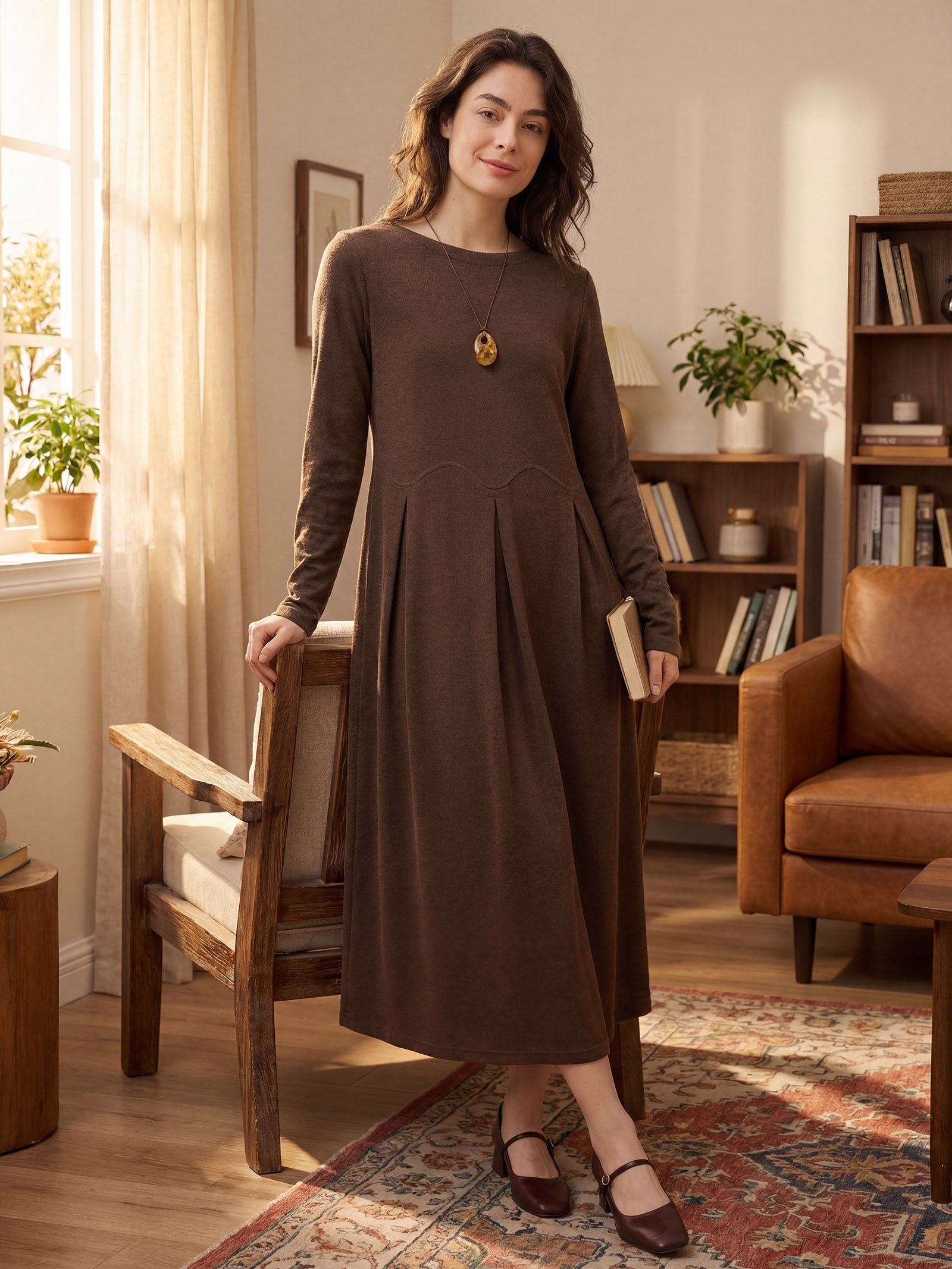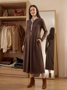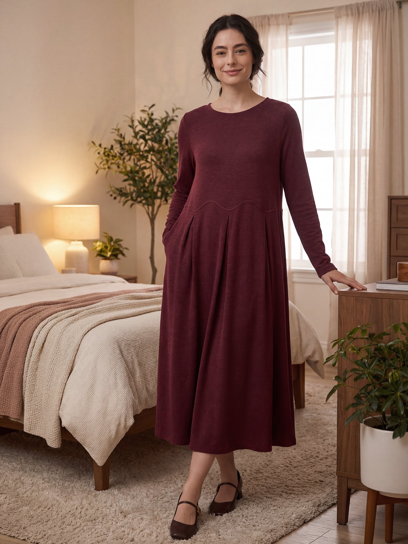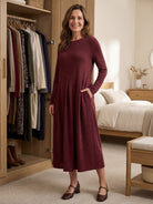 A Merino wool maxi dress that artfully drapes your silhouette with dimensional pleats and fluid curves, harmonizing timeless elegance with modern comfort for effortless all-day allure.