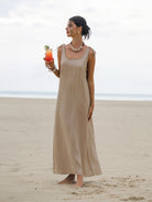 Discover the allure of intricate details in our linen maxi dress. From the charming shoulder butterfly tie straps to the alluring deep V-back design, every element showcases the beauty in every aspect.