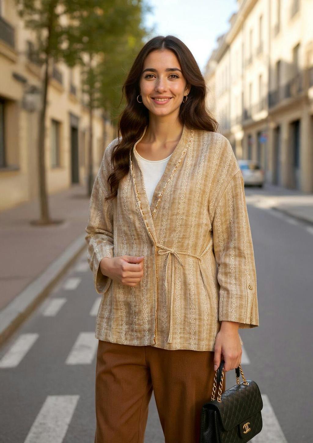 This jacket wraps you in unique jacquard fabric and artisanal detailing, while functional elements like adjustable ties and split cuffs bring bohemian charm to every casual or dressed-up moment.