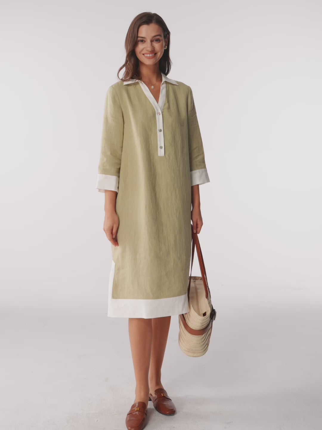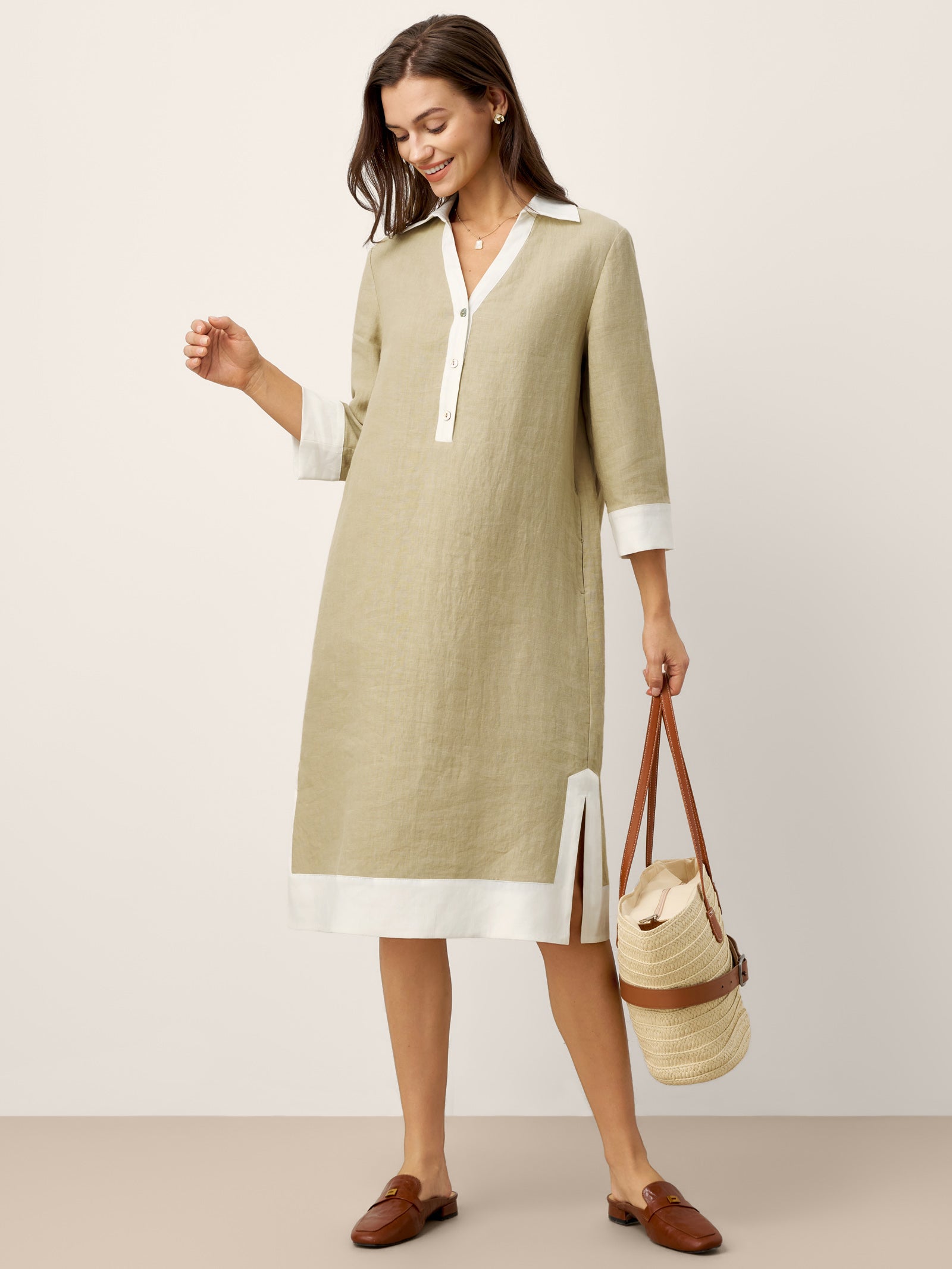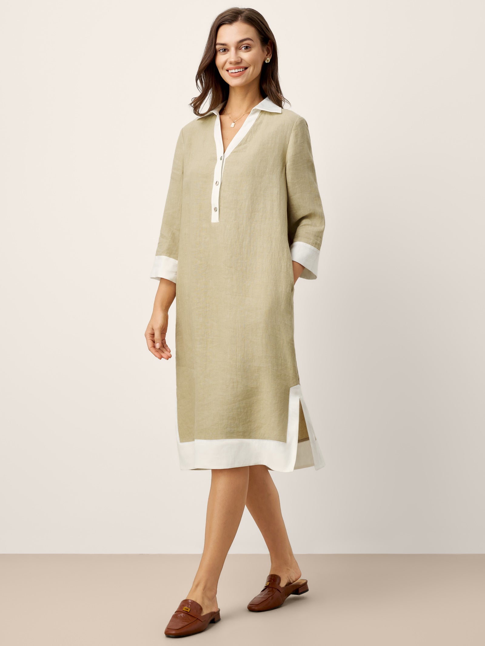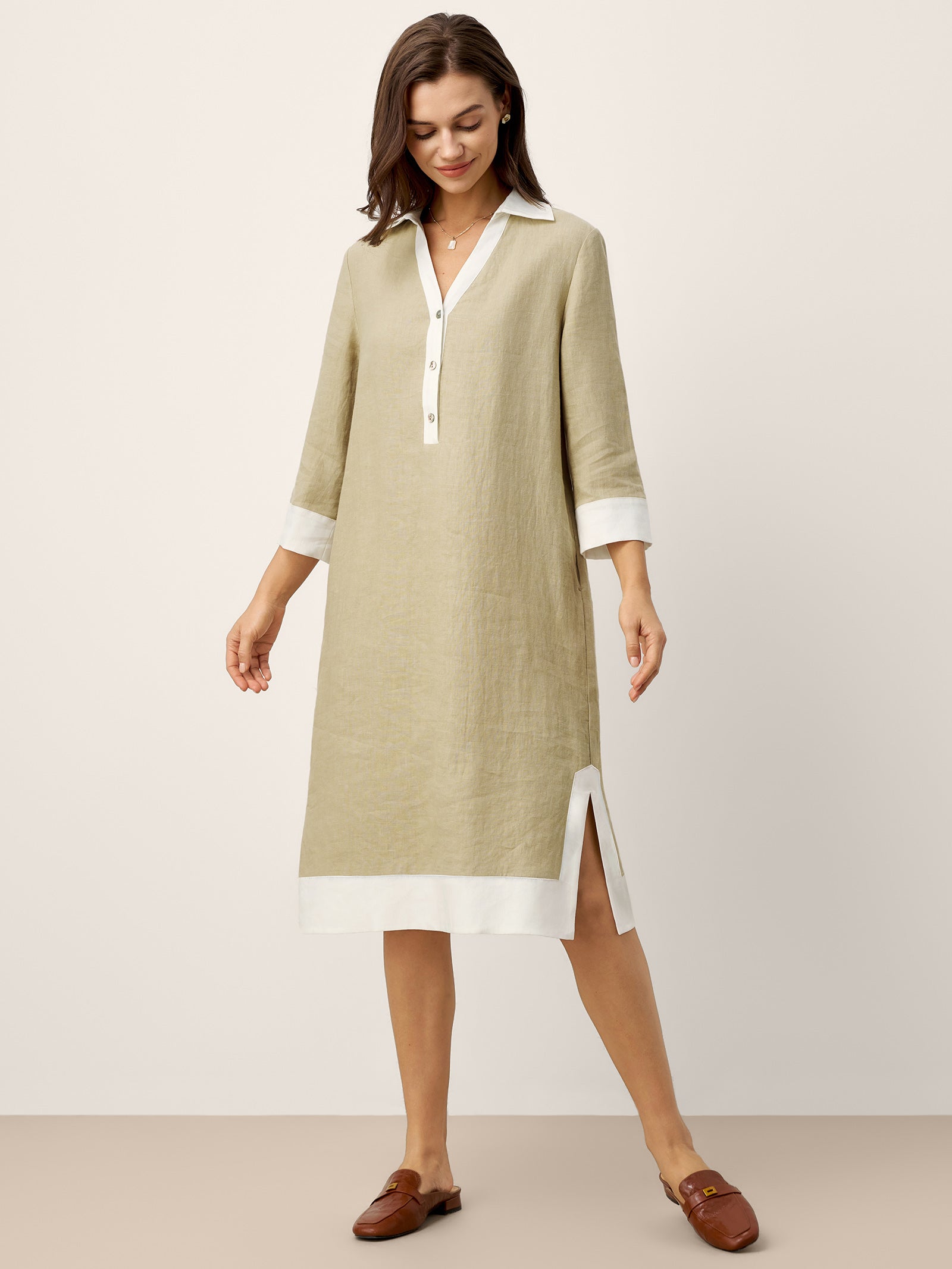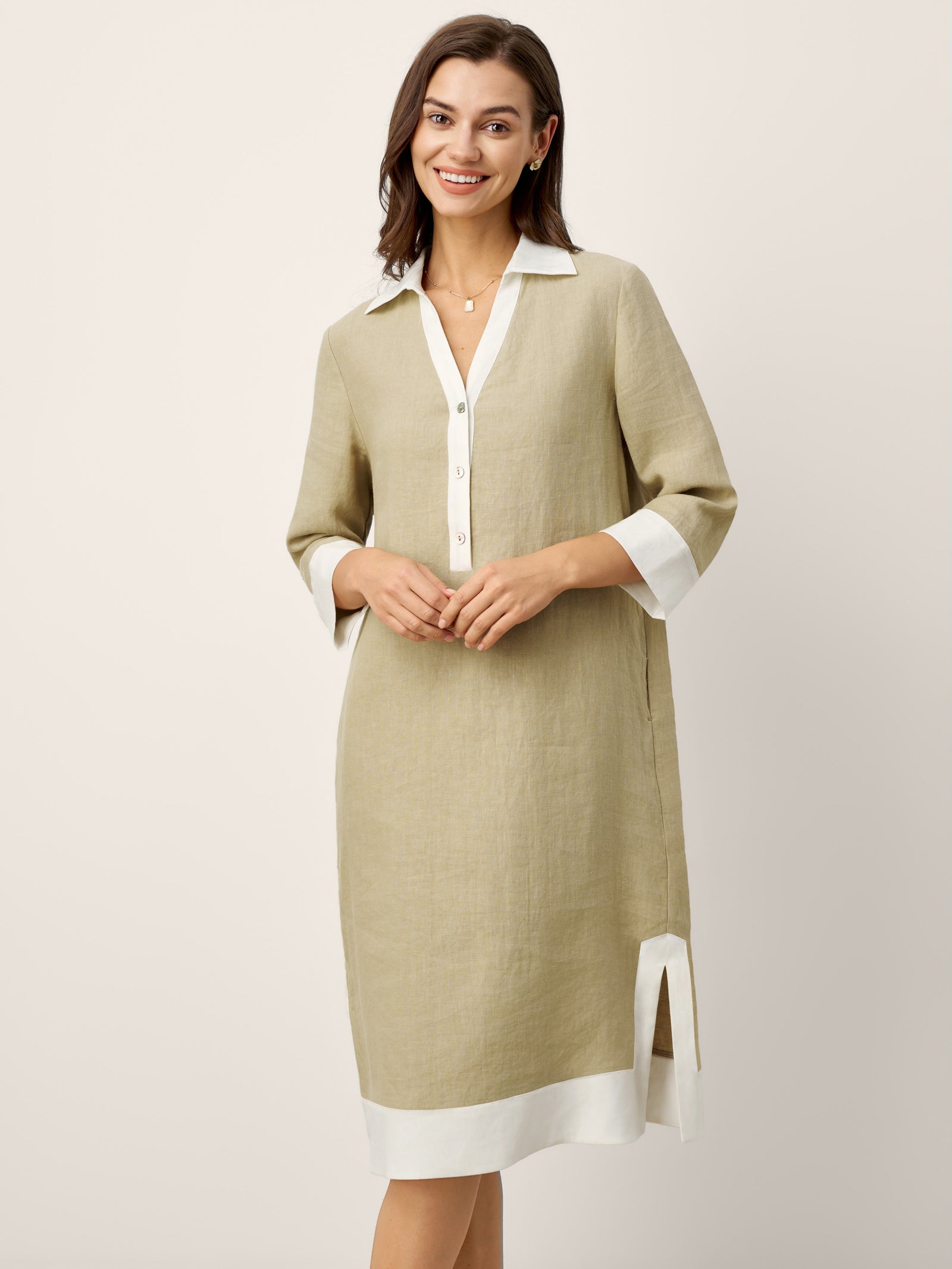 100% Linen Contrast Panel V-neck Layered Lapel Midi Shirt Dress PERSEPHONE