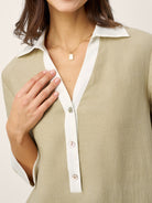- Contrast Trim Details: White placket, collar, cuffs, and hem add visual lightness and a polished finish.