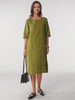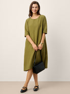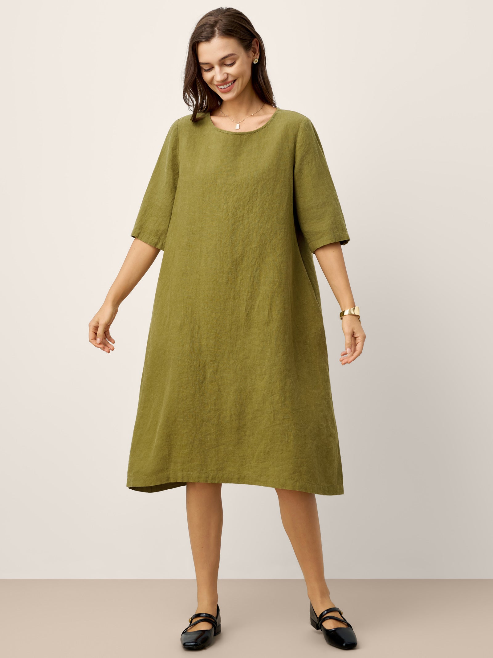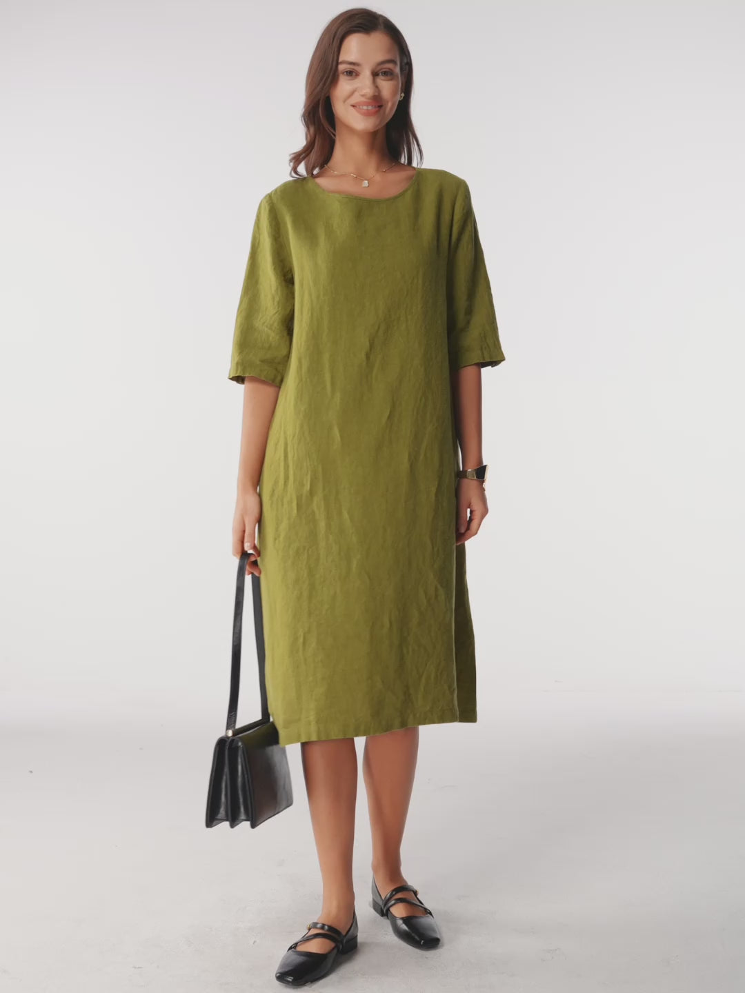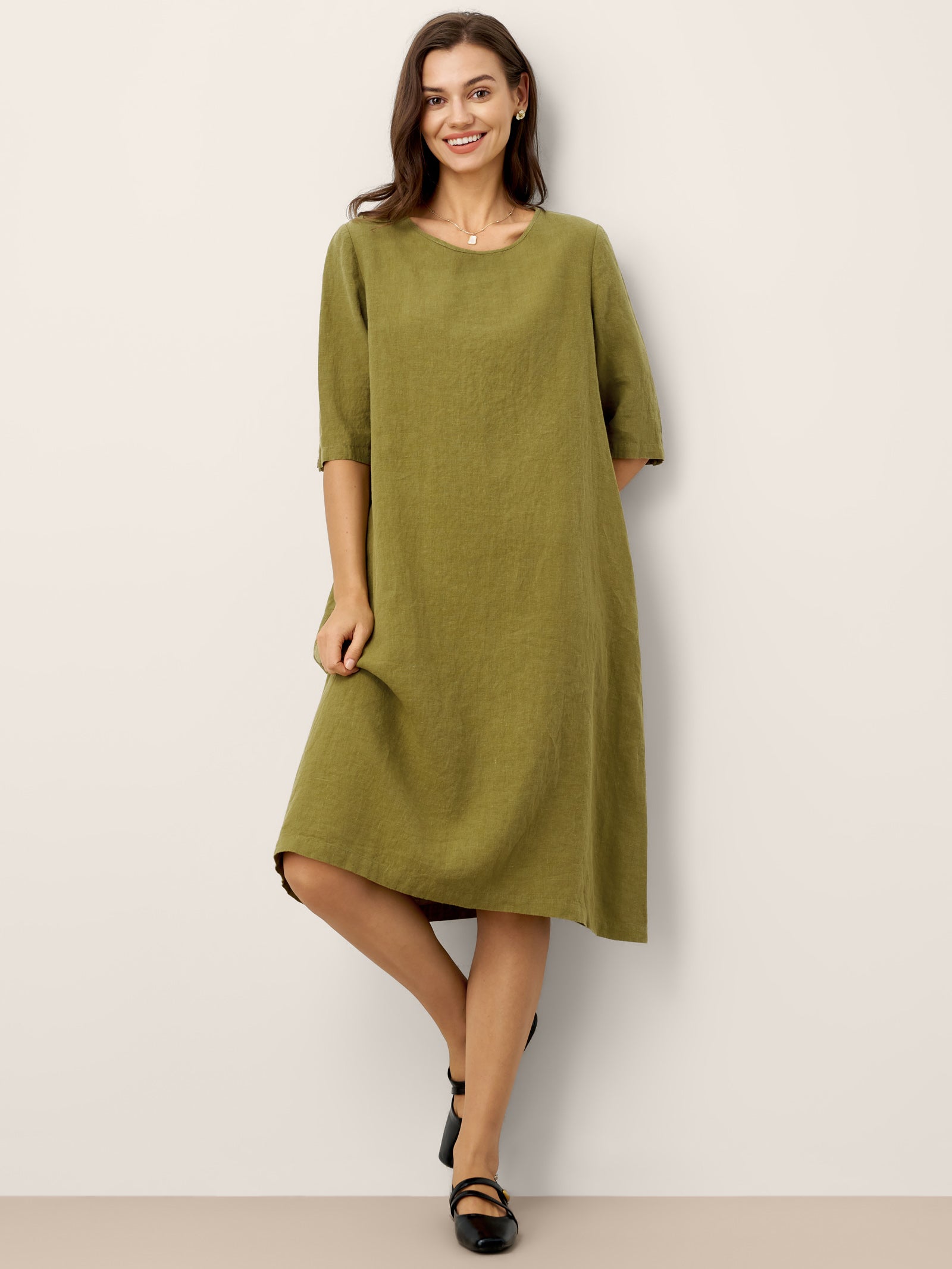 100% Linen Round Neck Back Placket Pleat Midi Dress PENELOPE