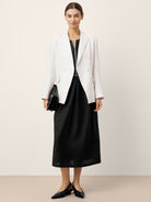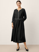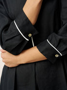 - Contrast Trim: White edging at the neckline, waist, and cuffs adds polish and lifts the black base.