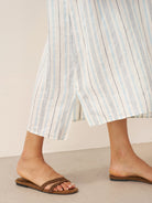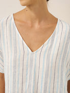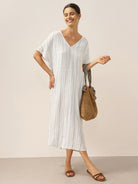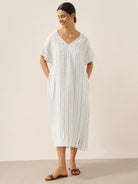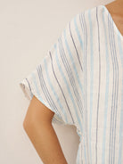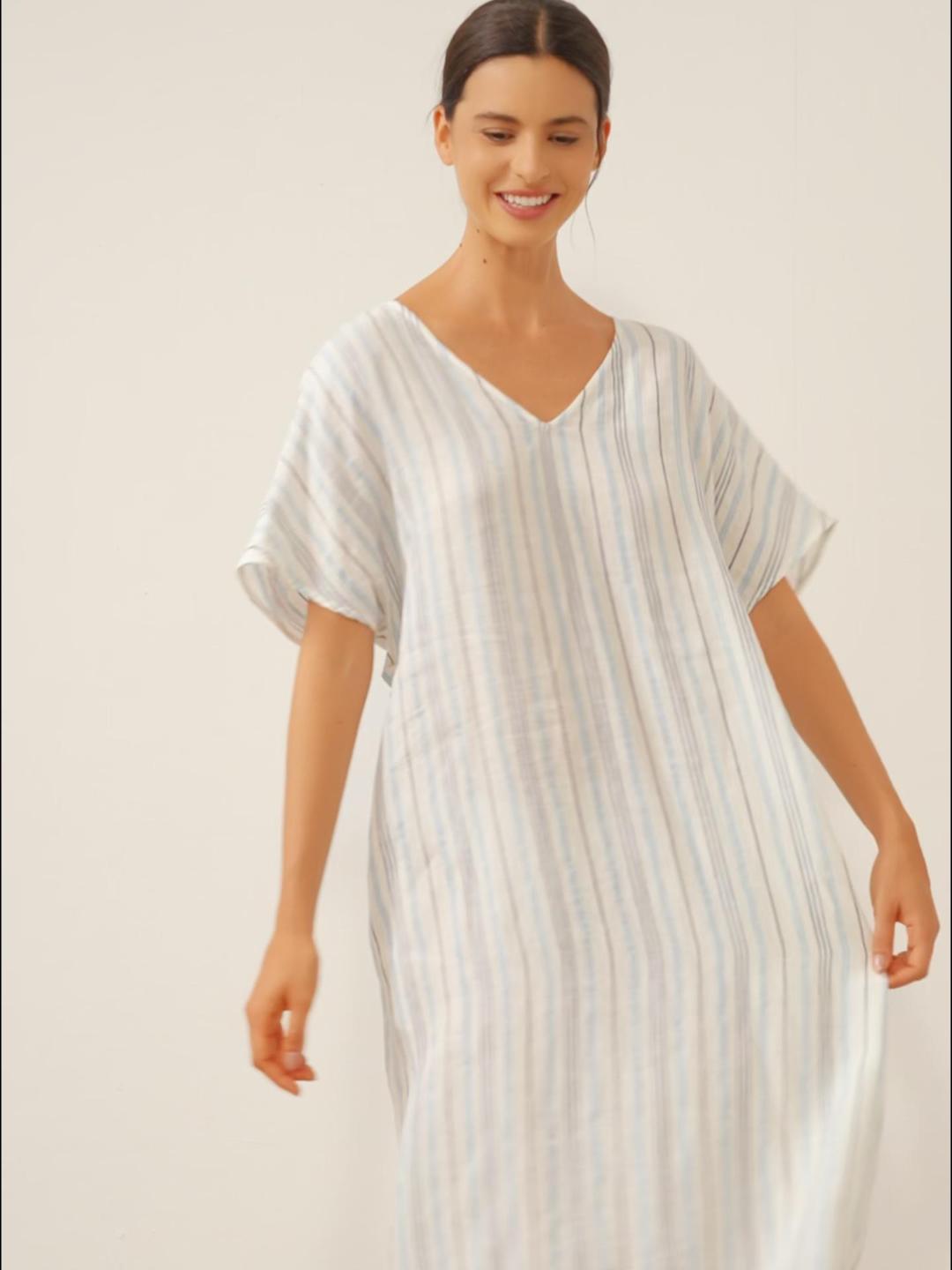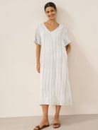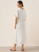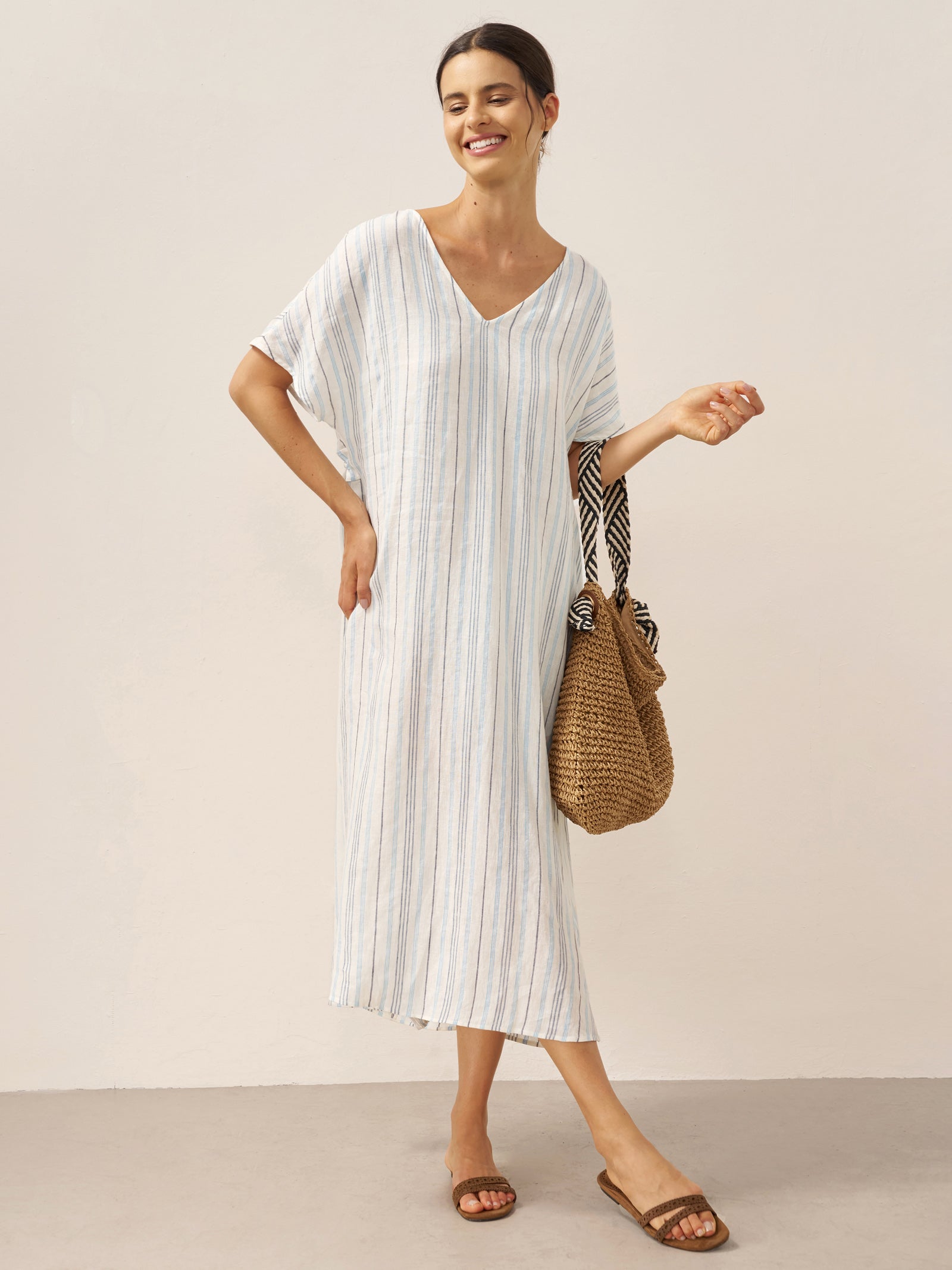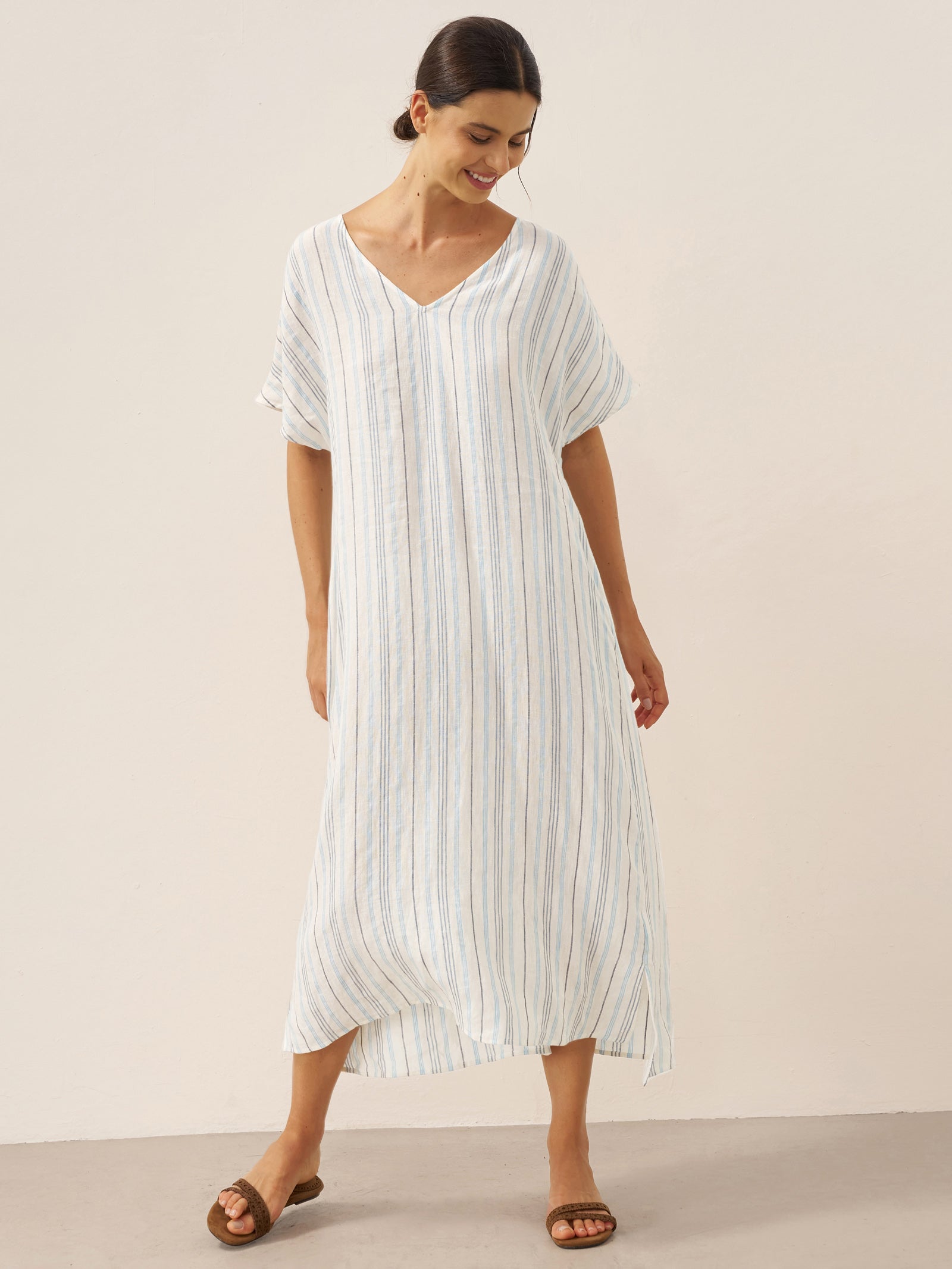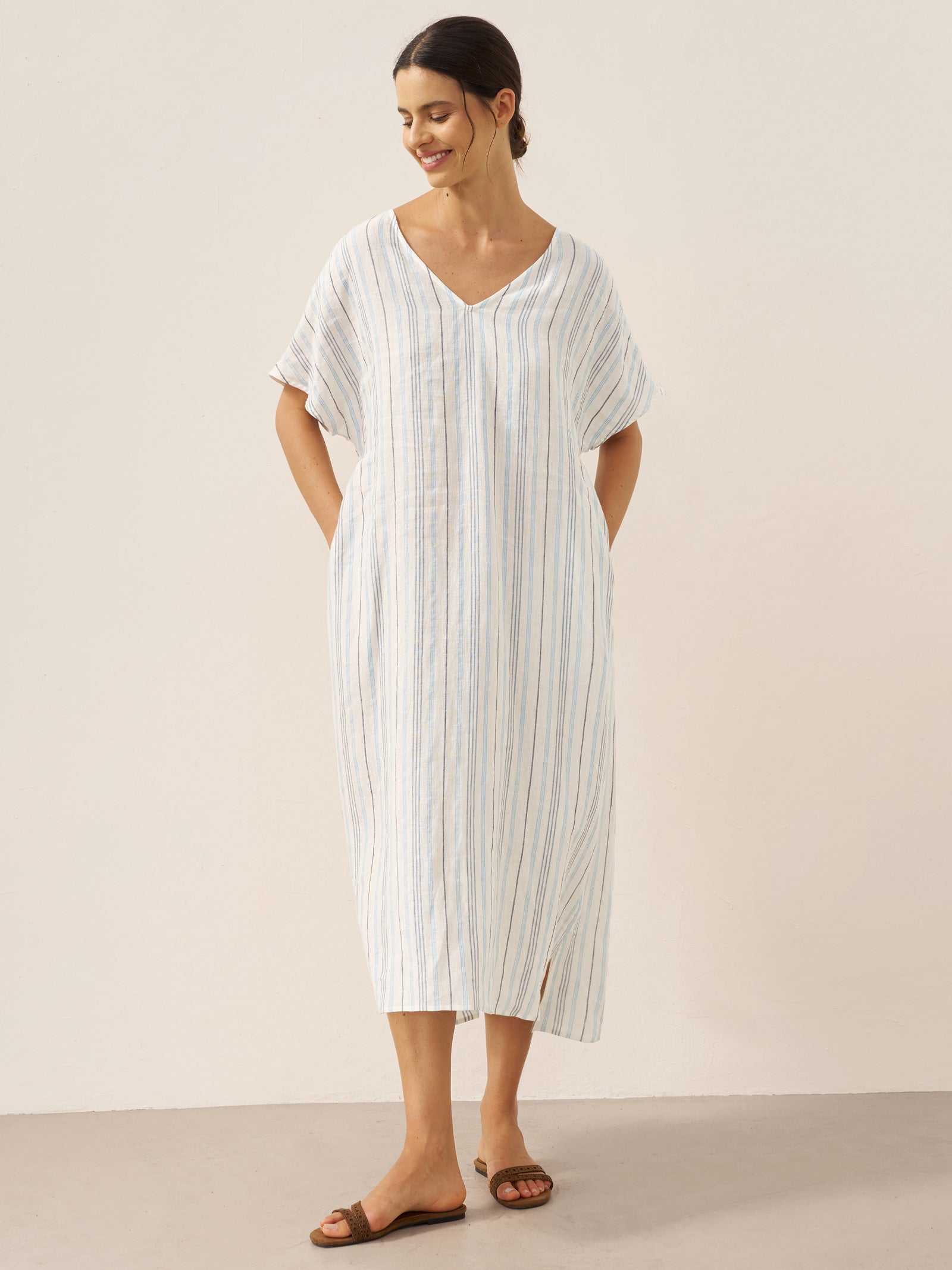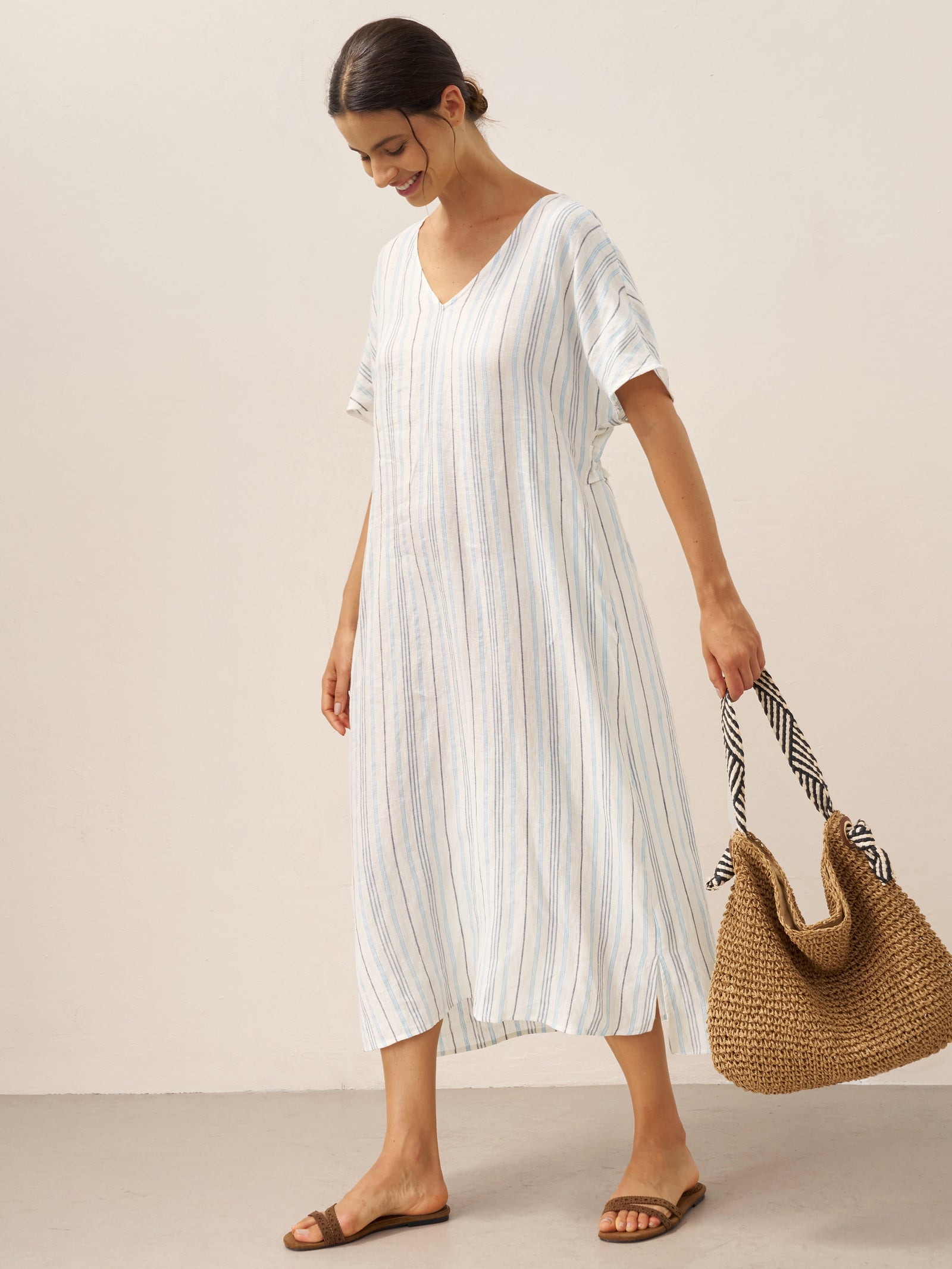 Effortless summer ease meets seaside romance in this breezy striped linen dress.
