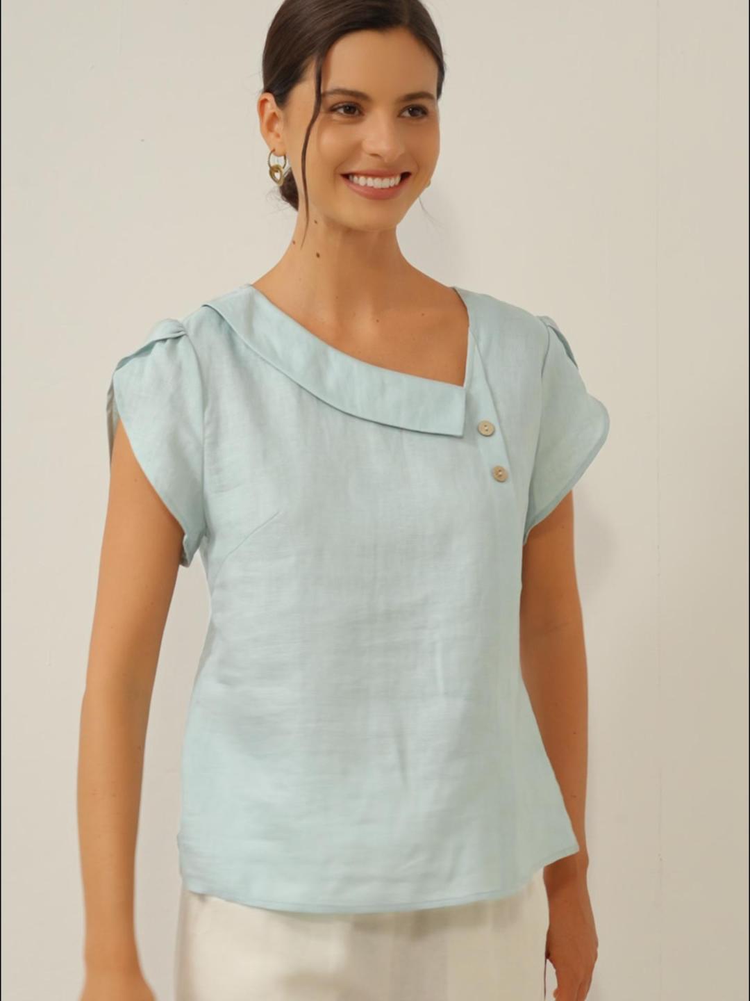 100% Linen Crescent Collar Flutter Sleeve Top FARA