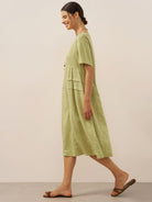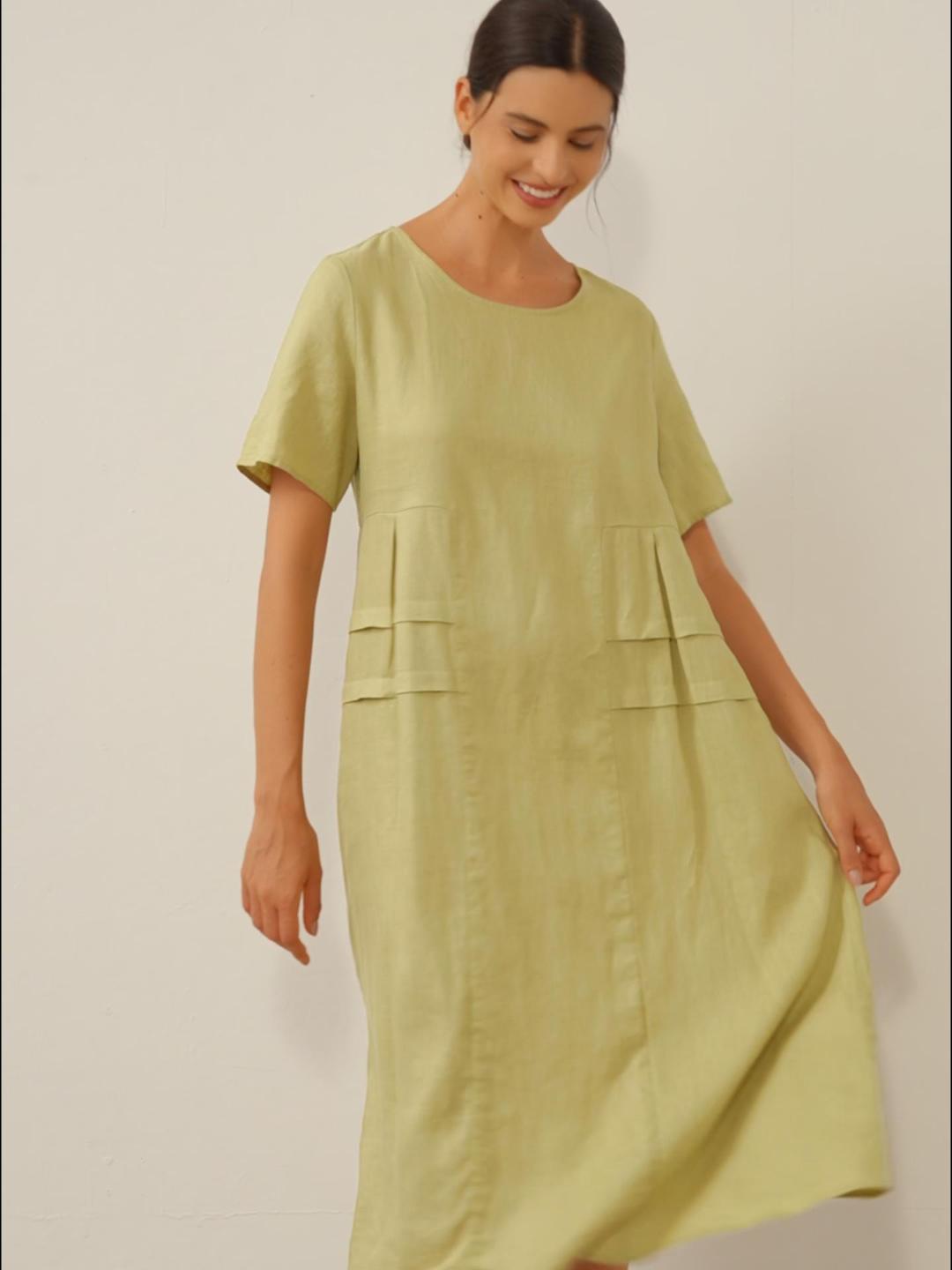 100% Linen Pleated Crew Neck Midi Dress MILA