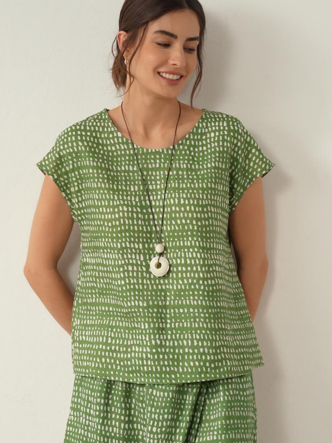 Made from custom dot printed linen, this fabric features hand-drawn patterns and vibrant digital prints that stay vivid after washing. It adds an artistic touch while balancing comfort and fashion.