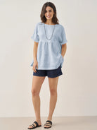 - The short drop shoulder sleeves, paired with naturally rolled sleeve edges, add a laid-back touch and highlight the subtle design details.