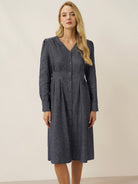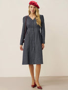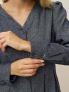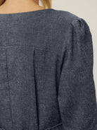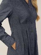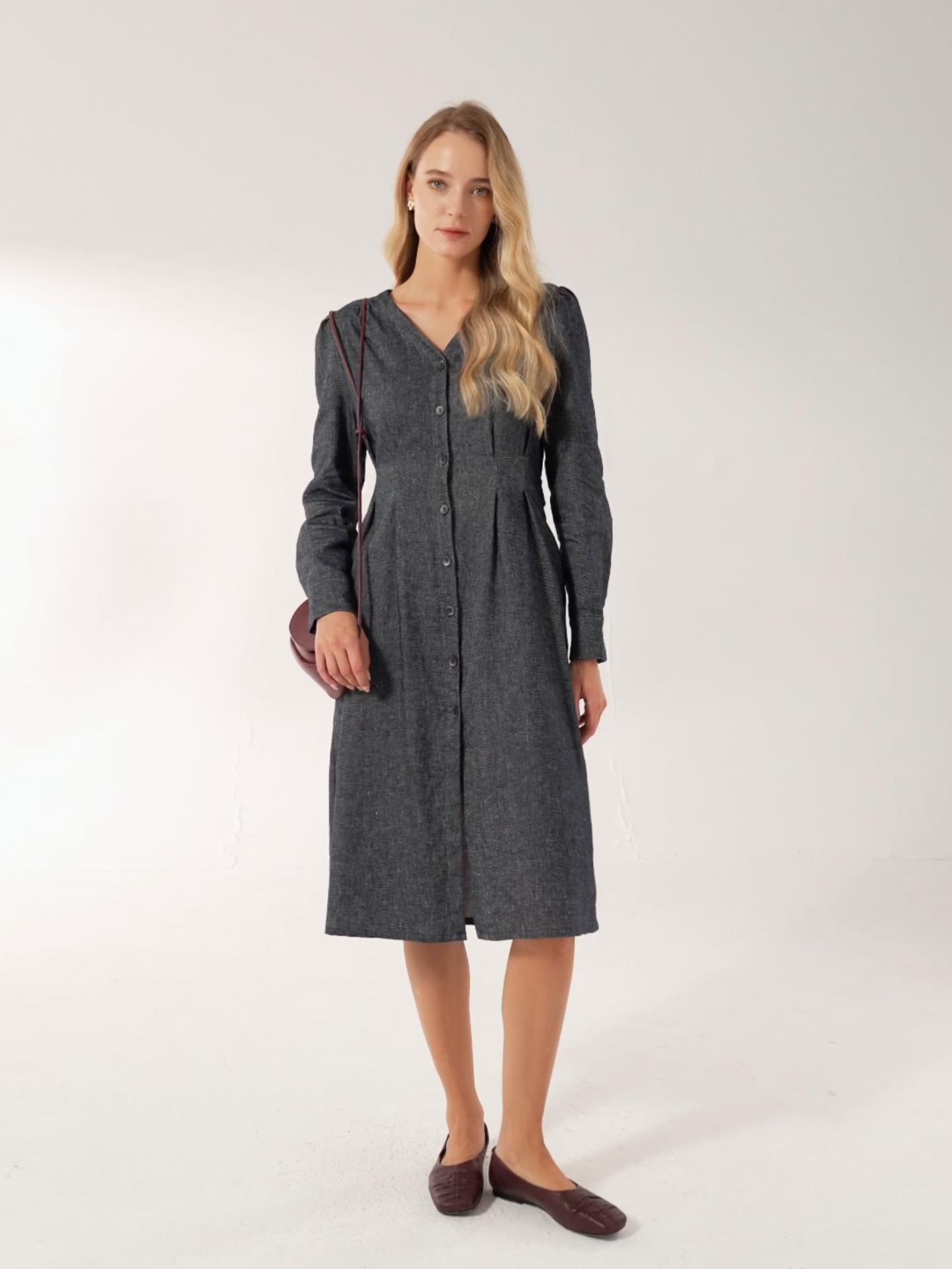 Versatile linen-blend denim midi dress with convertible styling, adjustable waist, and retro accents.