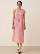 I'm quite impressed by this linen dress. The quality is really high, they've used good linen for sure. Also, I'm a fan of this subtle pink shade – it's lovely. It's versatile with any shoes and makes a nice outfit. Thinking about getting another in a different color. Recommended.