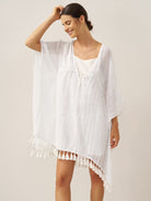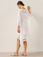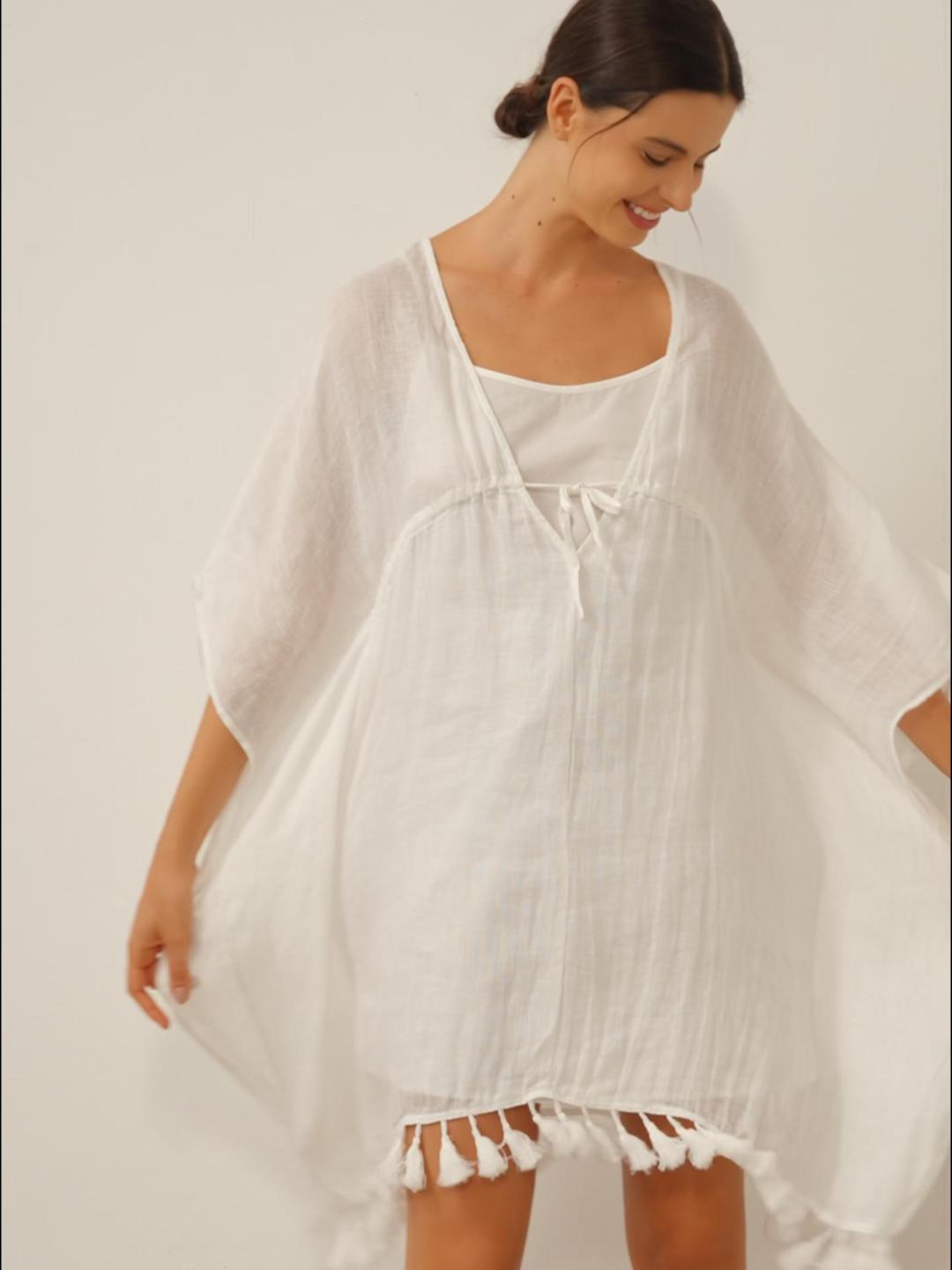 This Linen V-Neck Cover-Up Dress Set is nice! The two-piece design is so versatile. The elastic waist with the natural pleats lets me adjust it to my liking, and the fringed hem. I wore it on vacation, and it was a great choice. Highly recommend!
