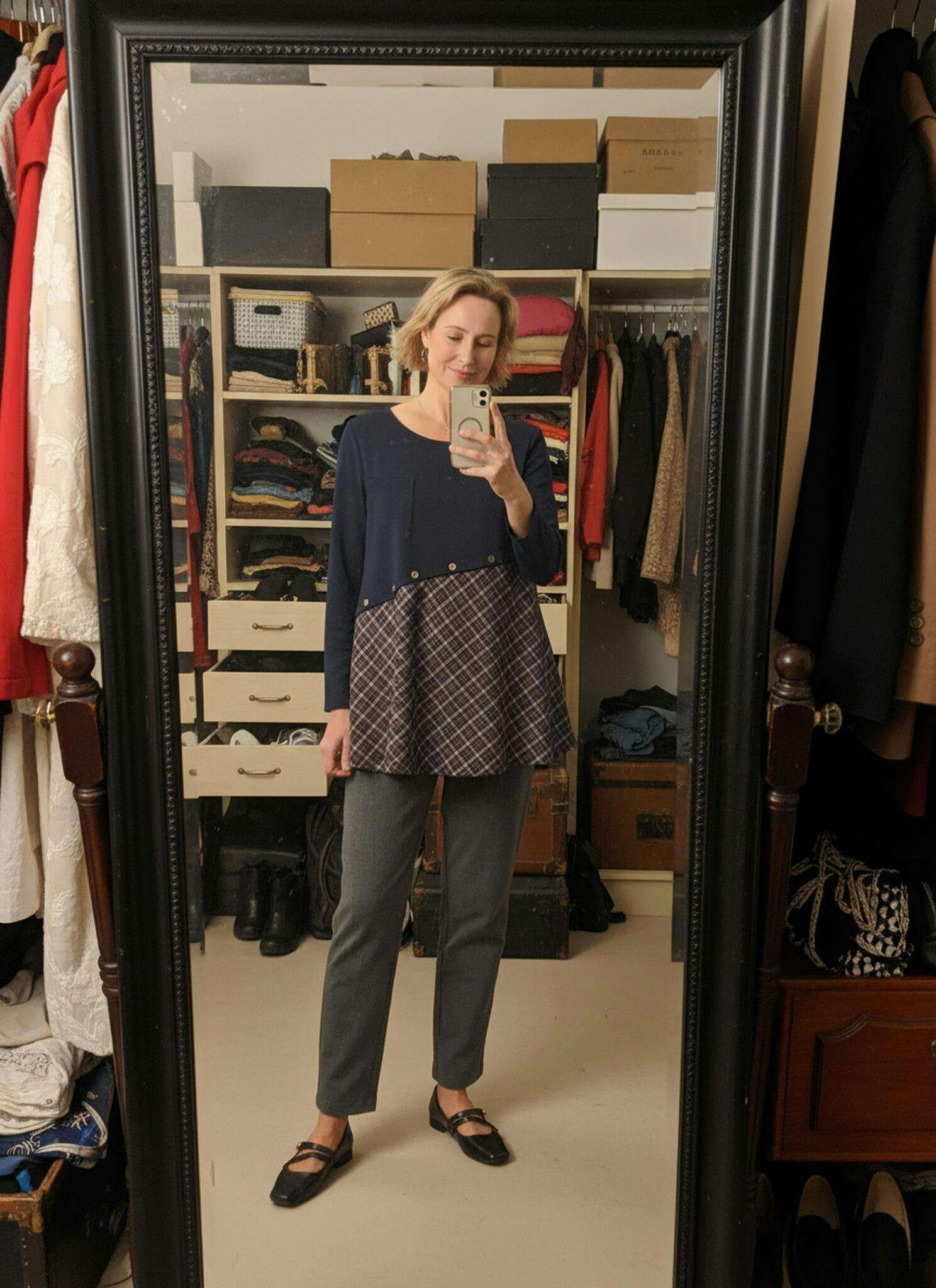 - Office Elegance: Tailored crepe trousers + block-heel ankle boots + structured tote
