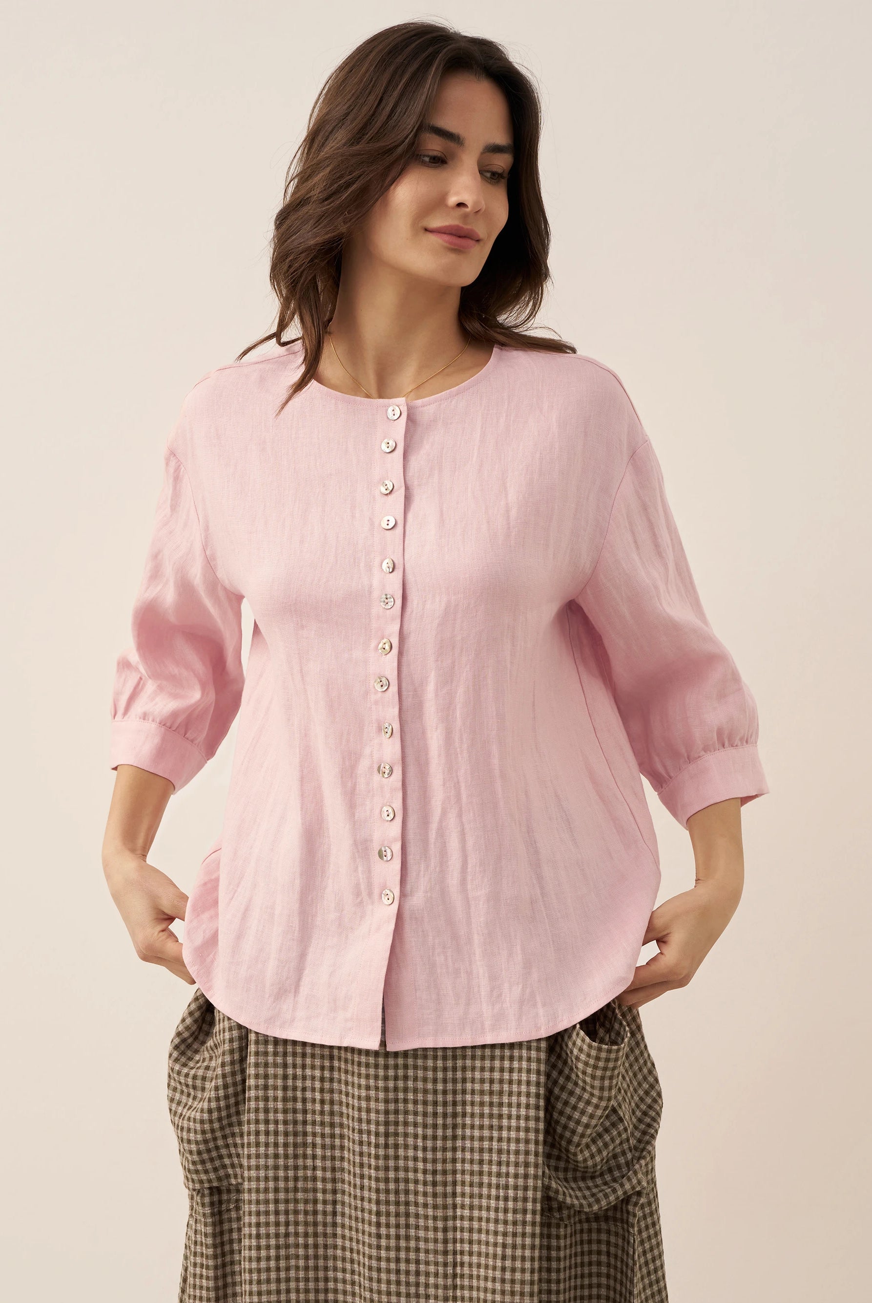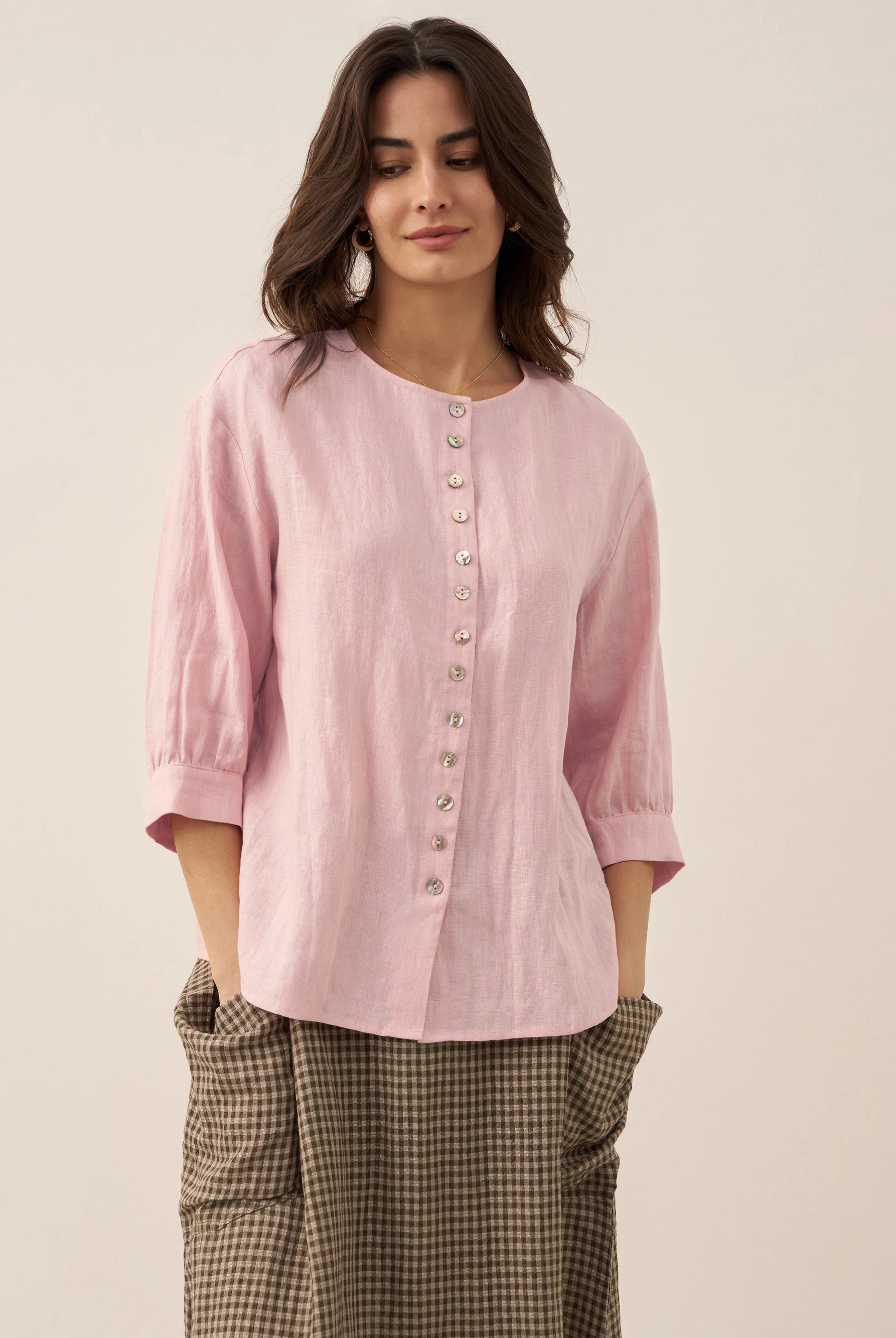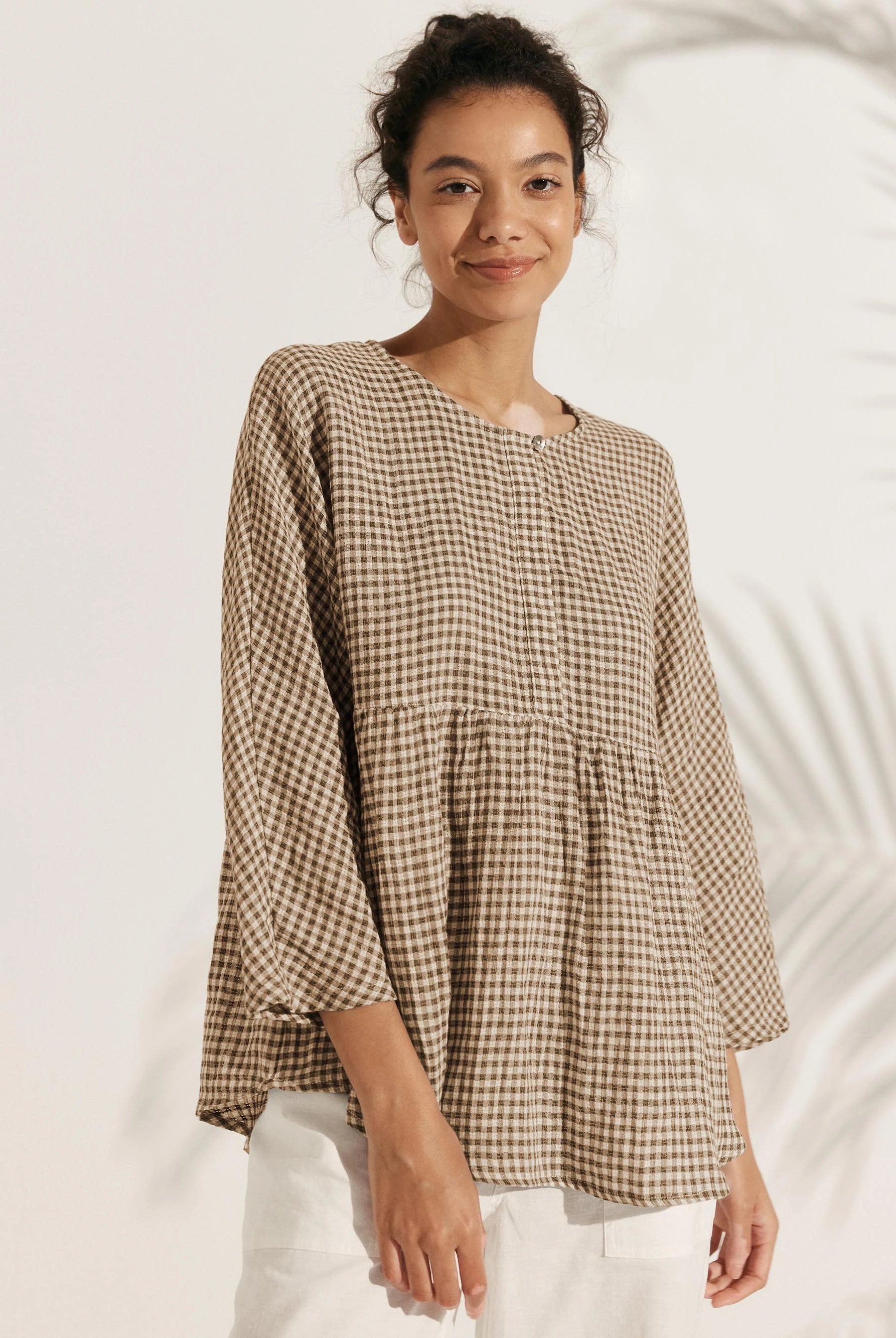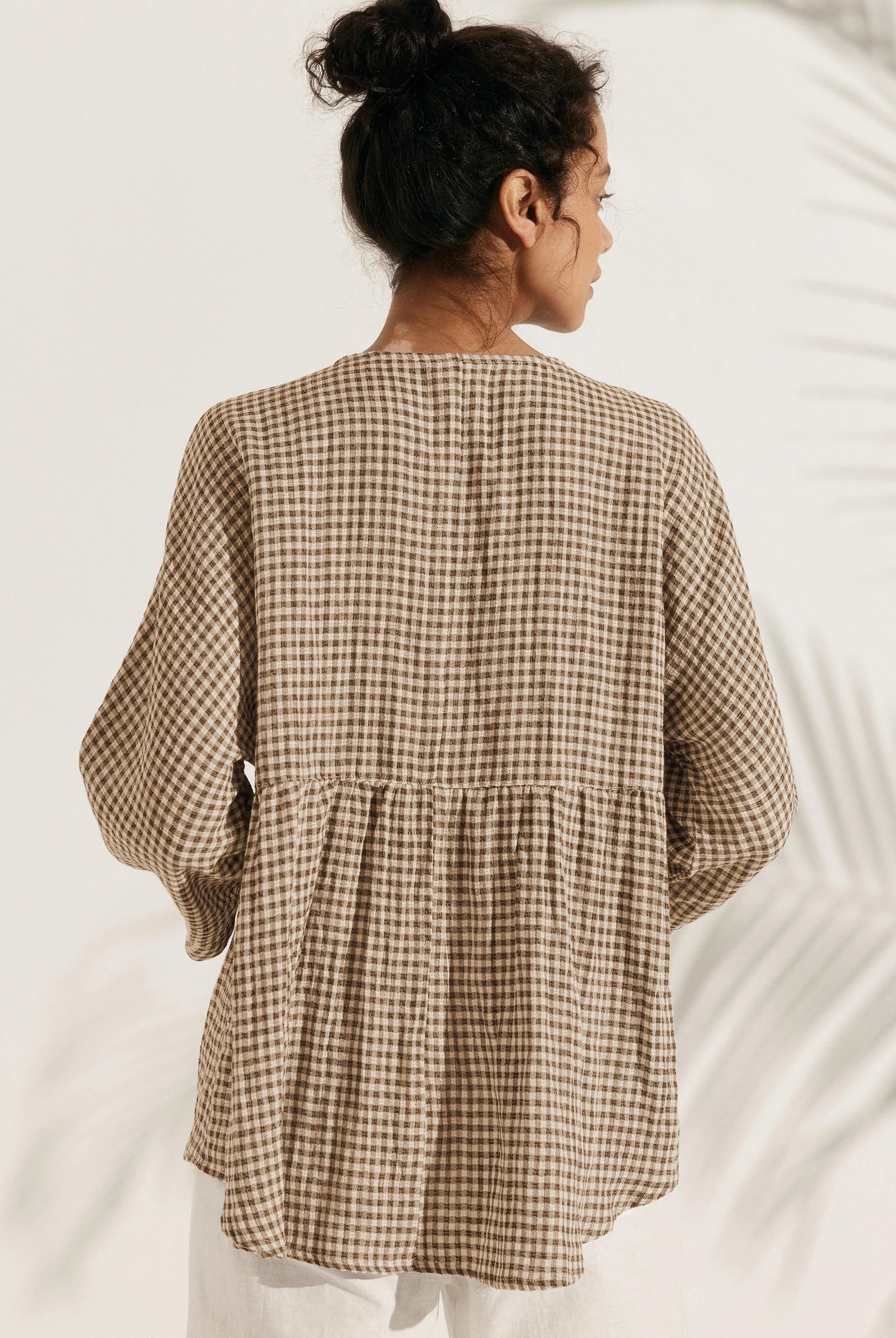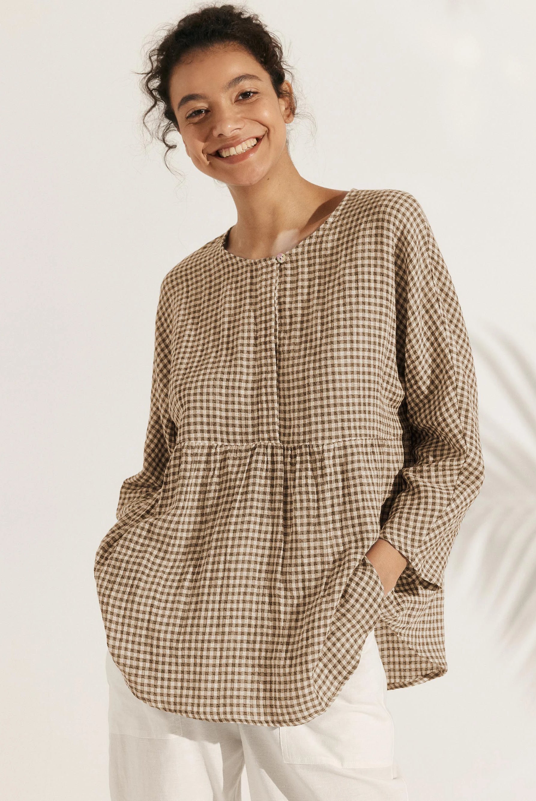 Linen Gingham Checked Round Soft-Fold Collar Top LAURA