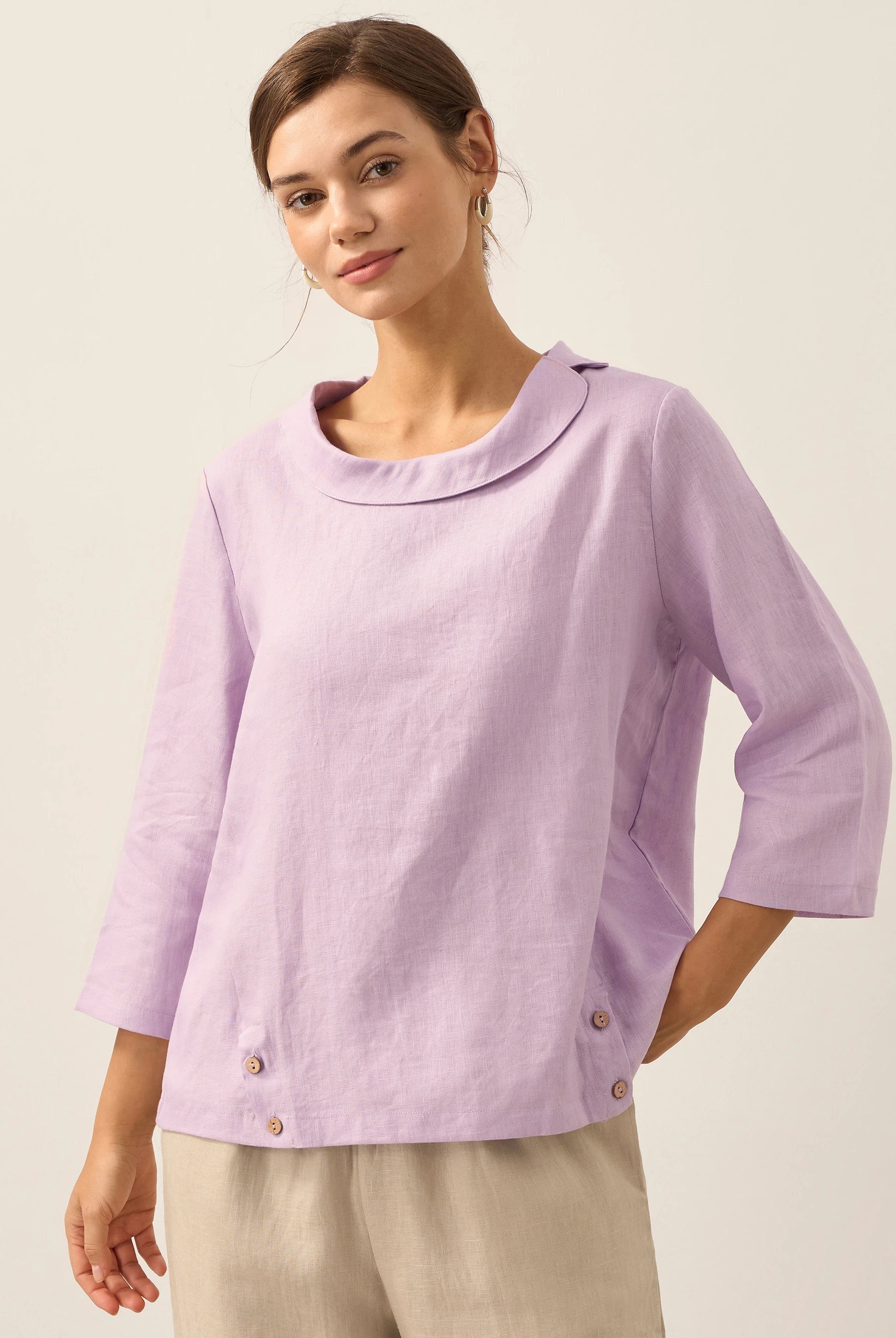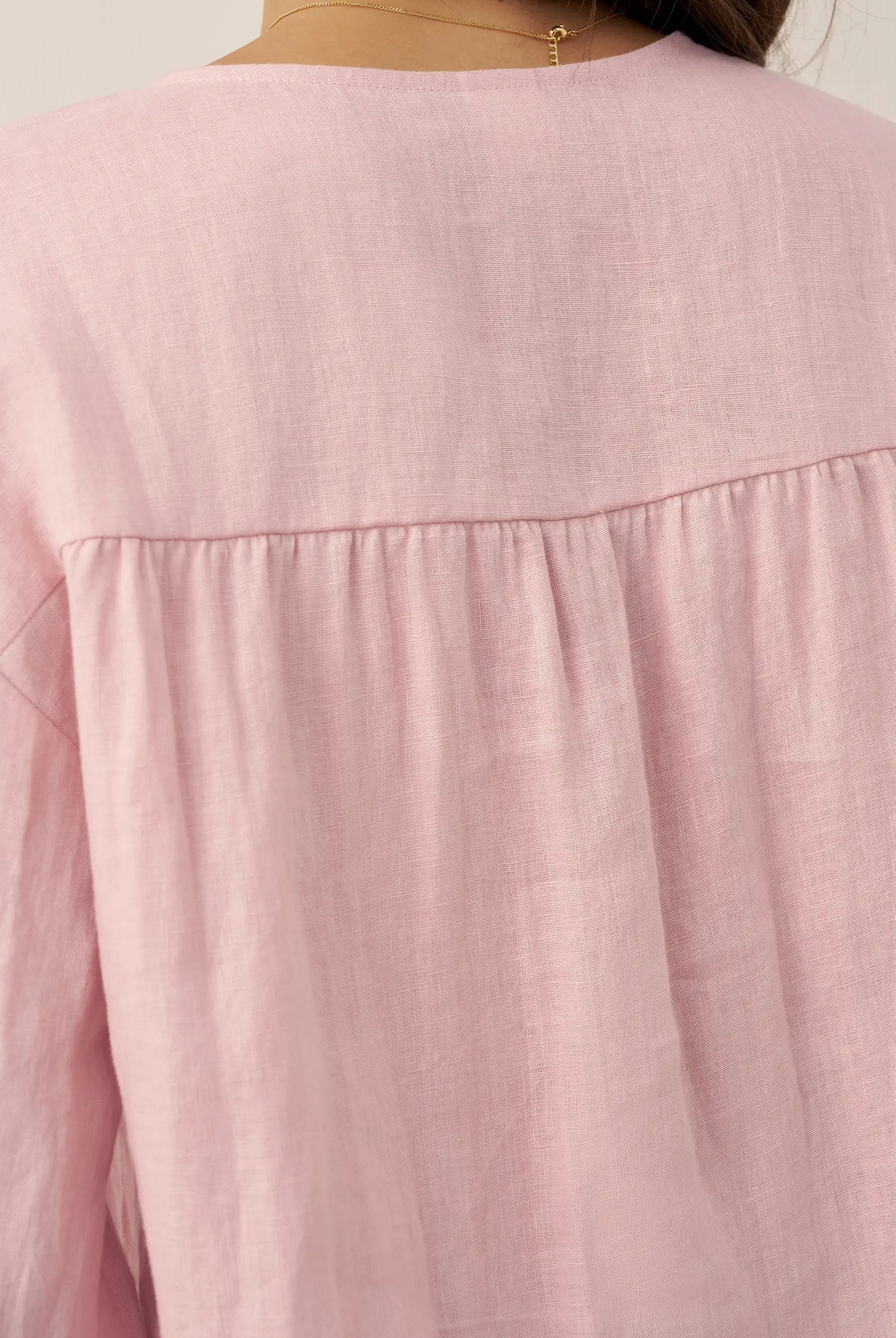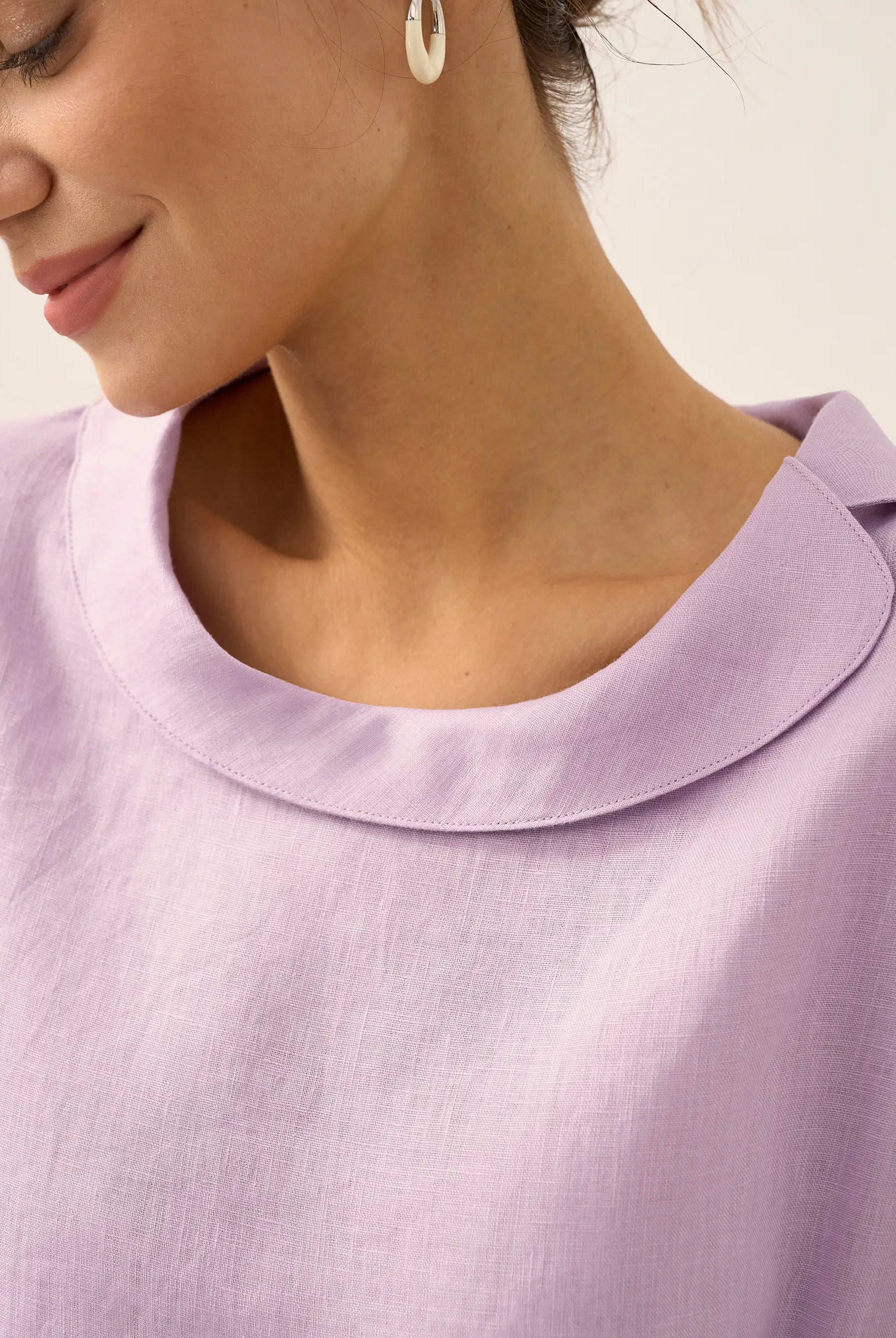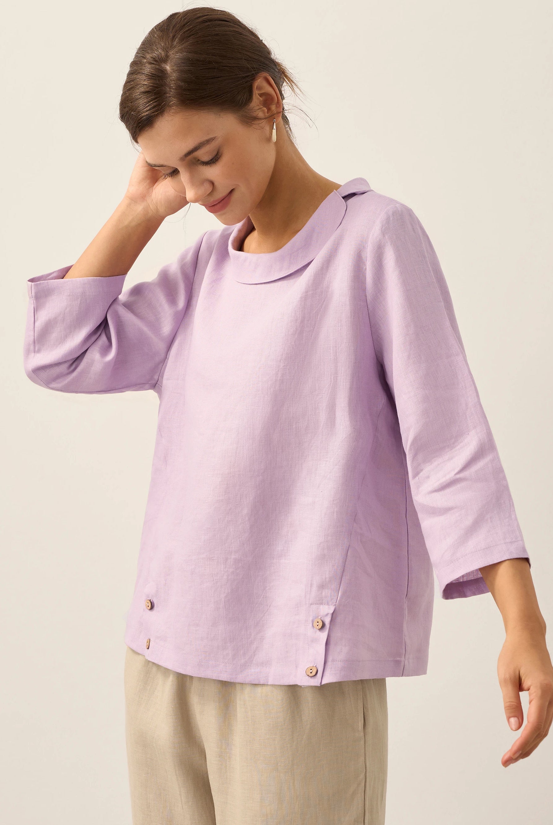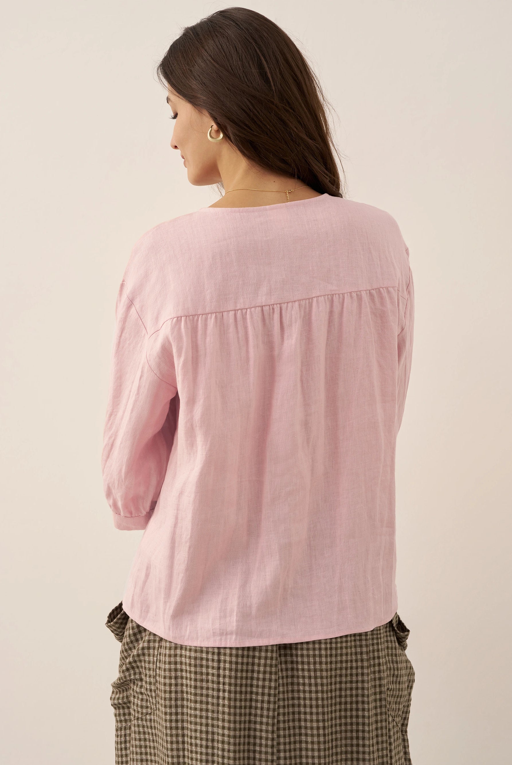 Linen Gingham Checked Round Soft-Fold Collar Top LAURA