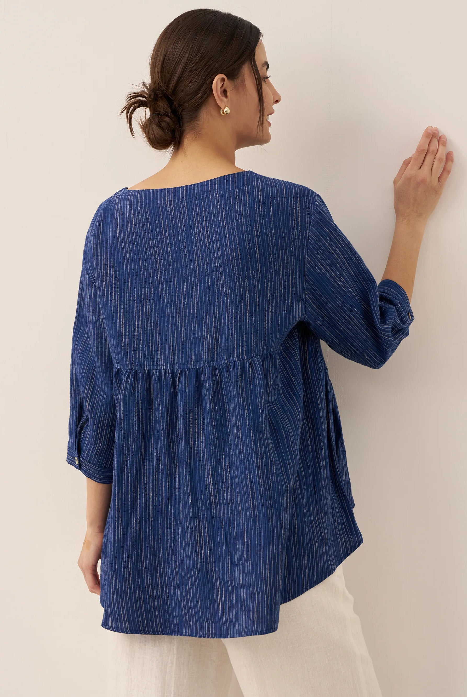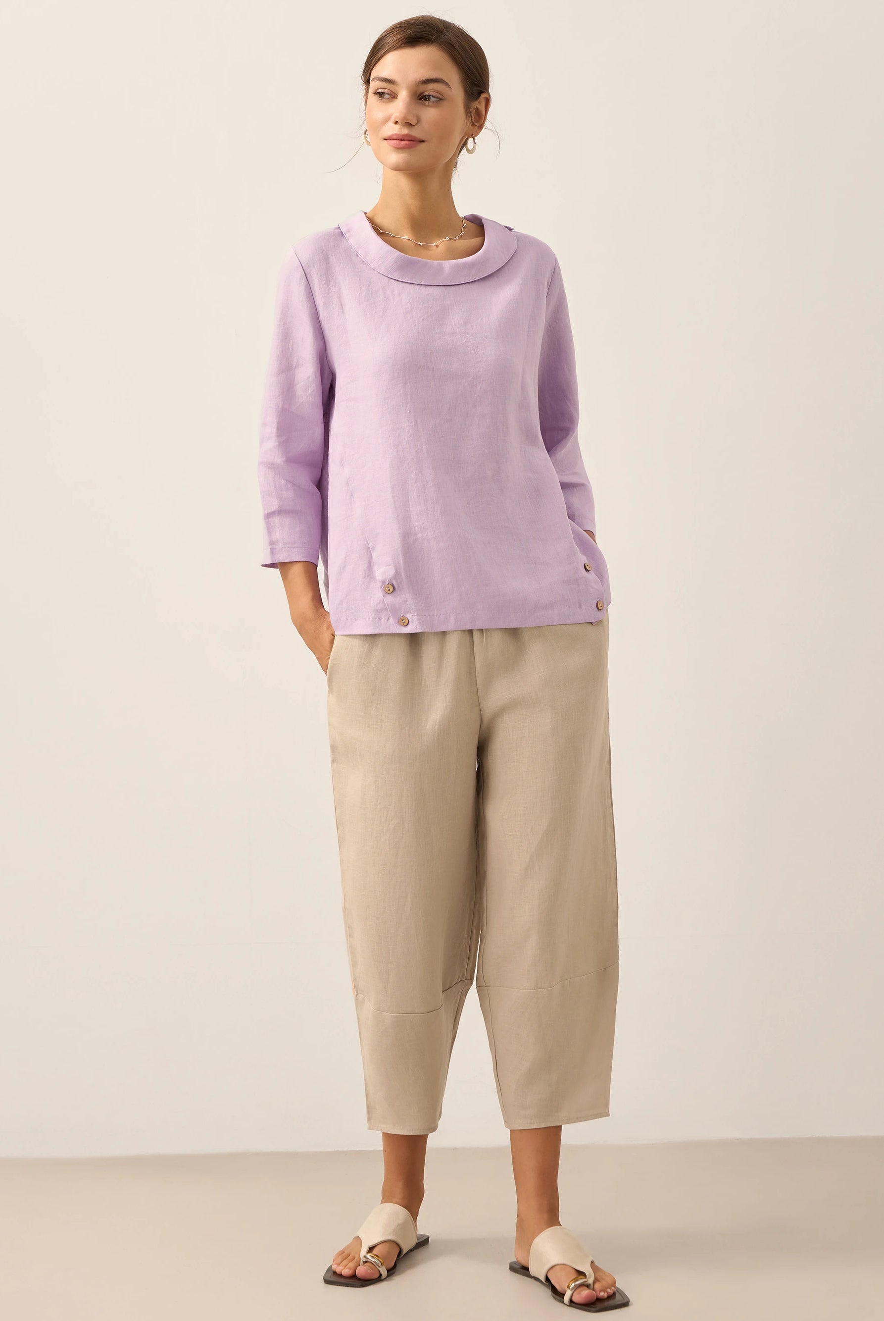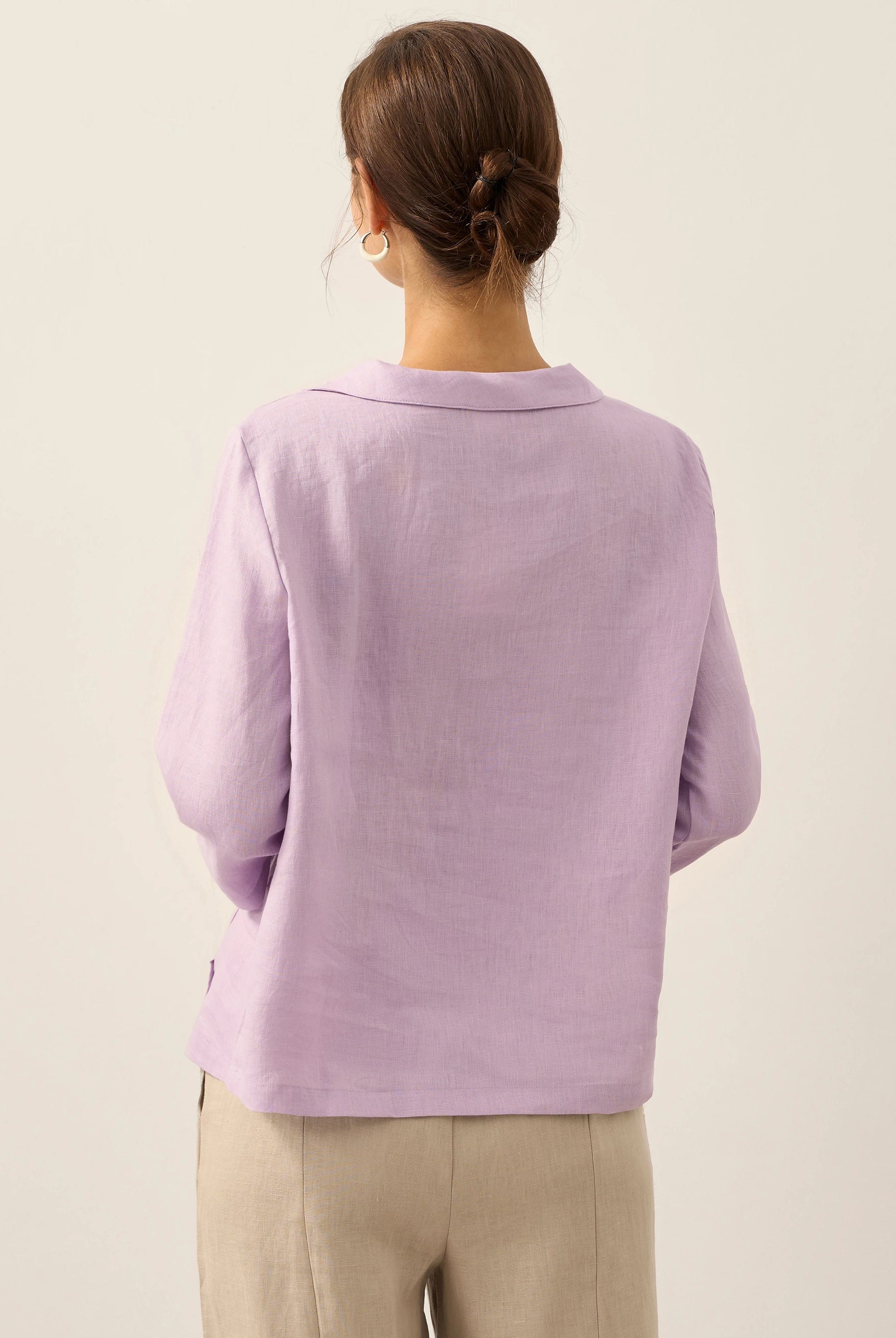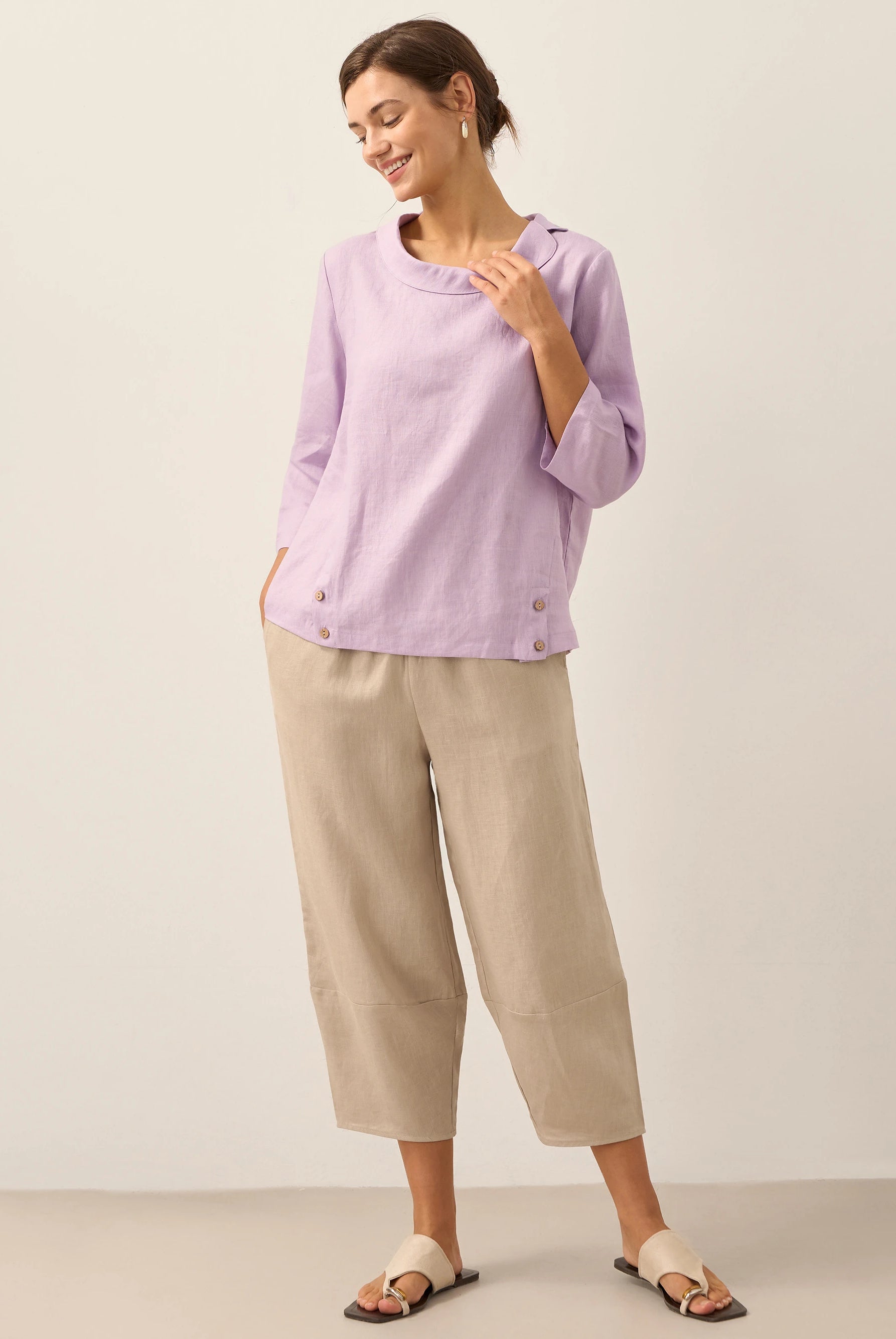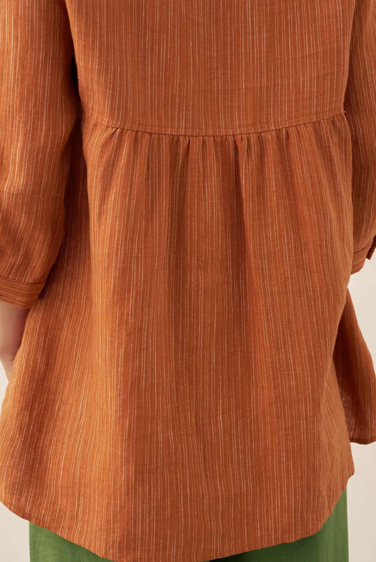 Linen Gingham Checked Round Soft-Fold Collar Top LAURA