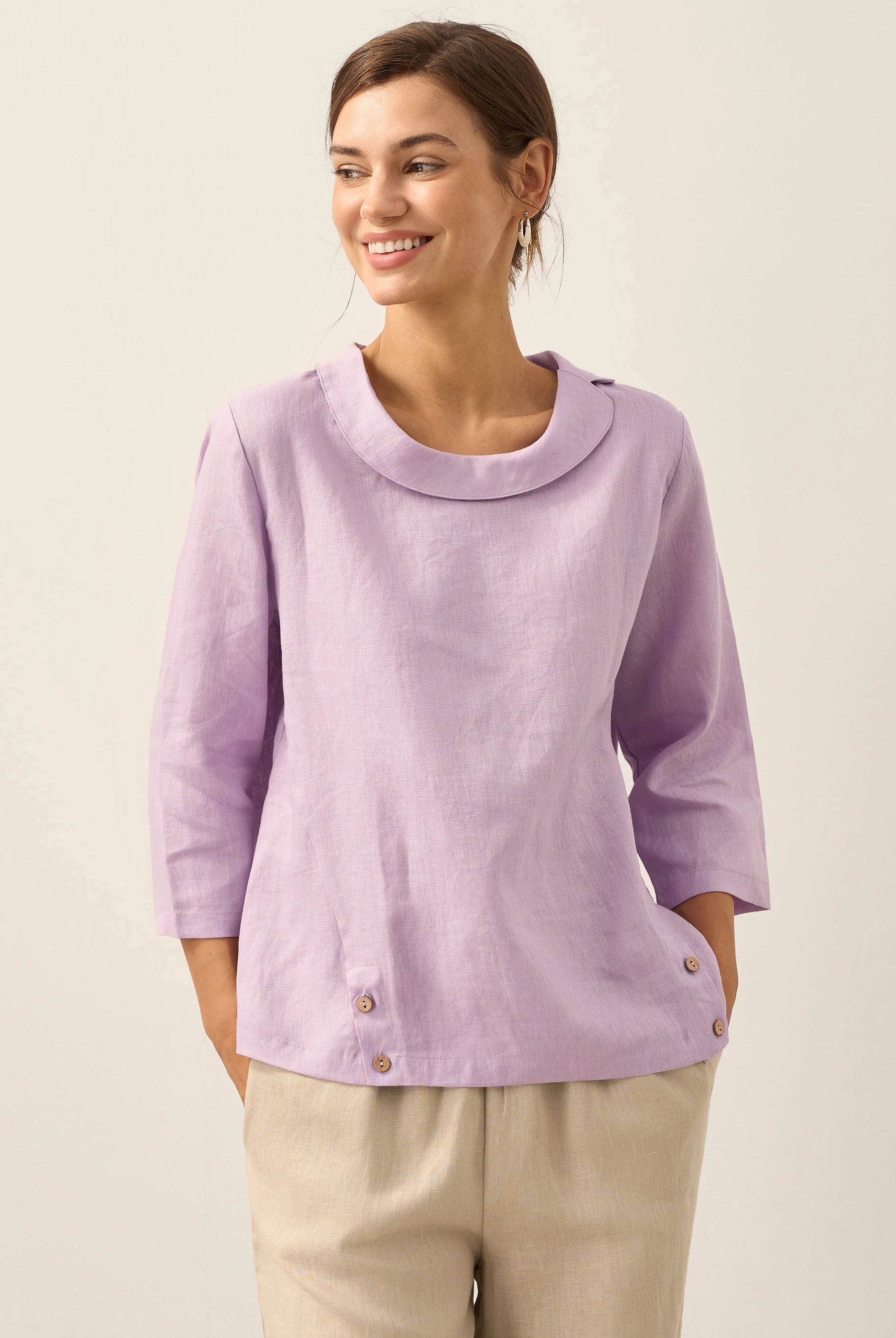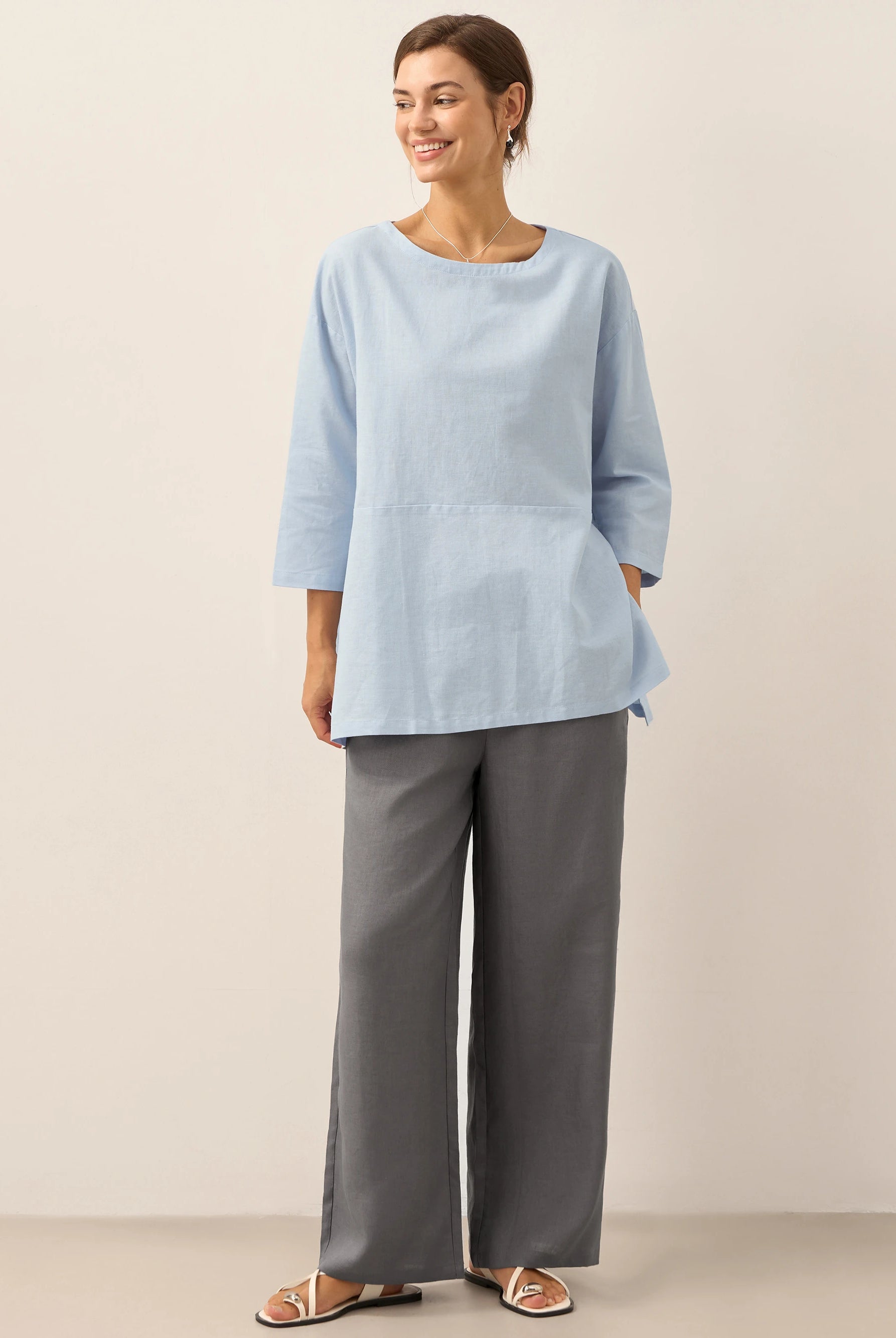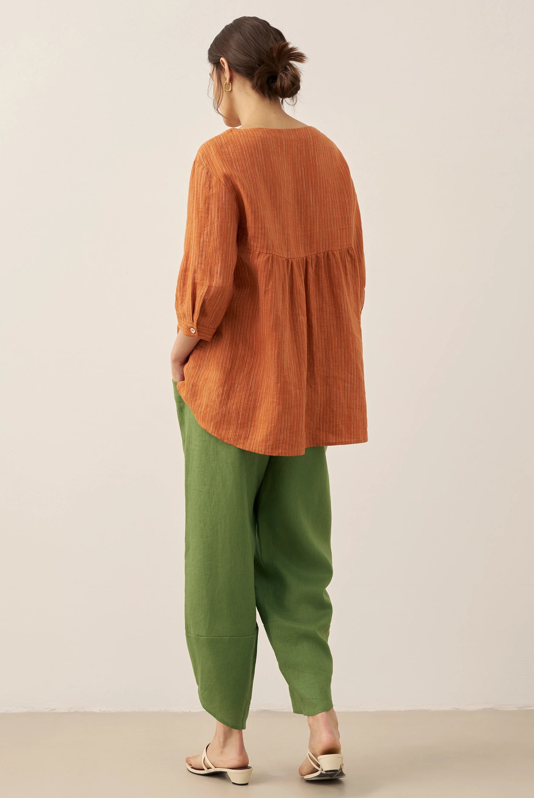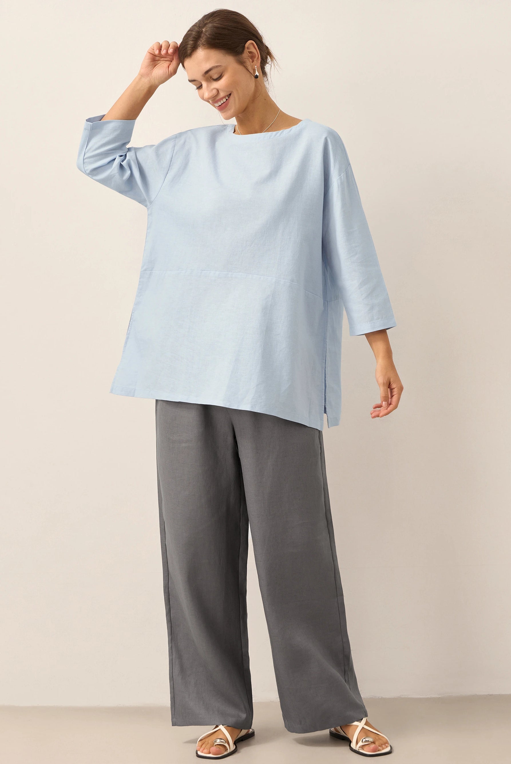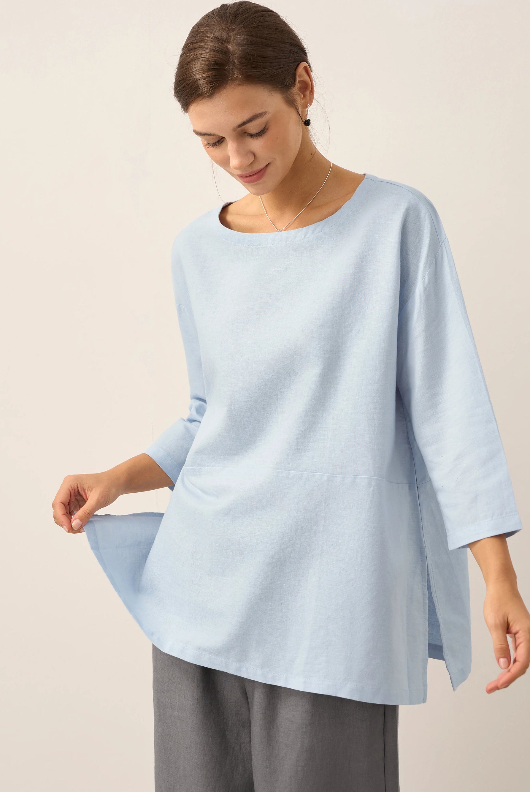 Linen Gingham Checked Round Soft-Fold Collar Top LAURA