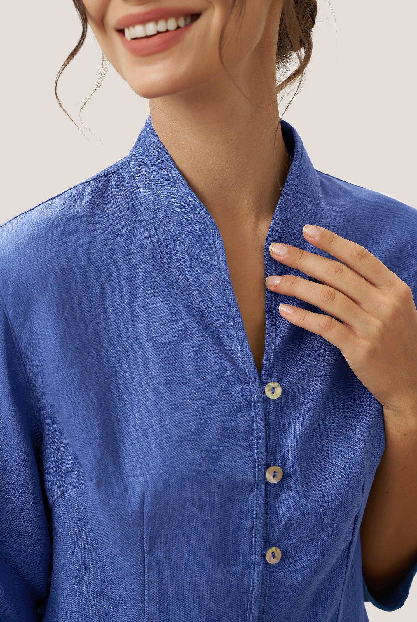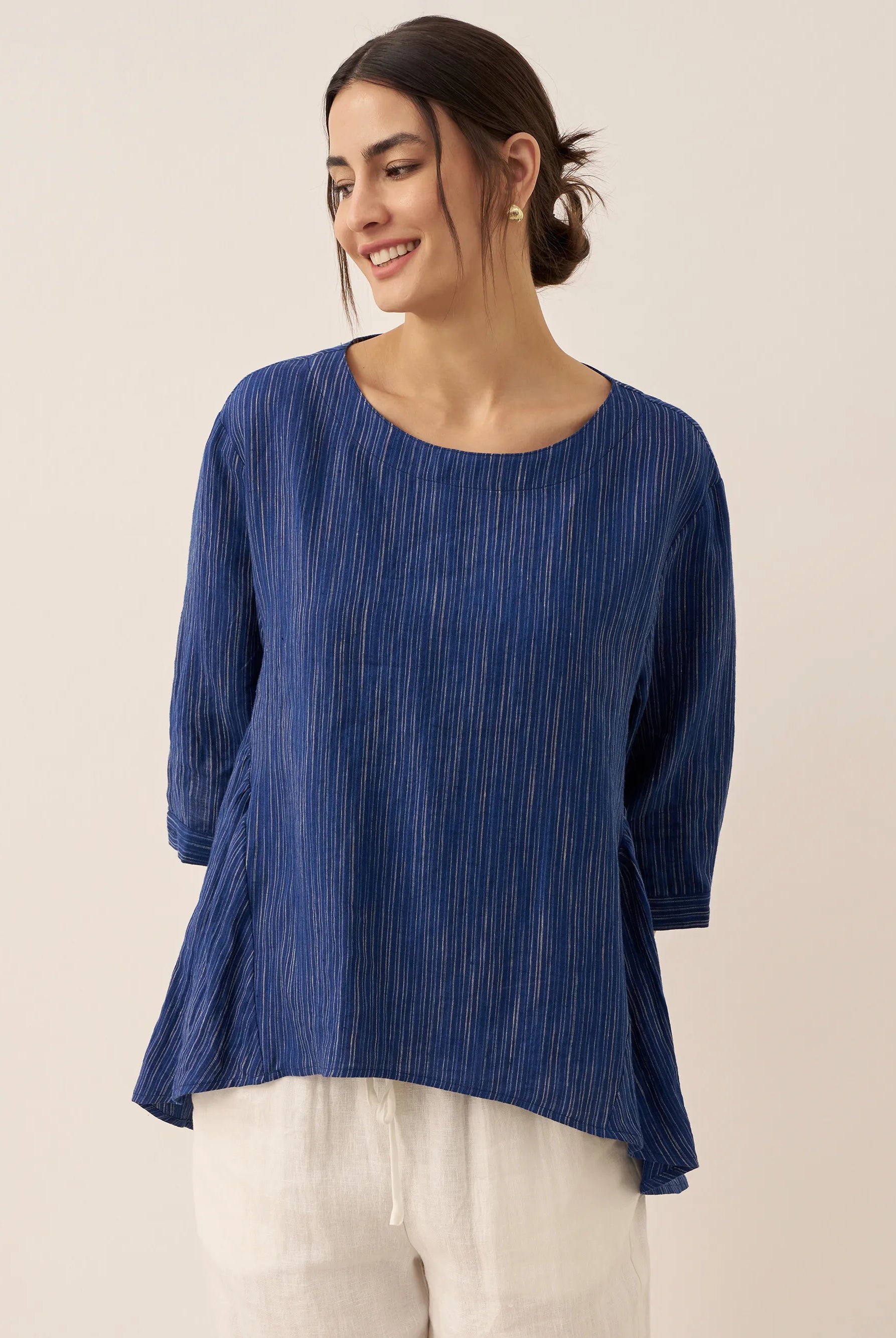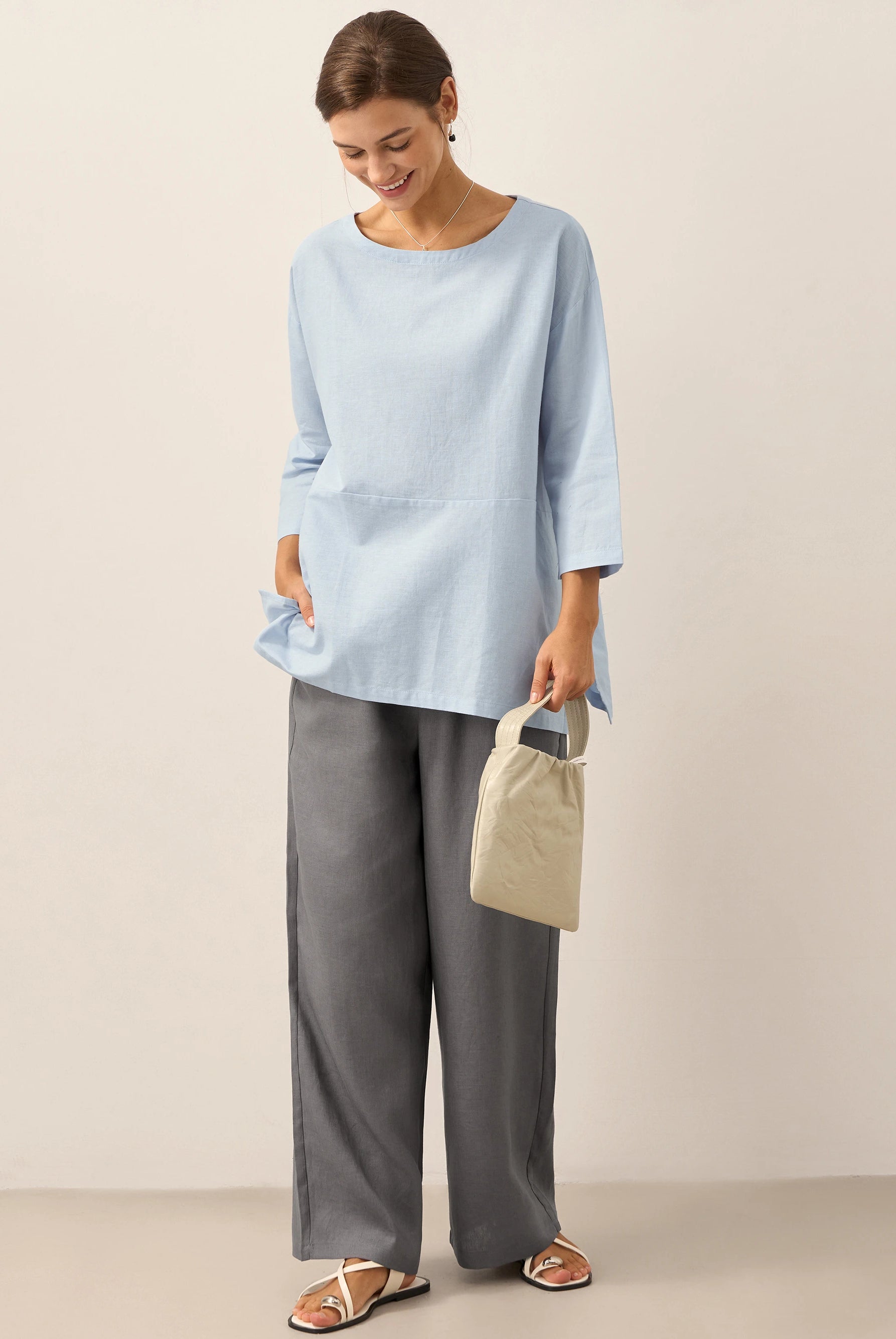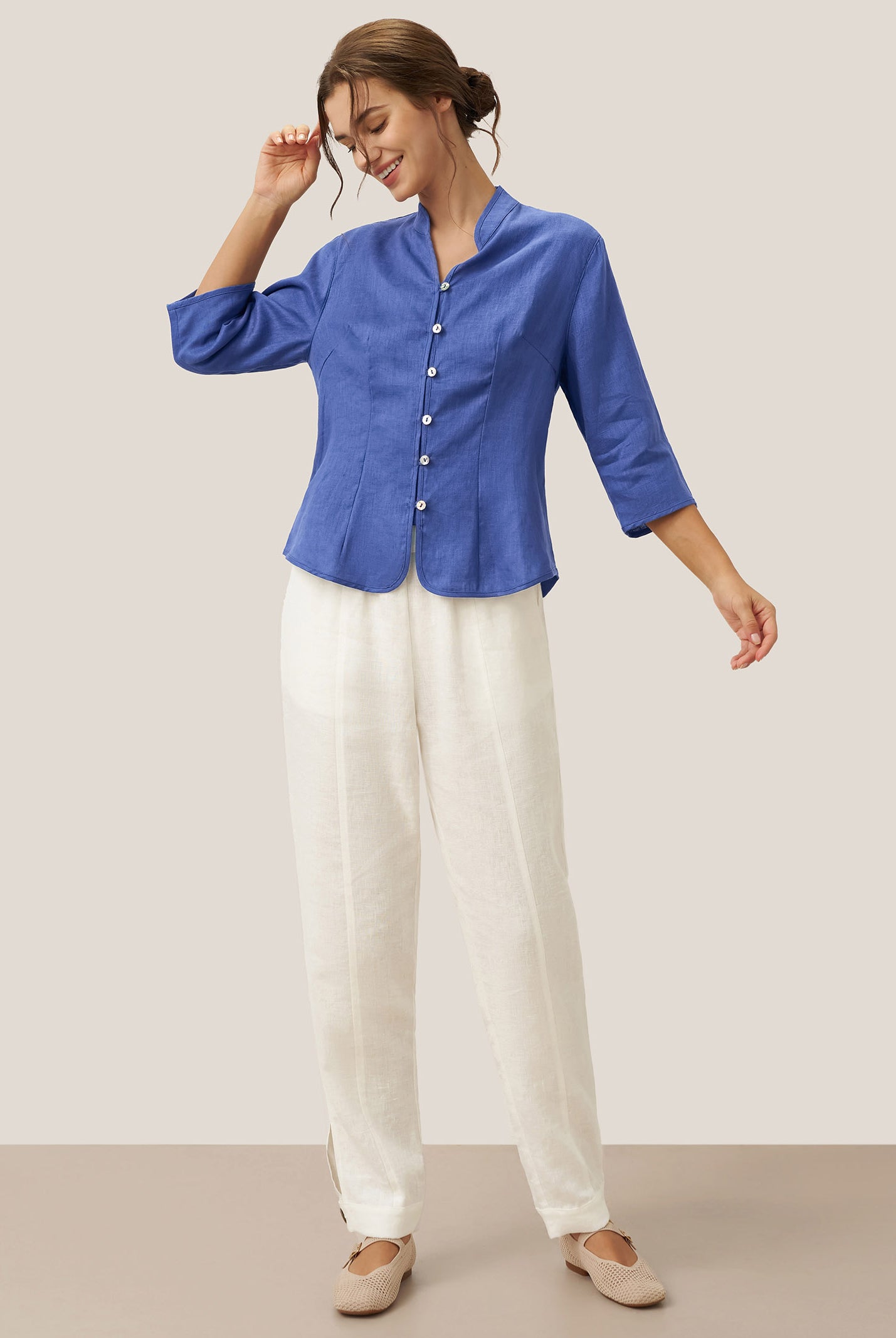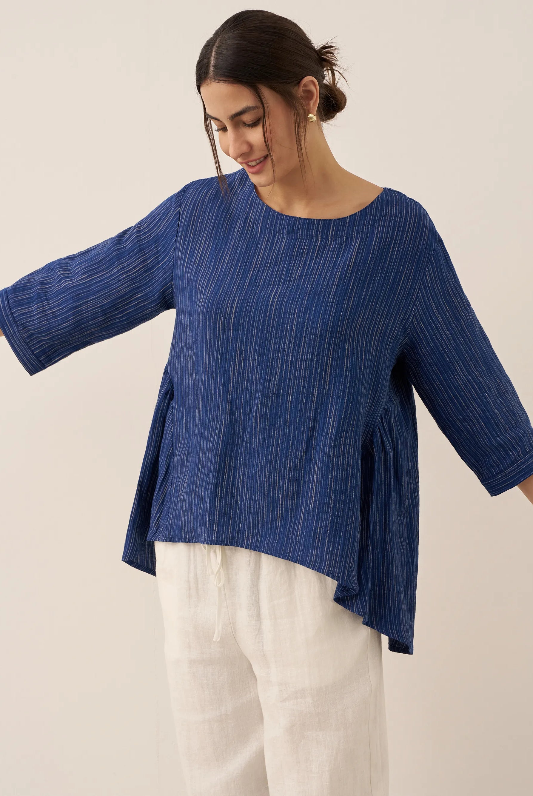 Linen Gingham Checked Round Soft-Fold Collar Top LAURA