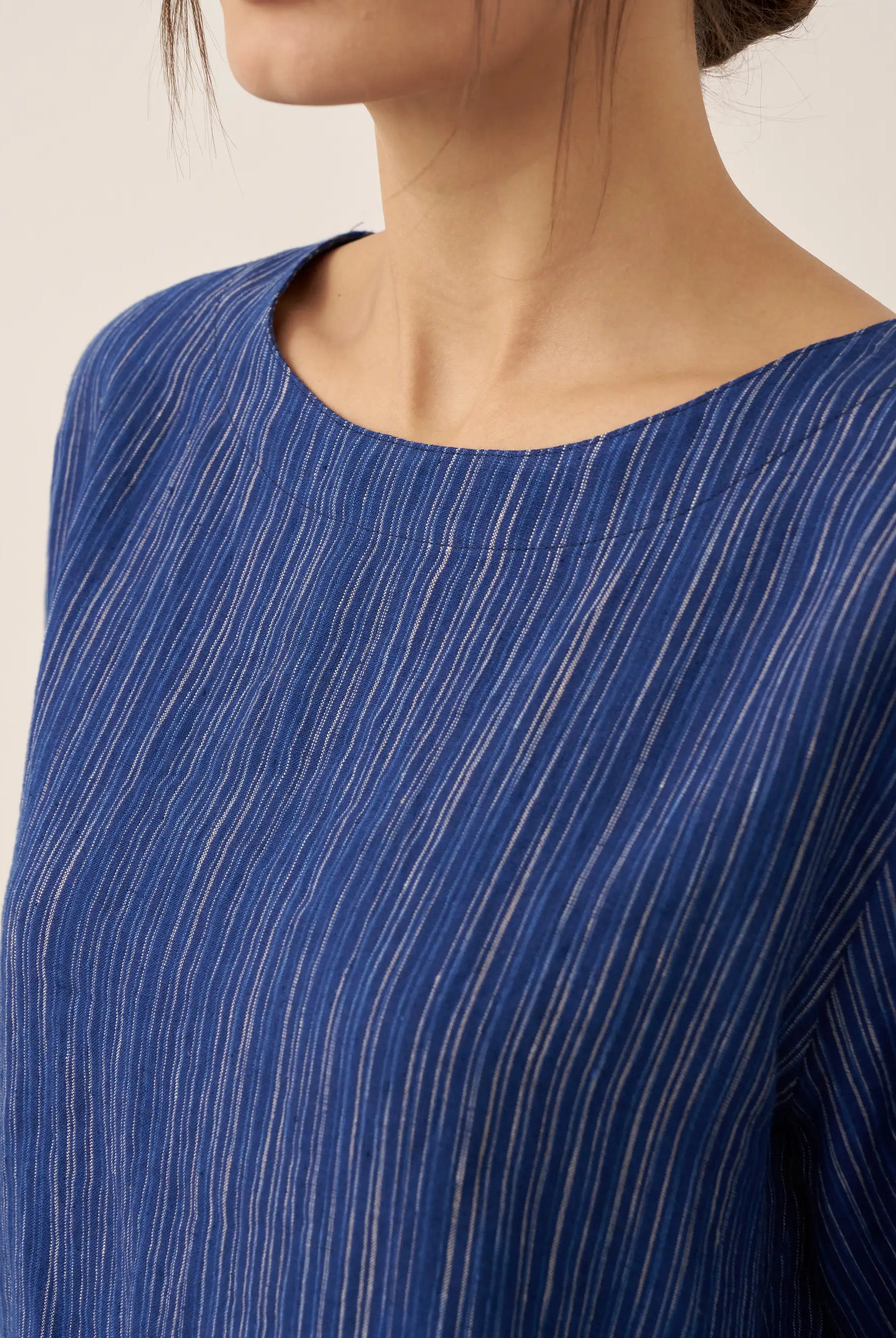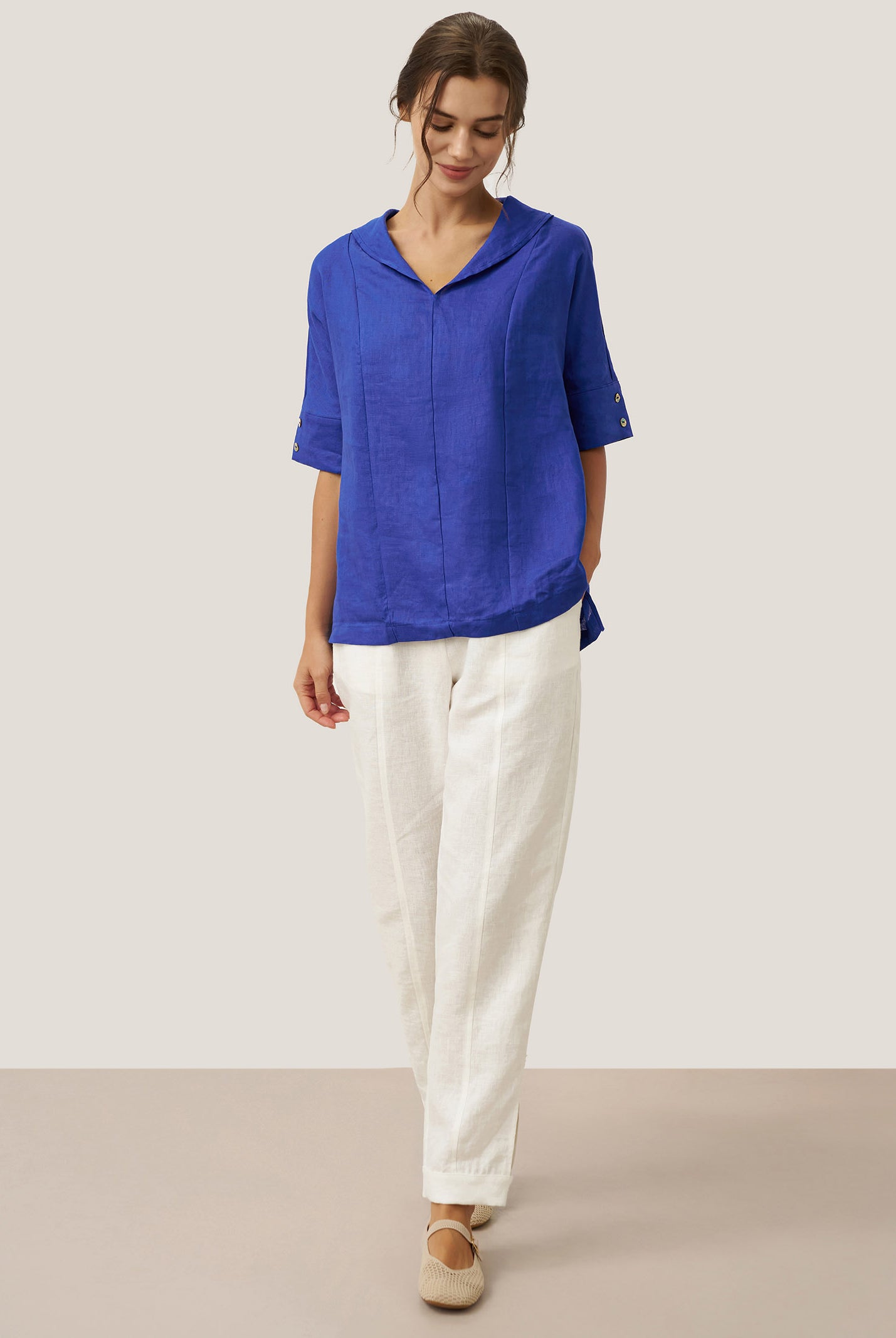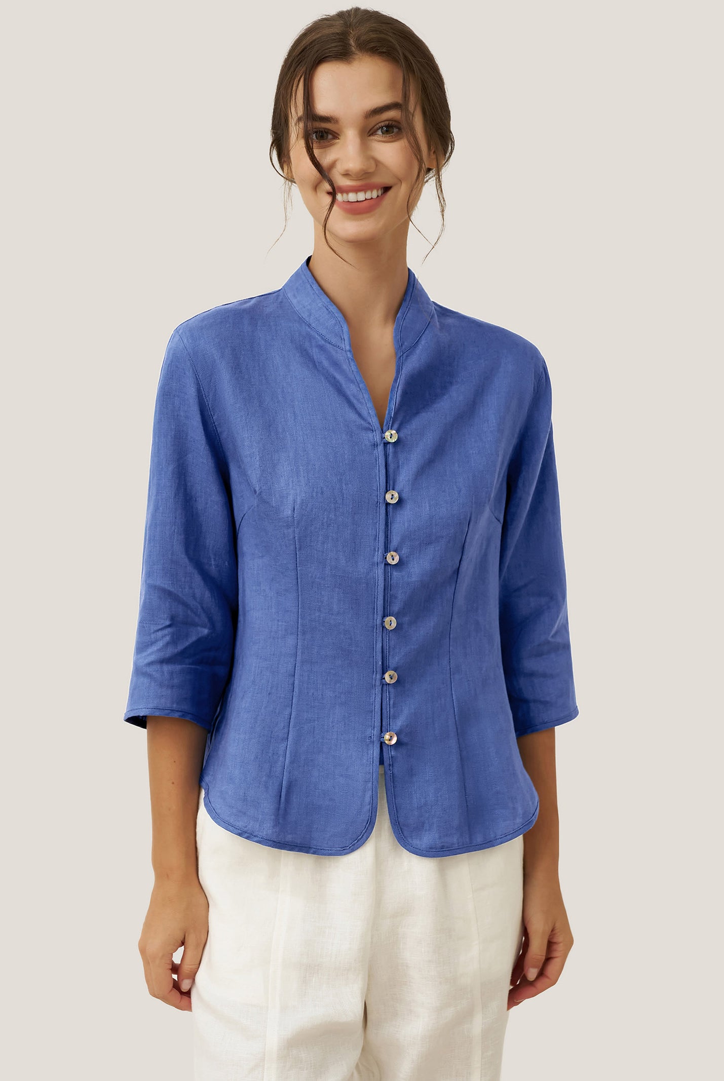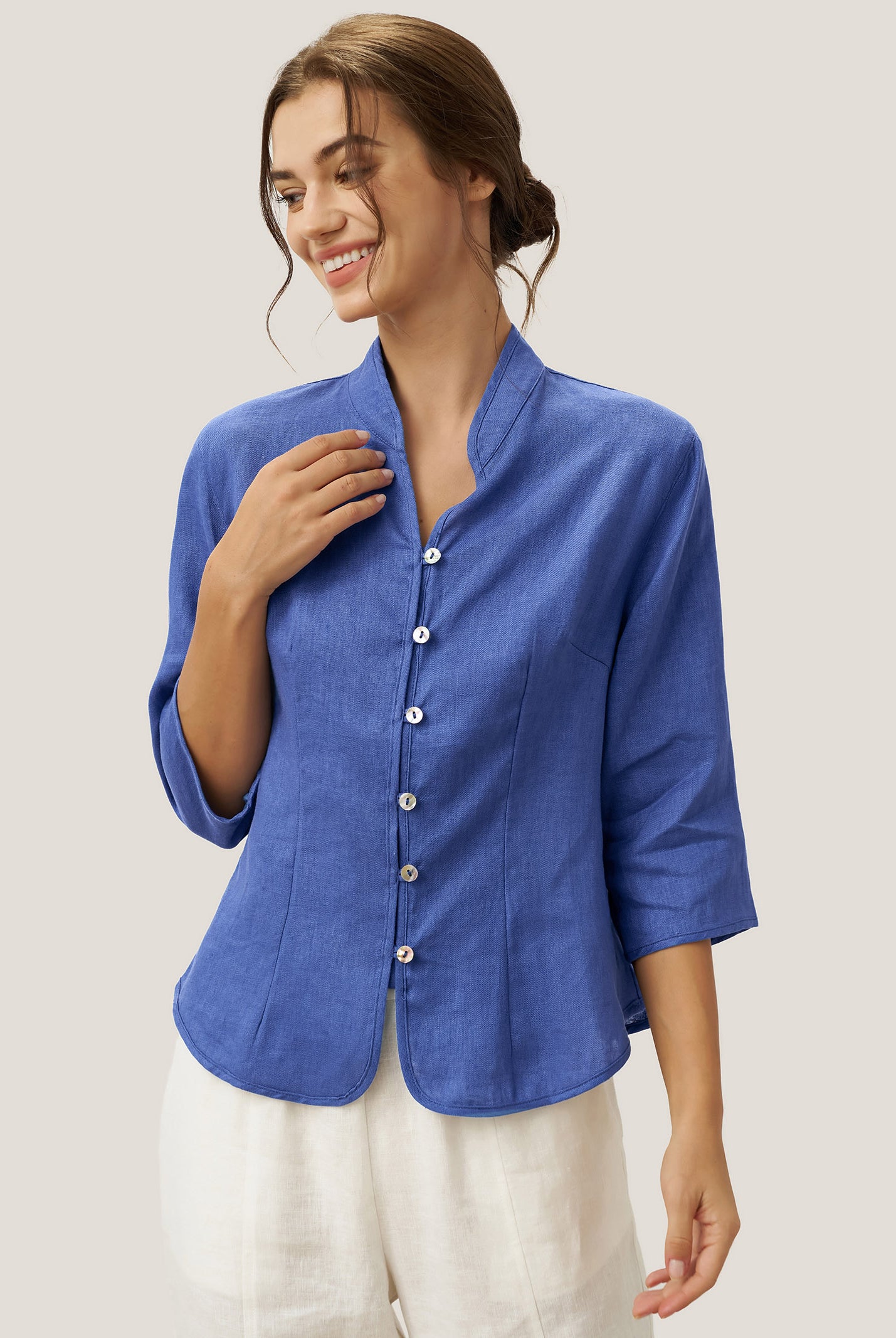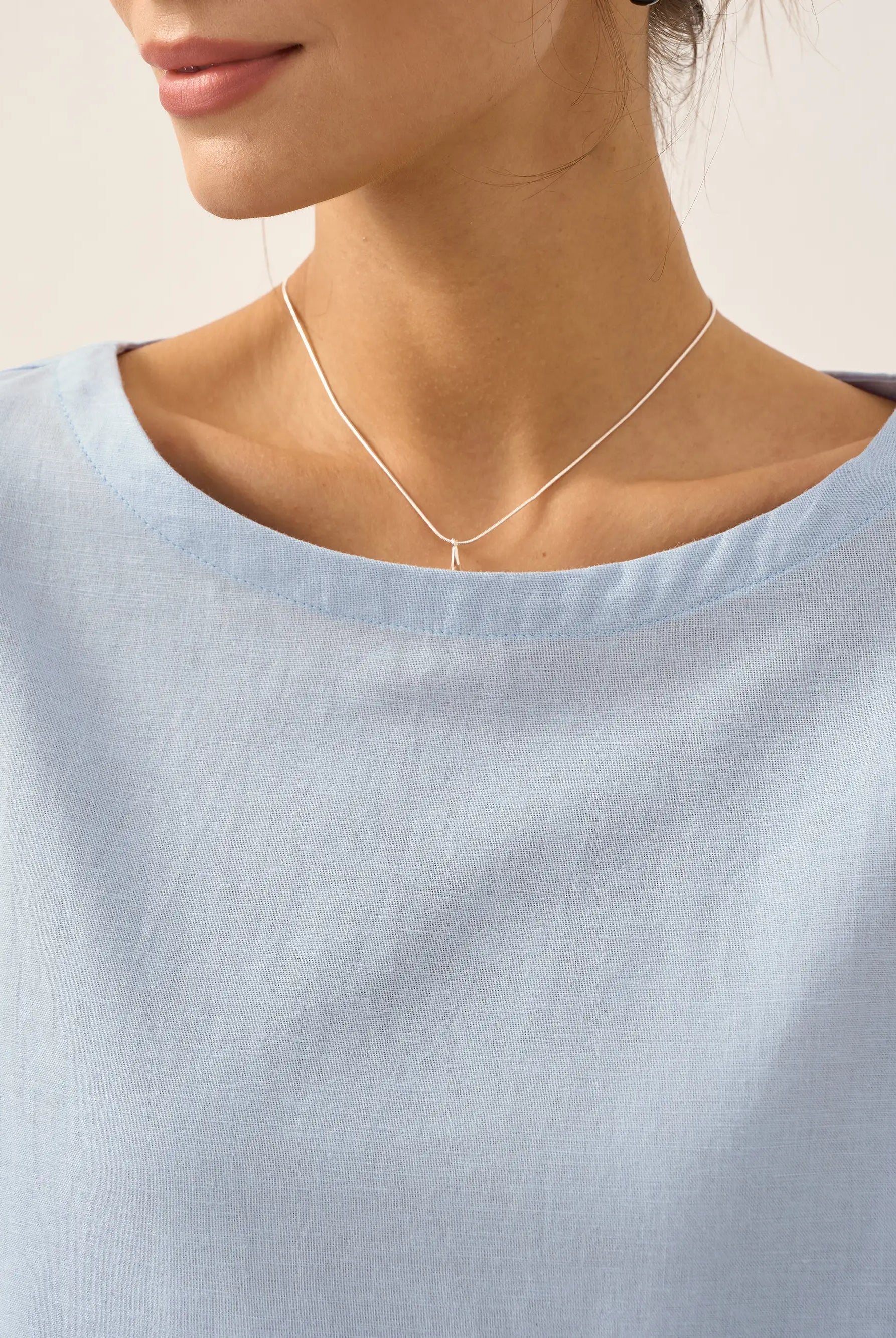 Linen Gingham Checked Round Soft-Fold Collar Top LAURA