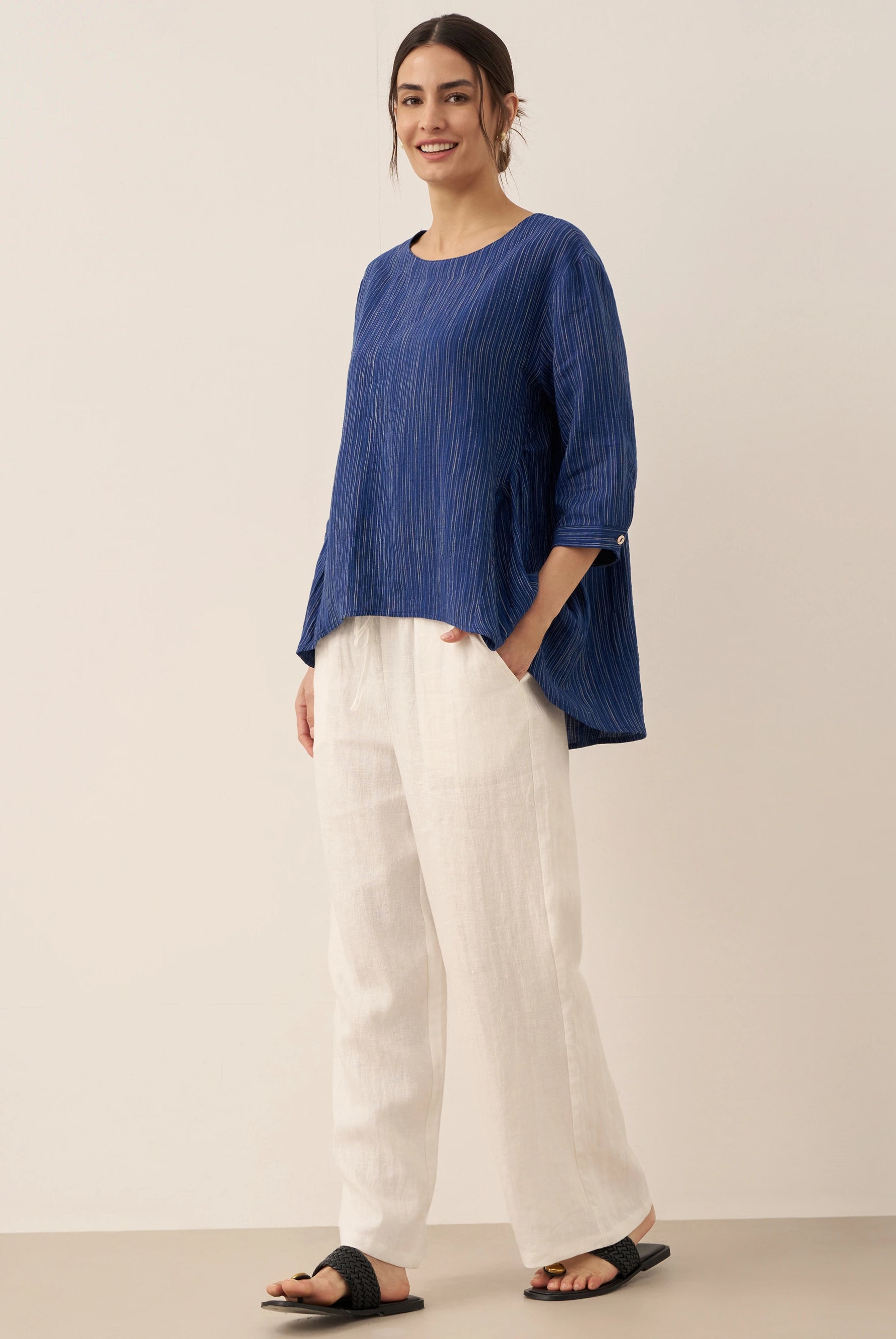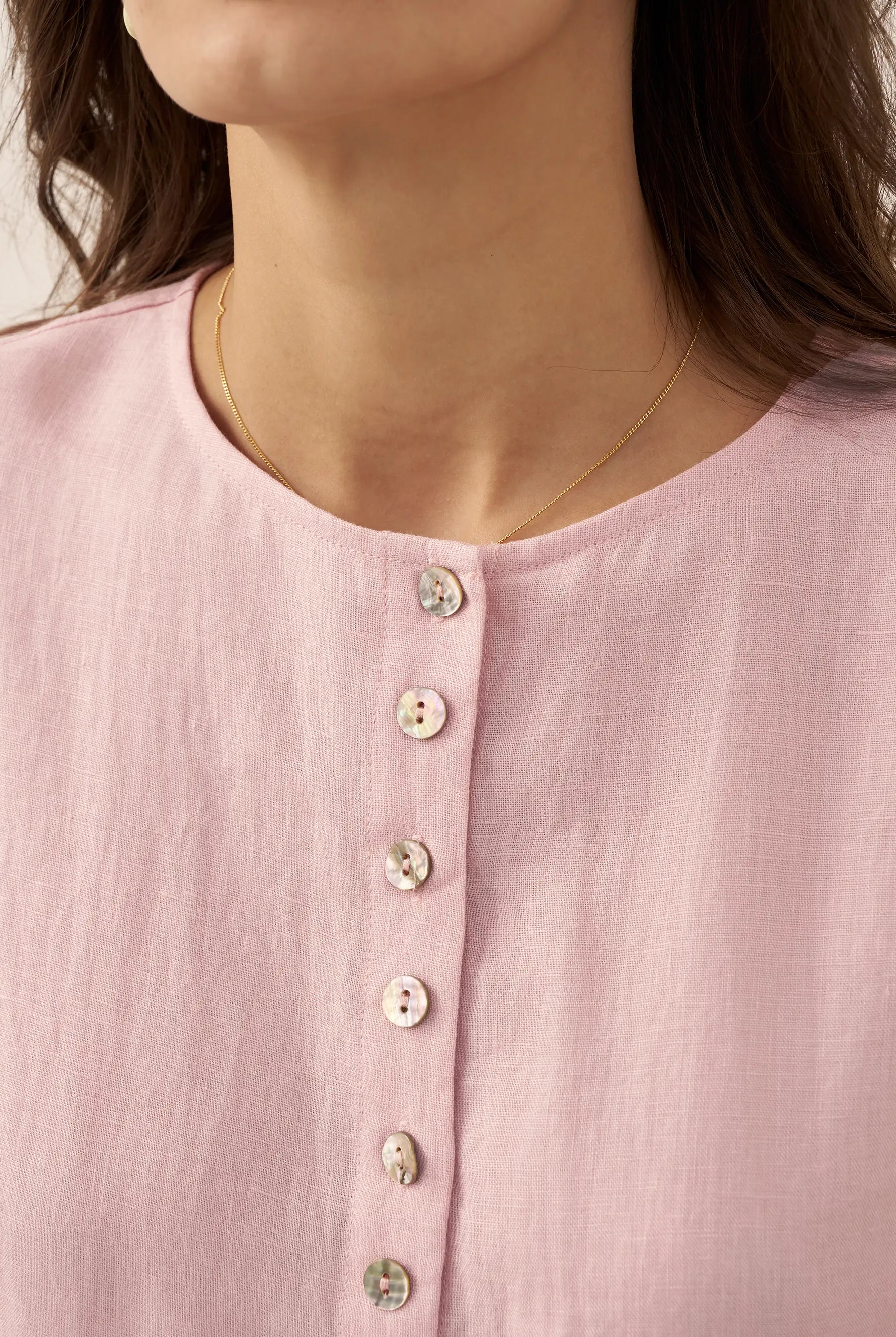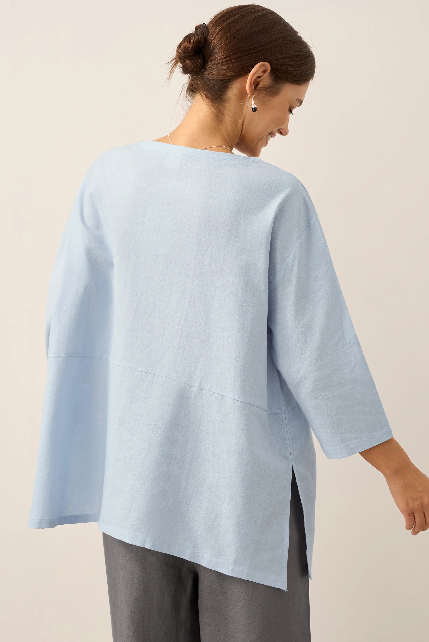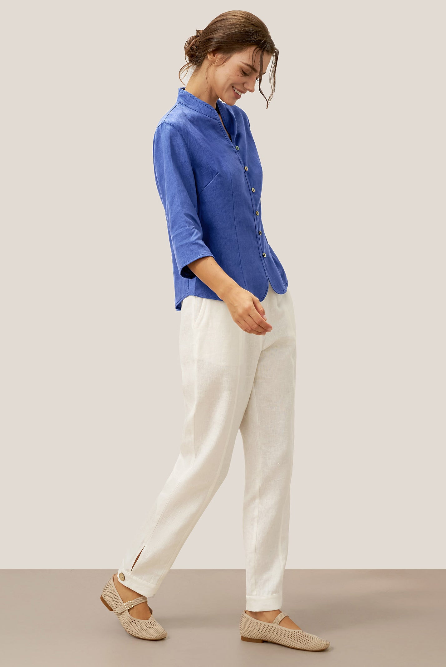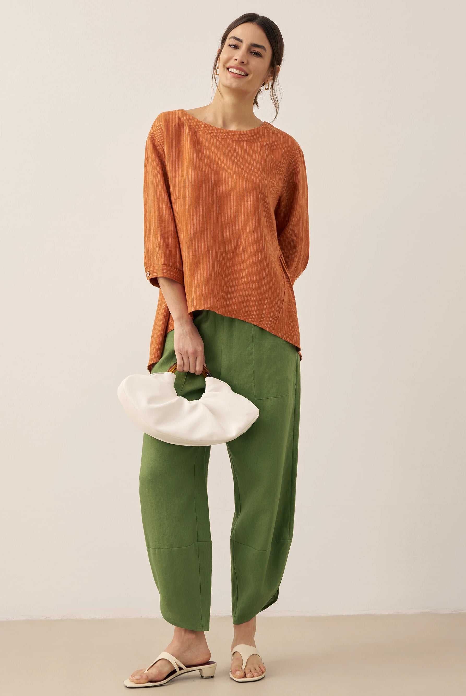 Linen Gingham Checked Round Soft-Fold Collar Top LAURA