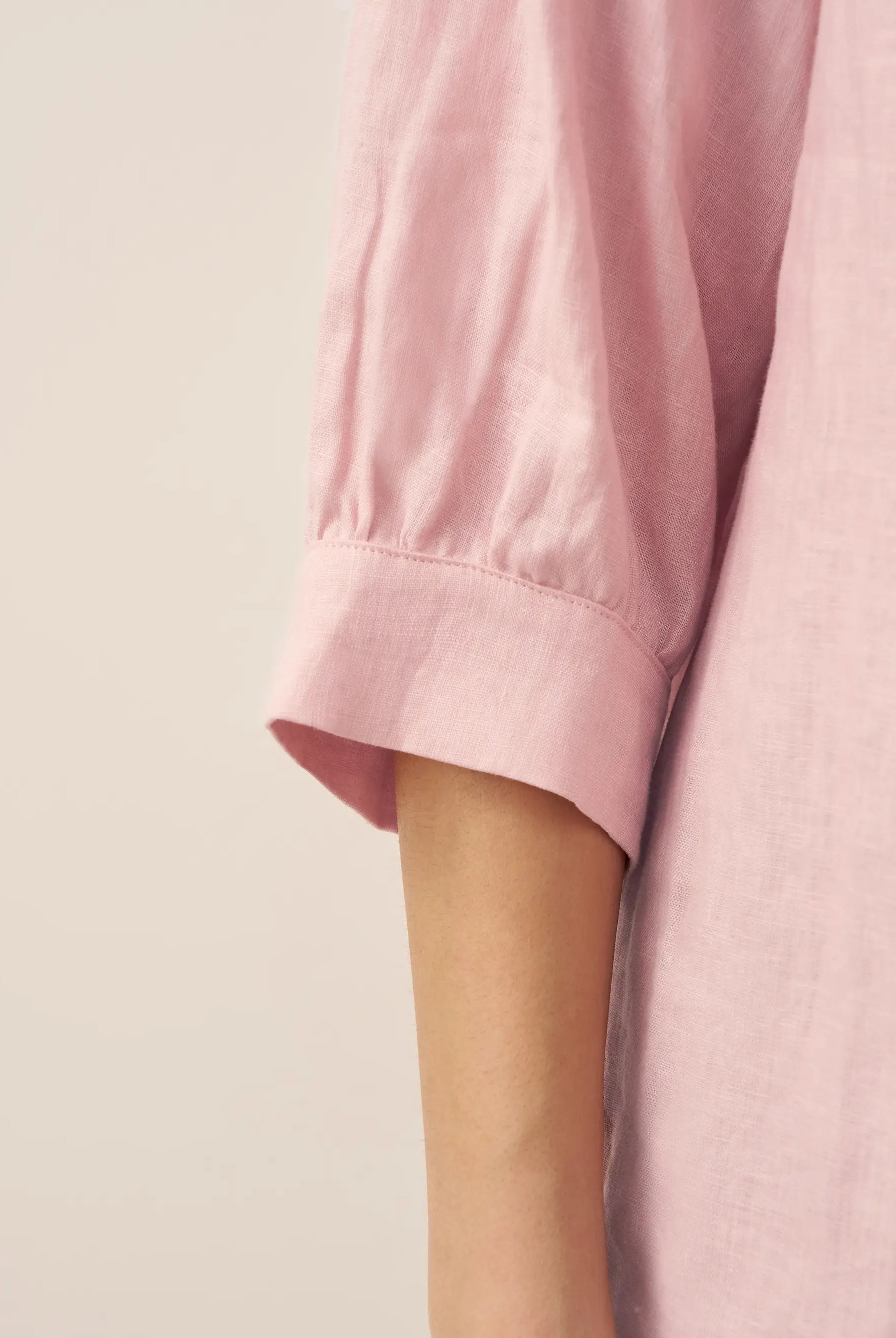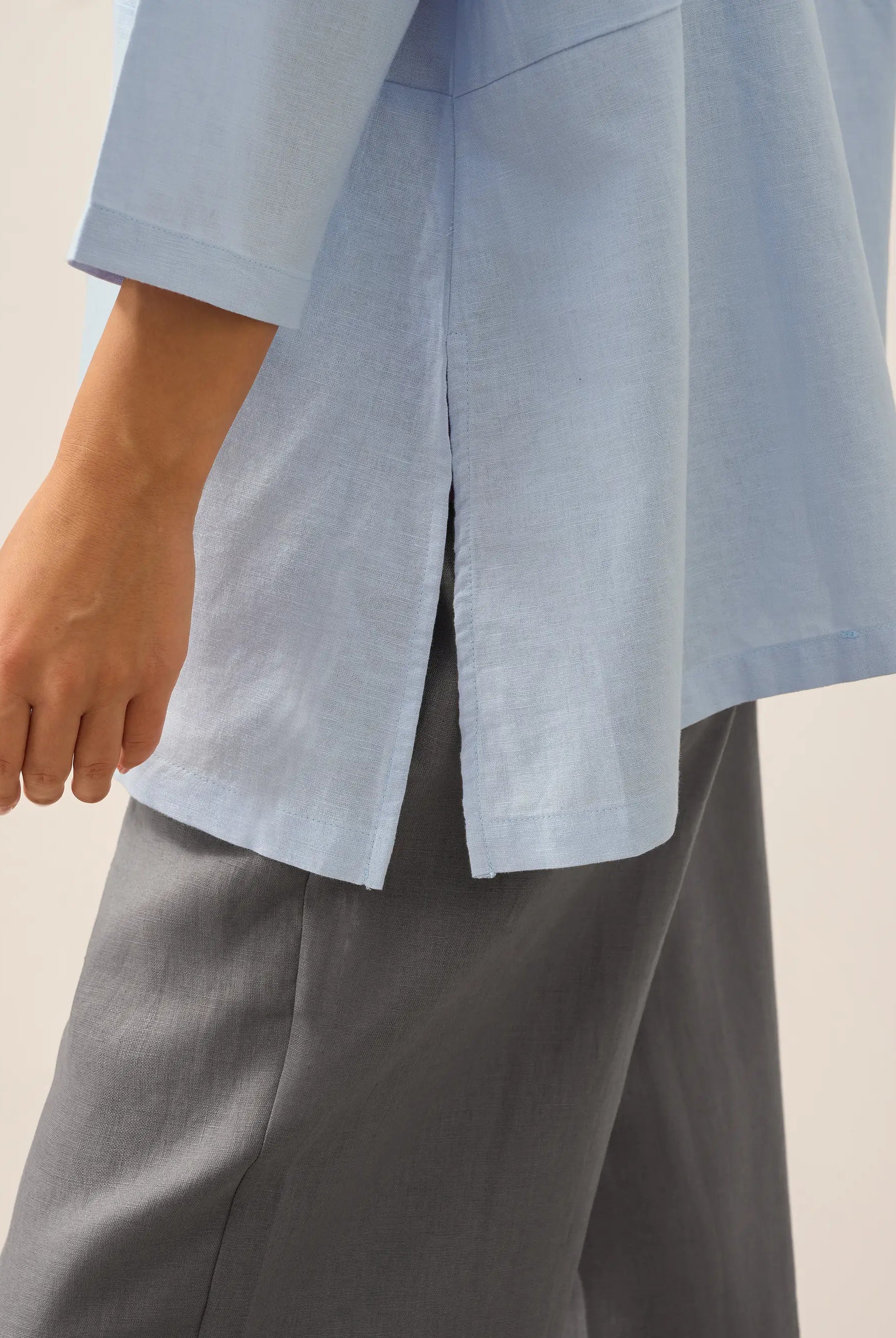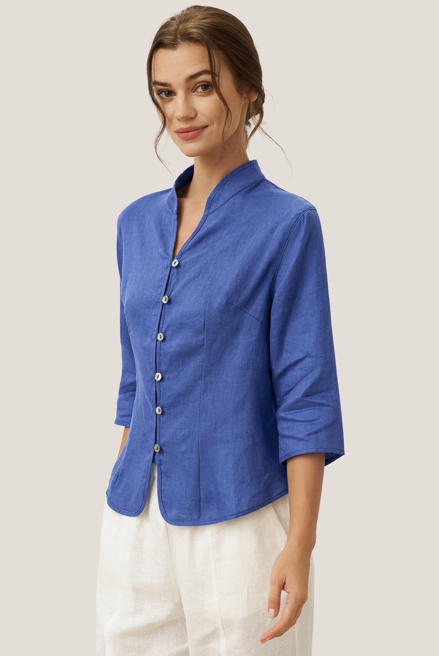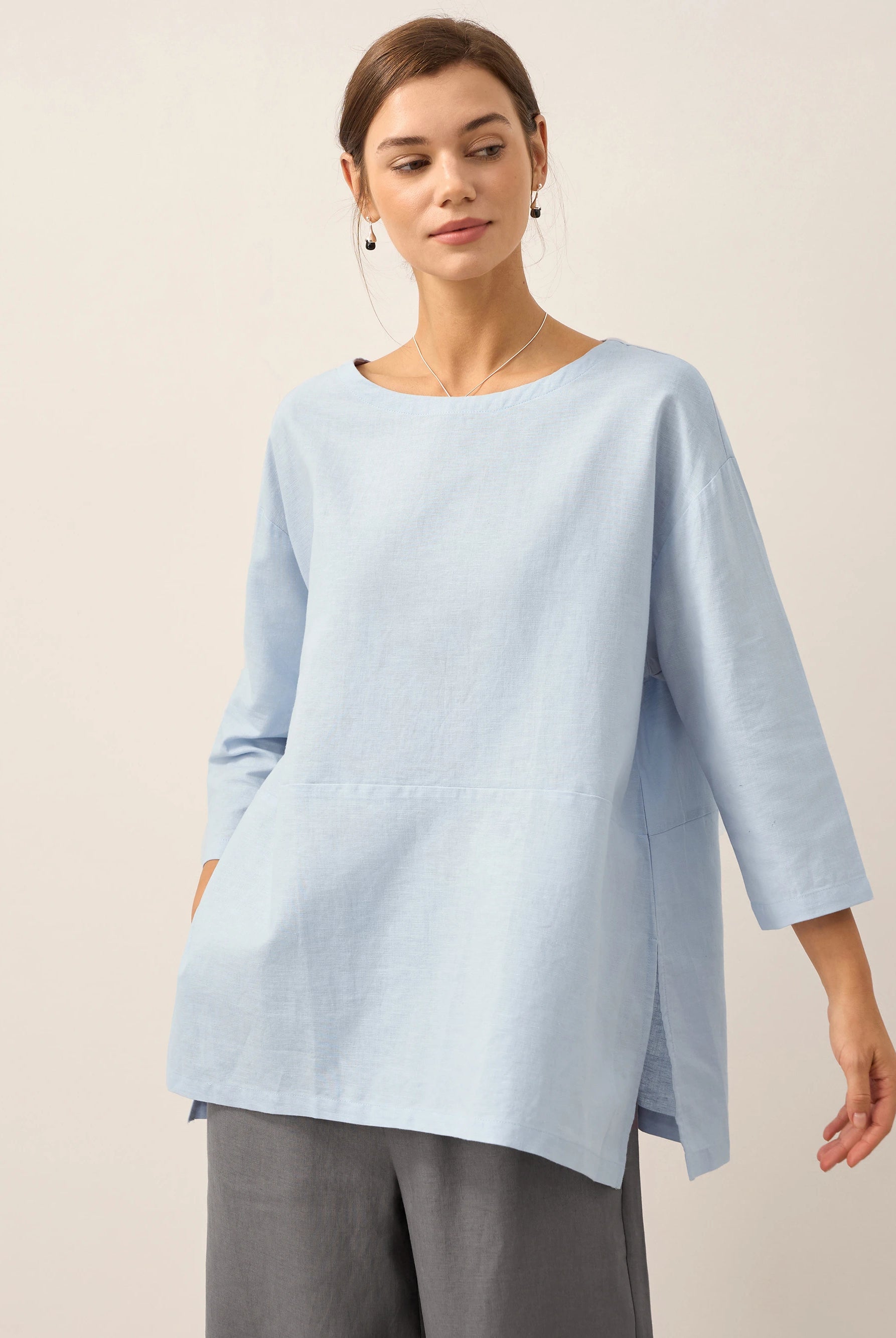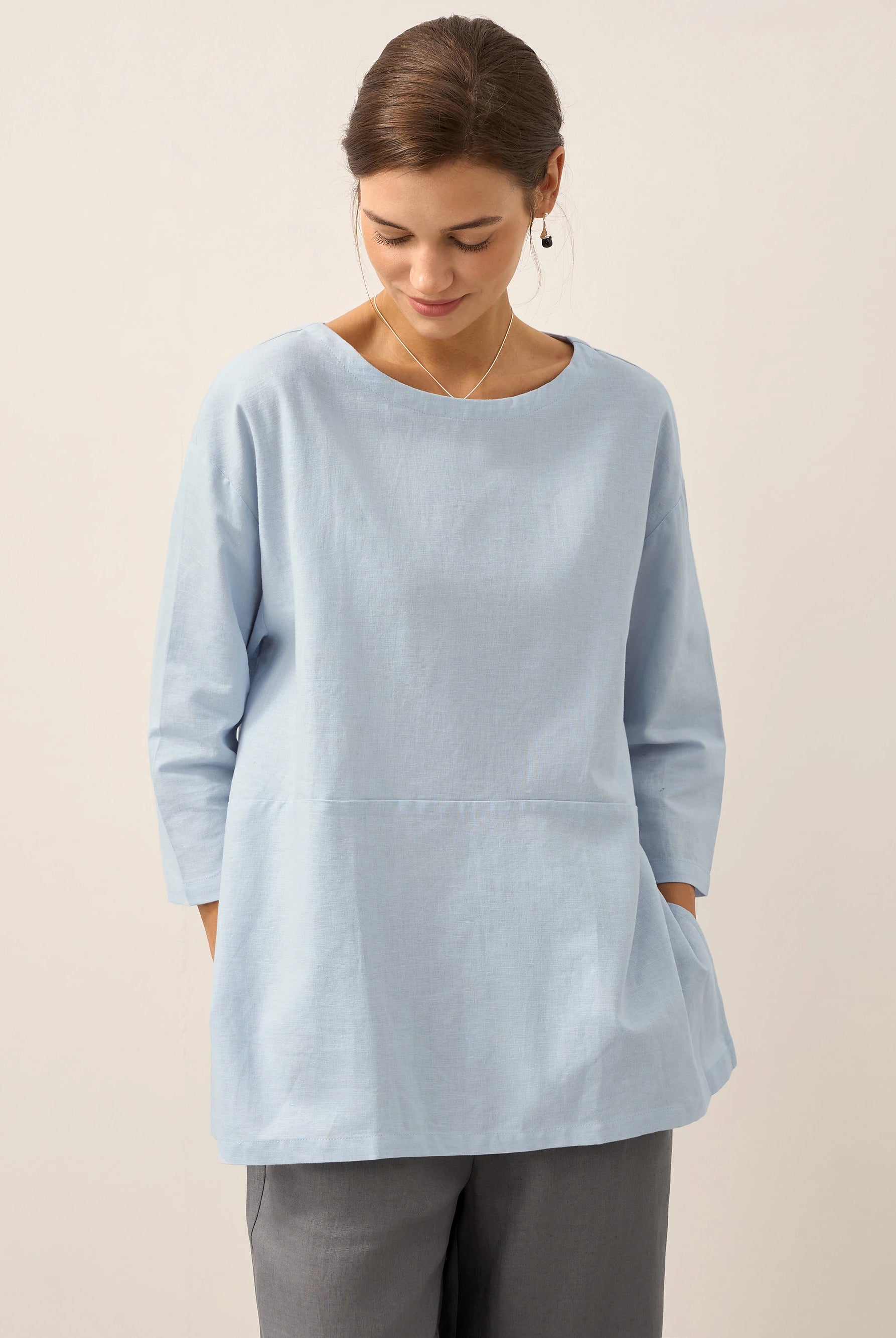 Linen Gingham Checked Round Soft-Fold Collar Top LAURA