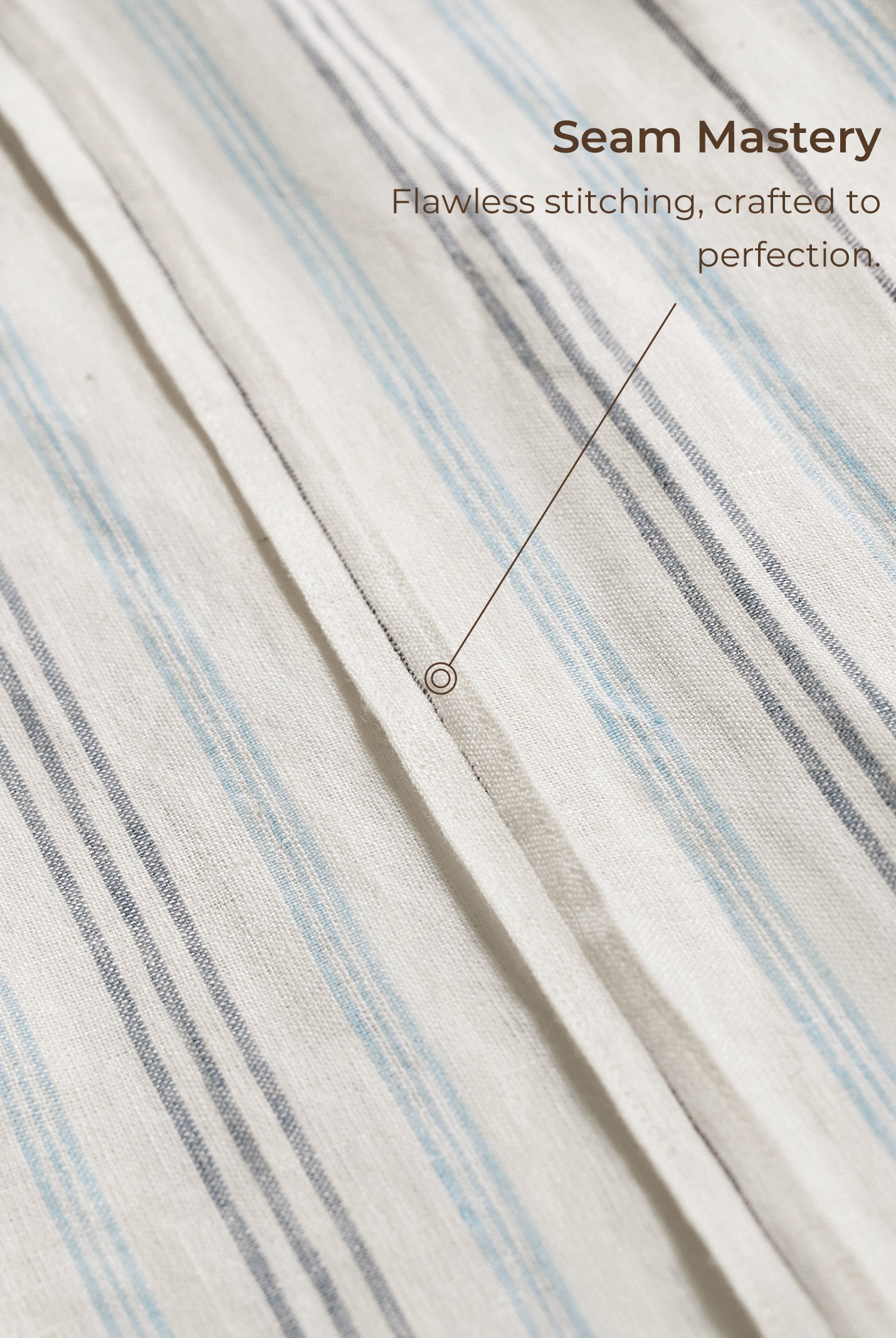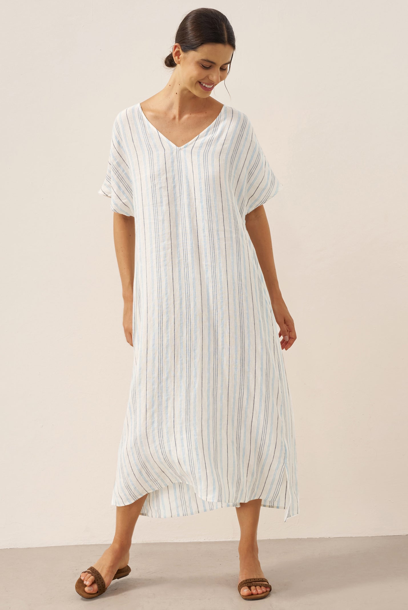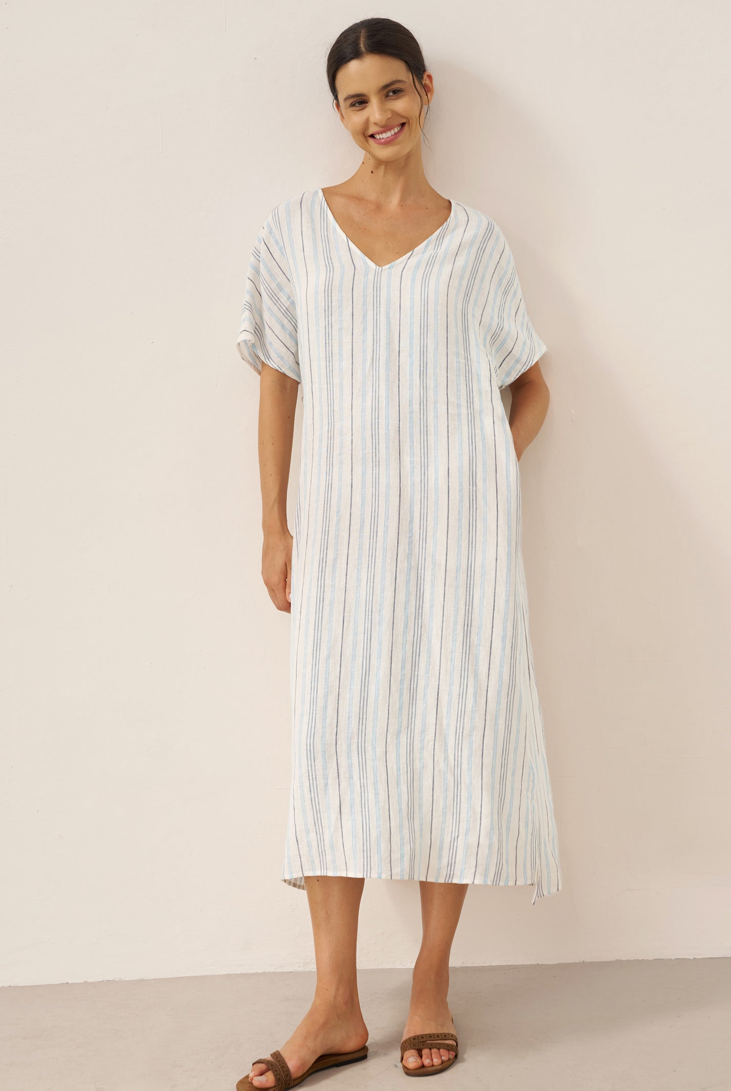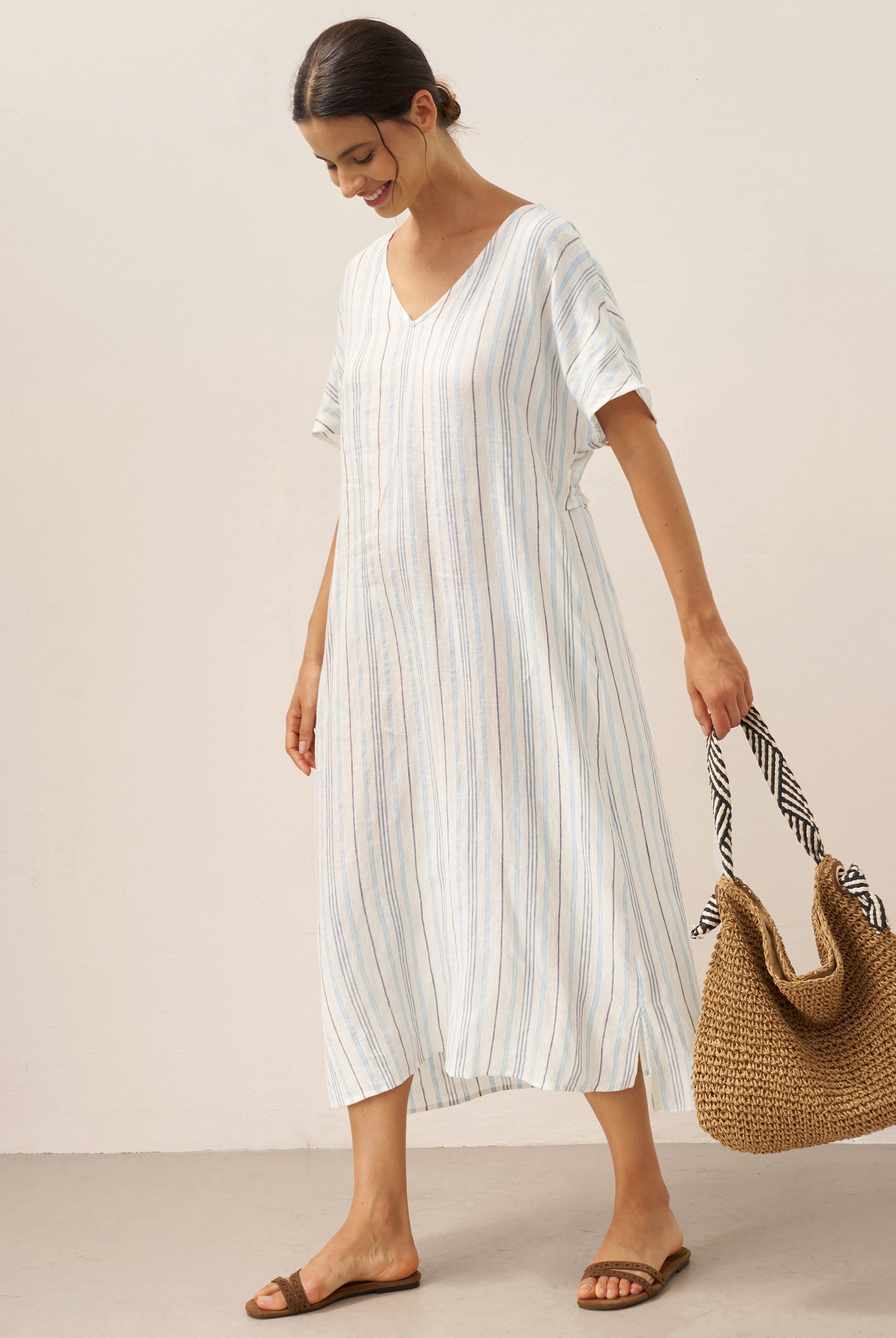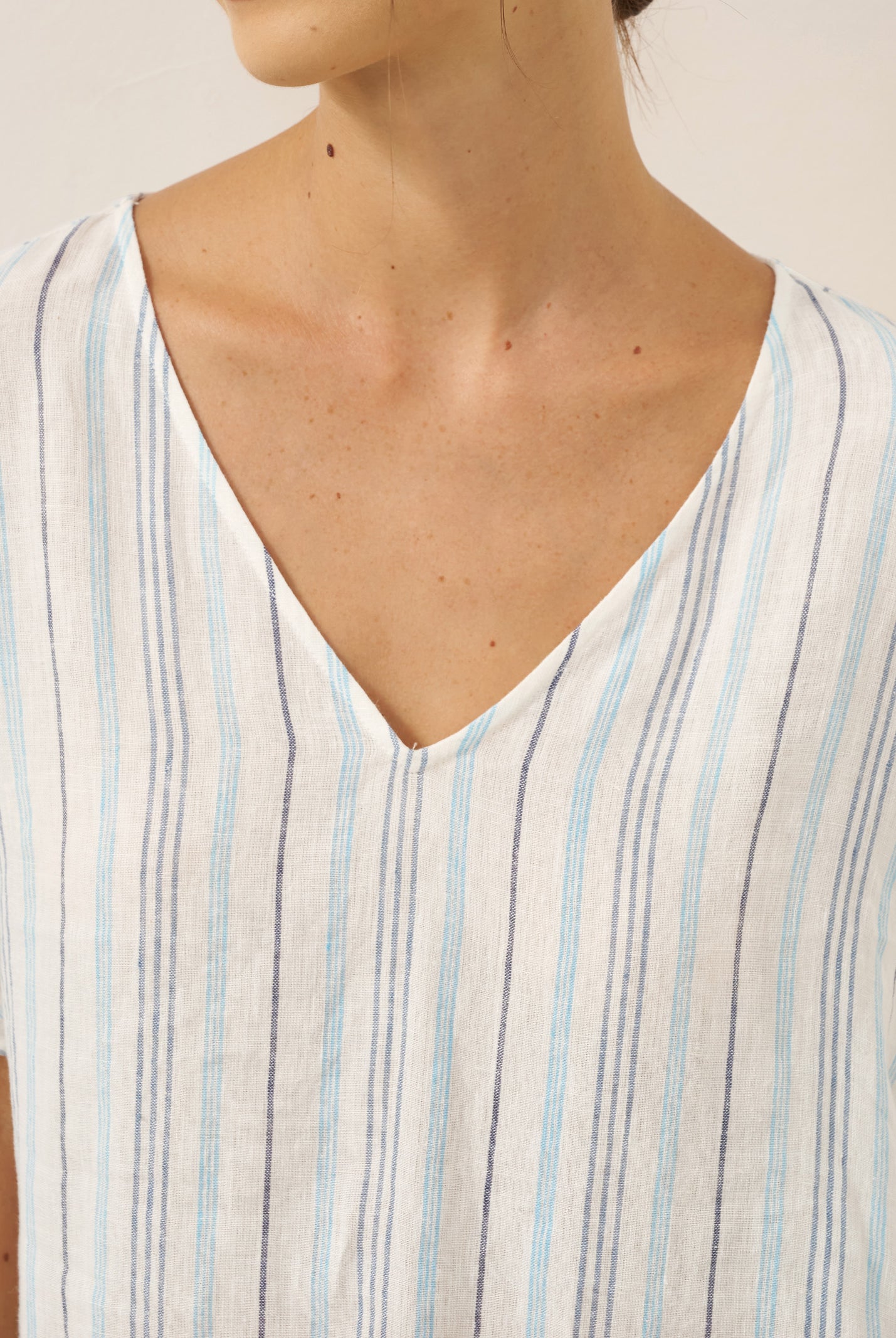 100% Linen Stripe Shawl V-Neck Half Sleeve Top