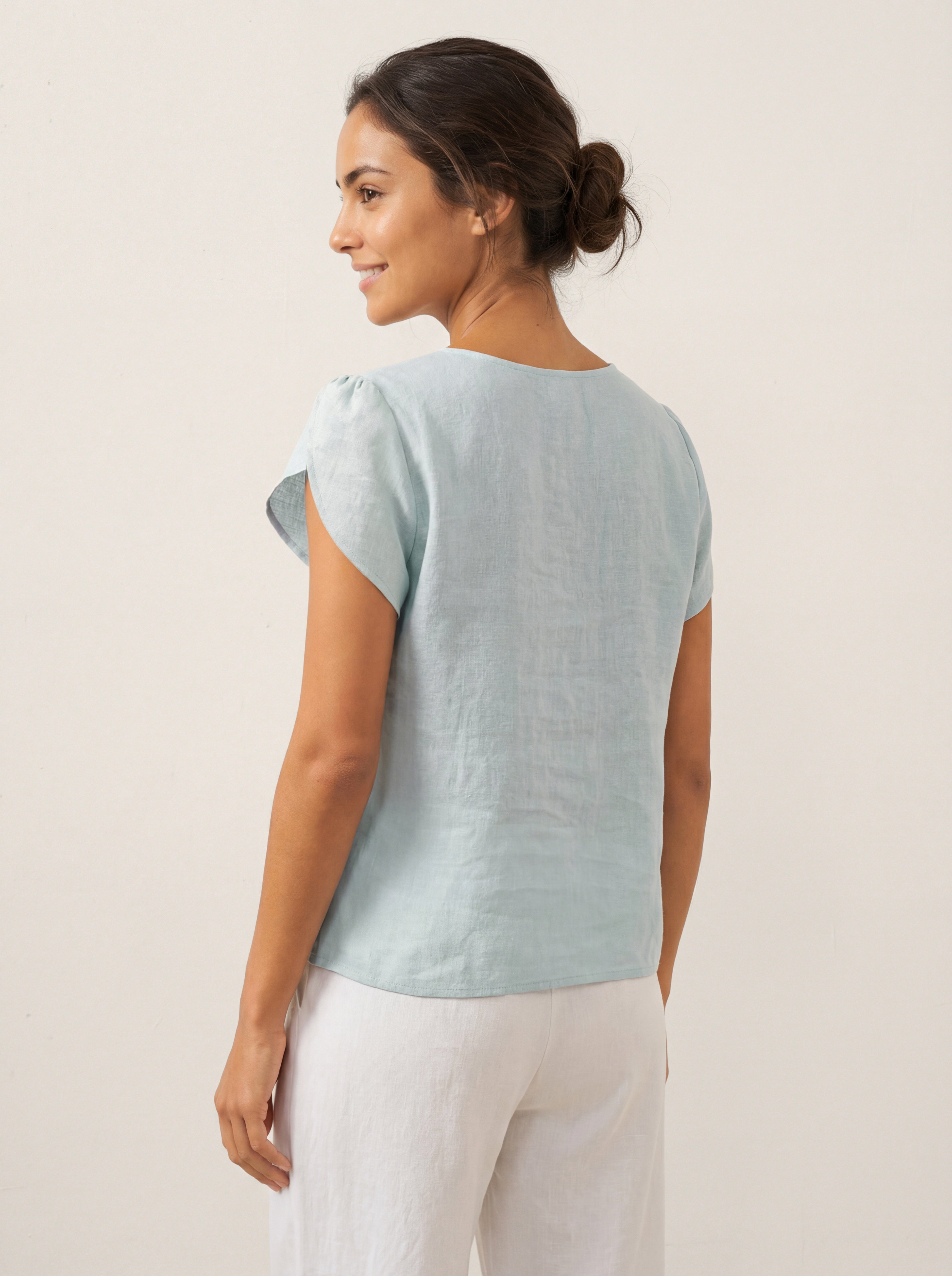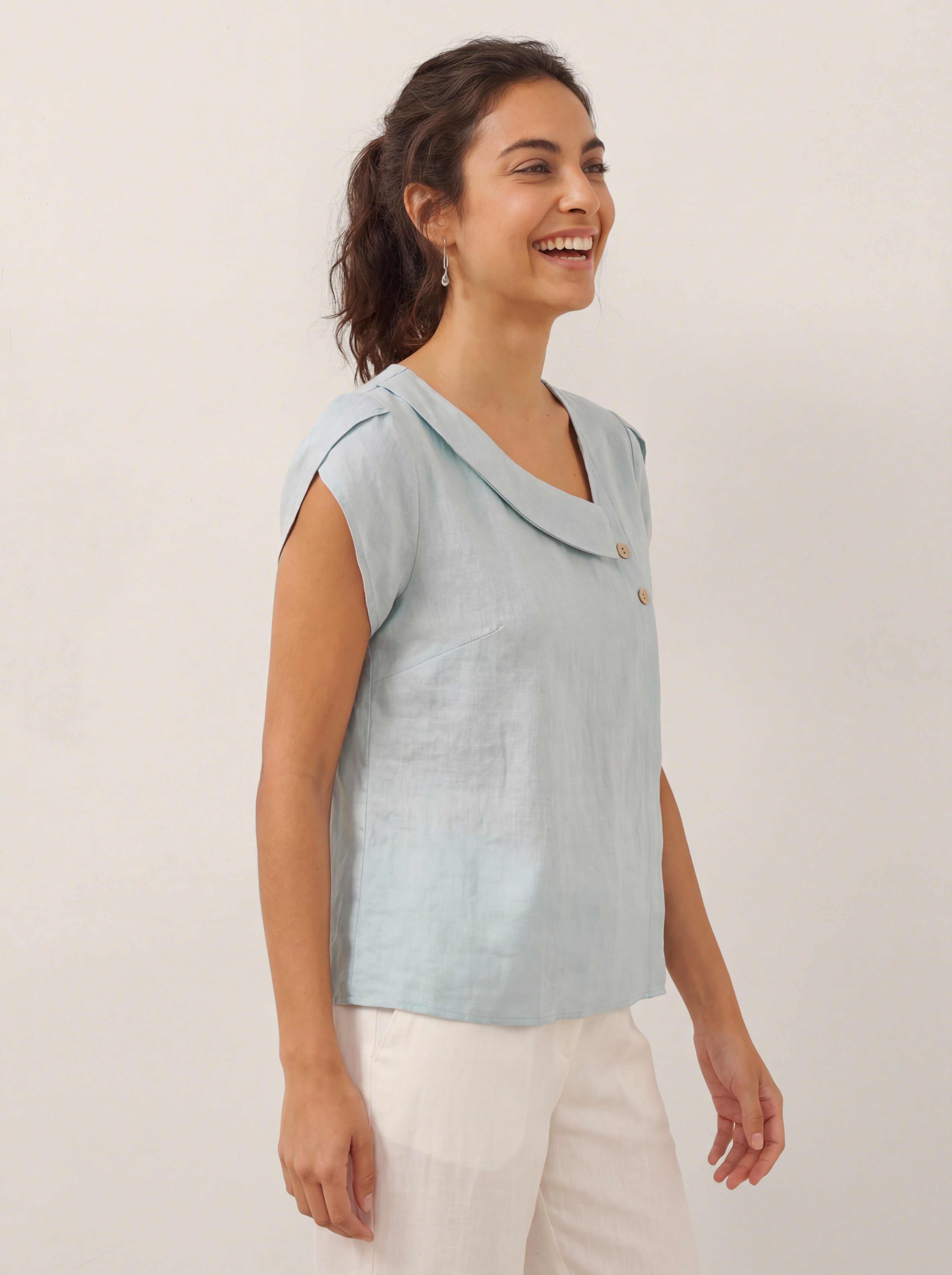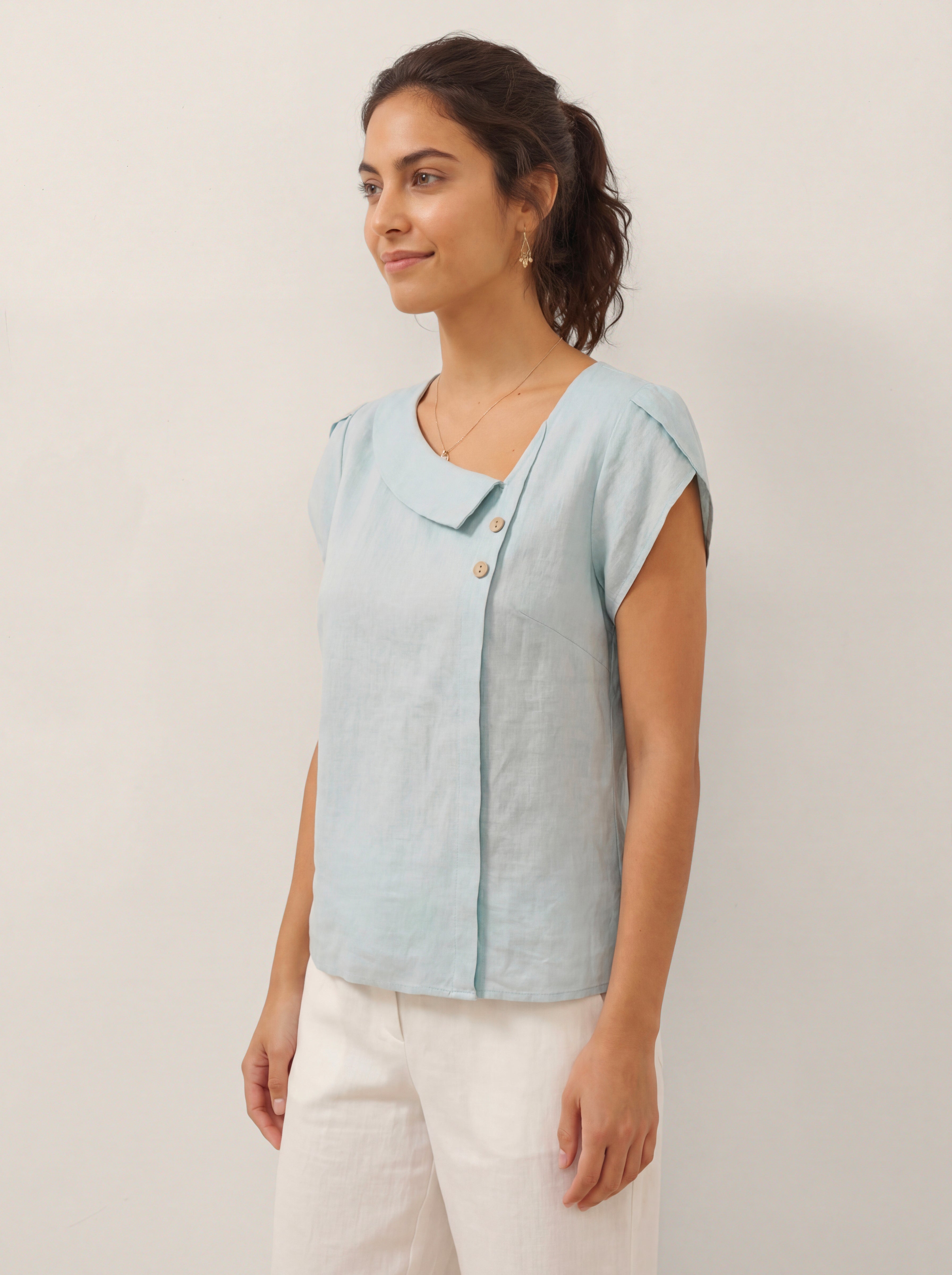 100% Linen Crescent Collar Flutter Sleeve Top FARA