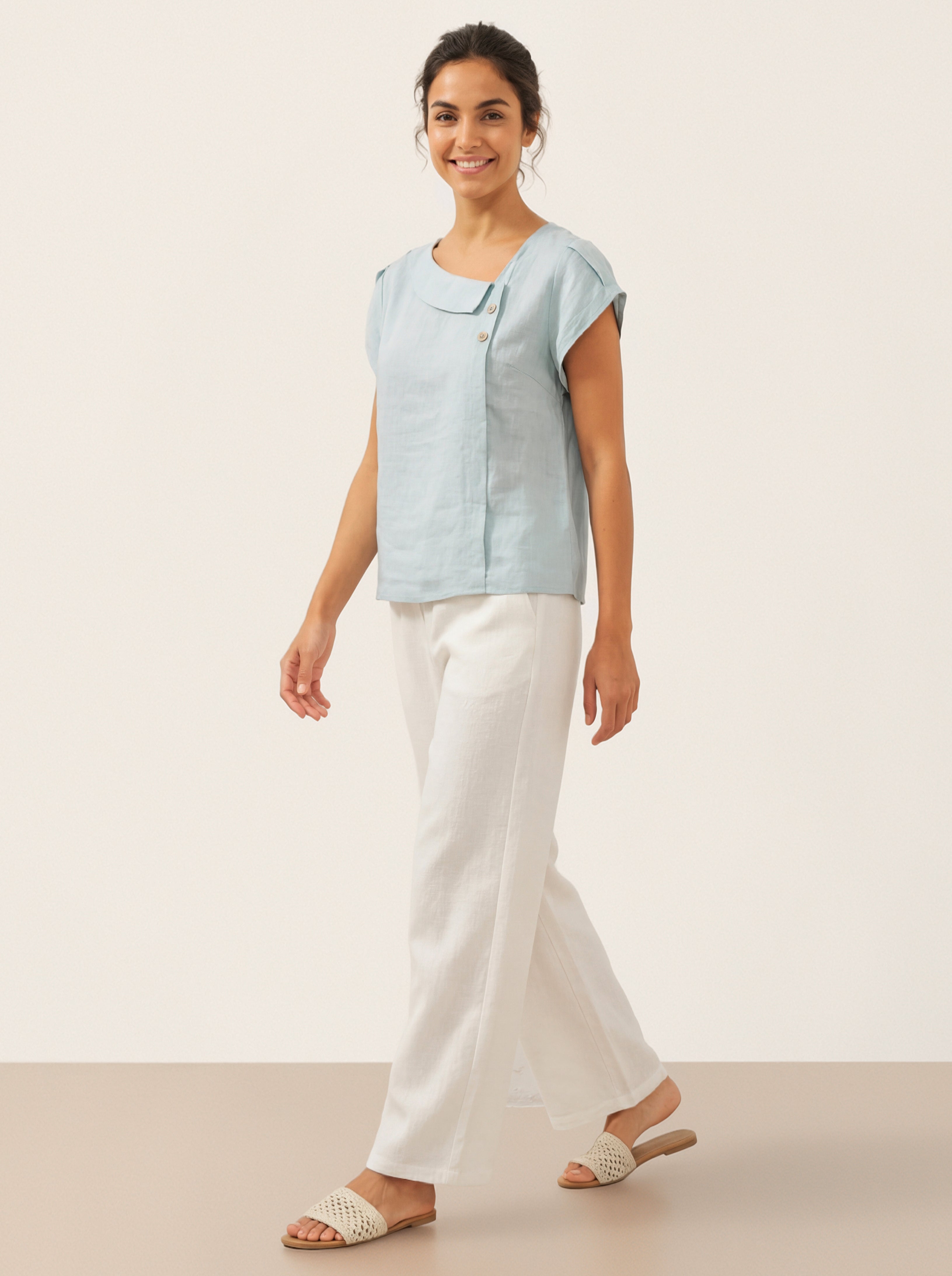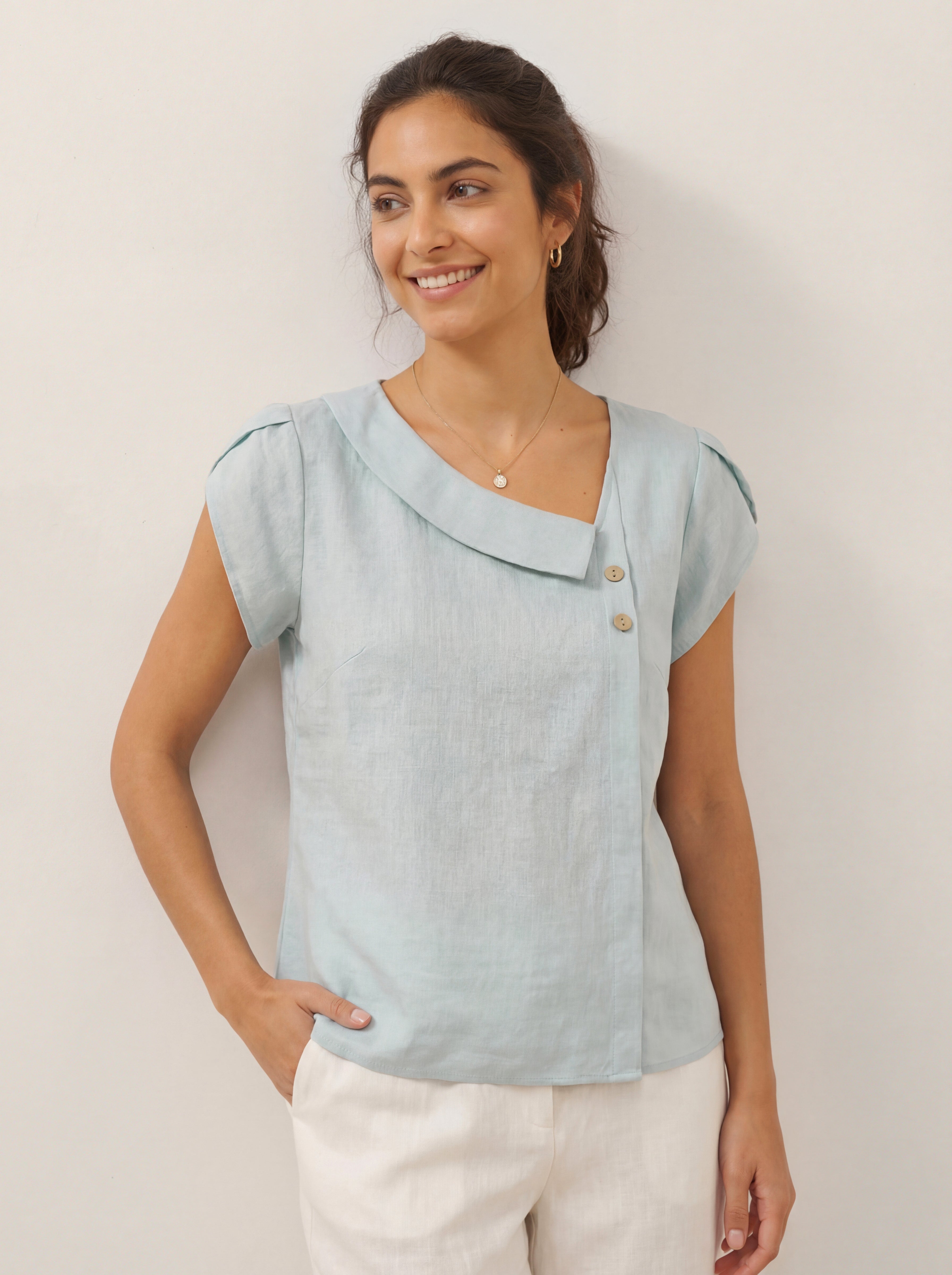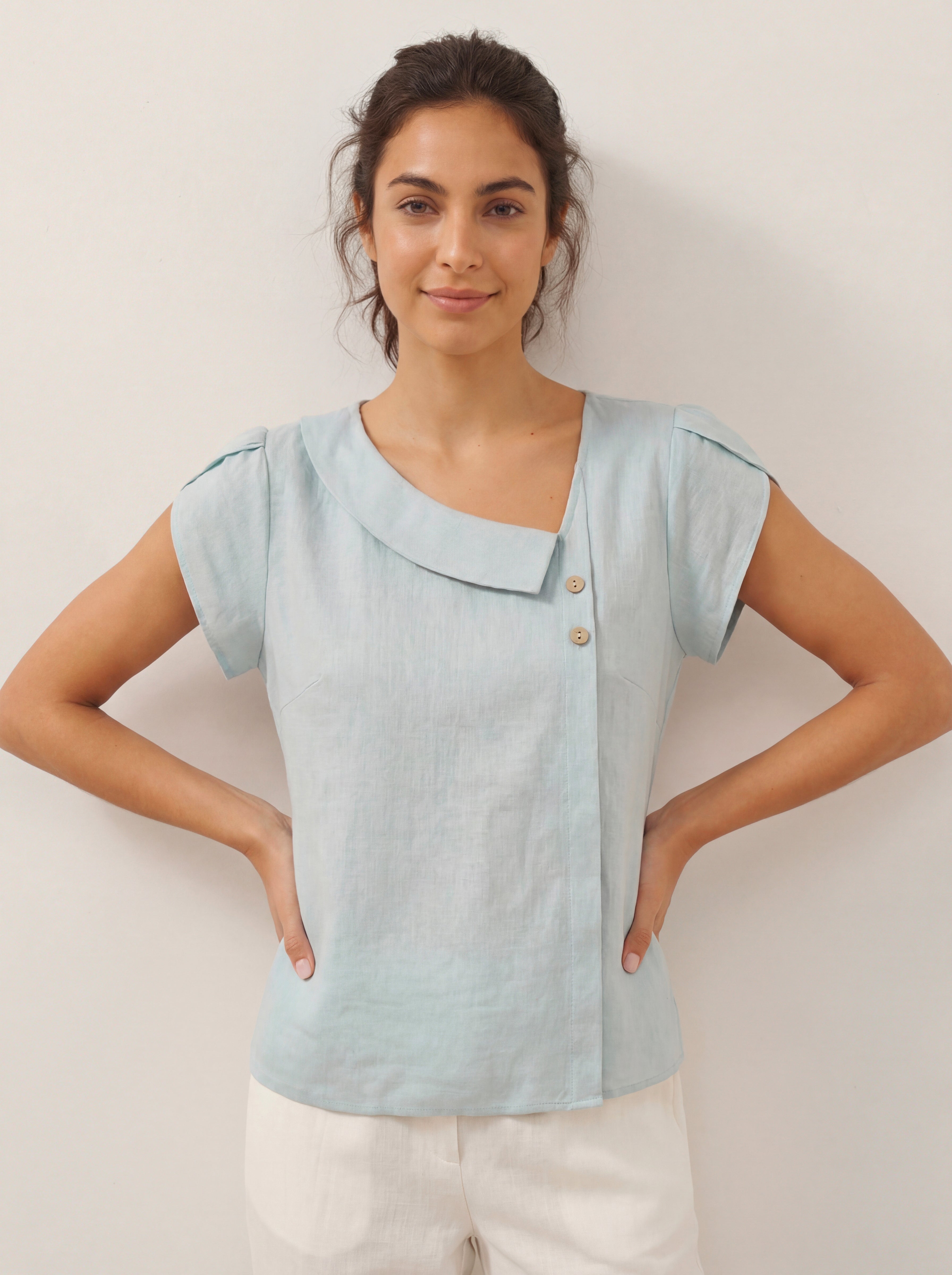 100% Linen Crescent Collar Flutter Sleeve Top FARA