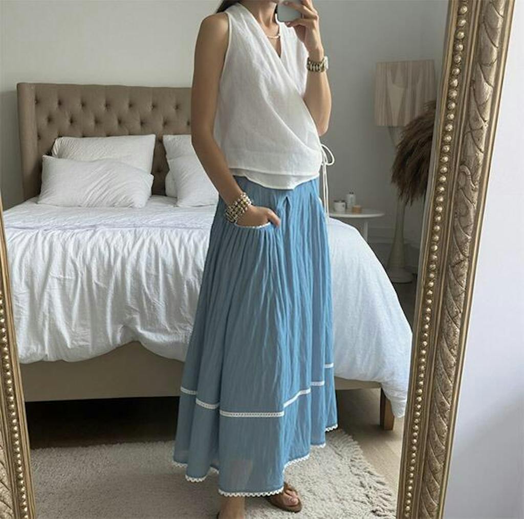 - Garden Party: Flowy midi skirt + strappy sandals + wide-brimmed sunhat