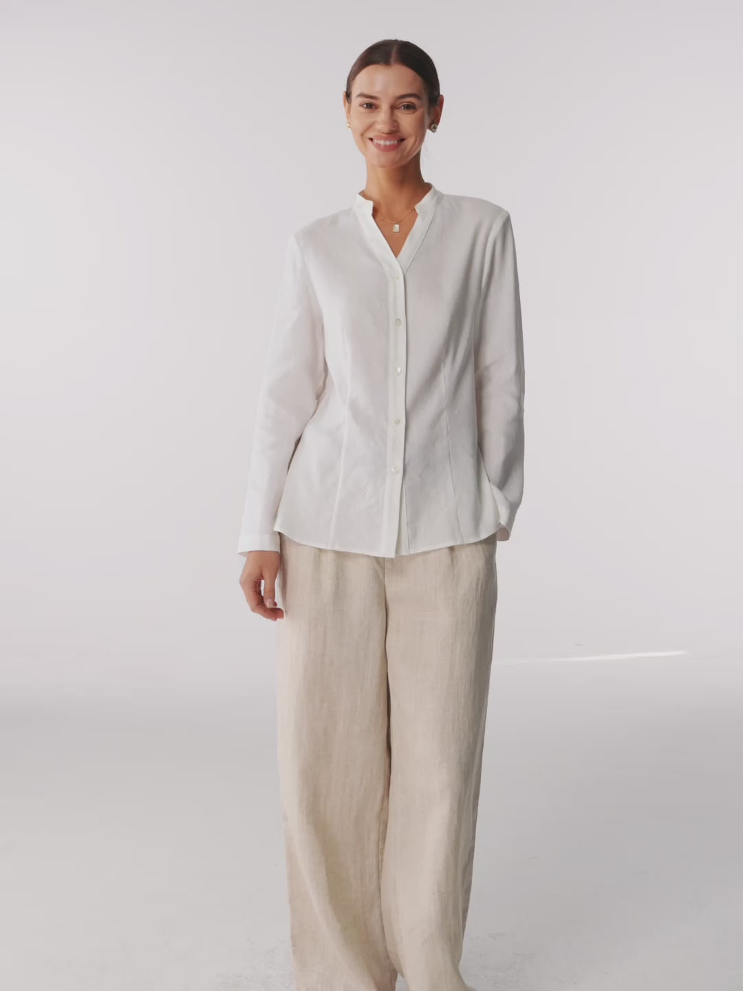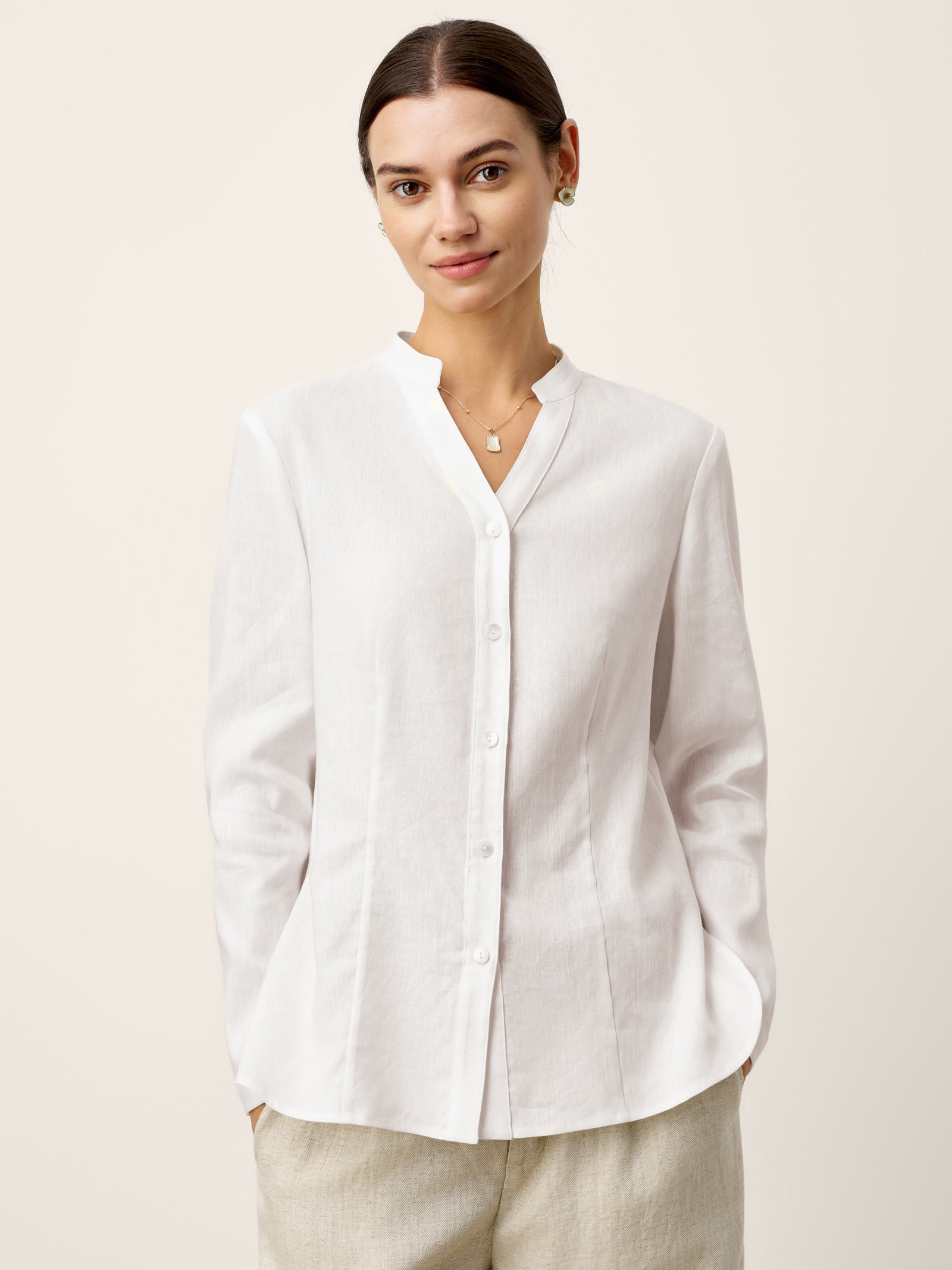 Linen-Lyocell Mandarin Collar Fitted Seam Shirt THORA