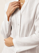 • Refined Mandarin V-Neck: Small stand collar + subtle V opening: polished, lightweight, and neck-elongating without feeling too open.