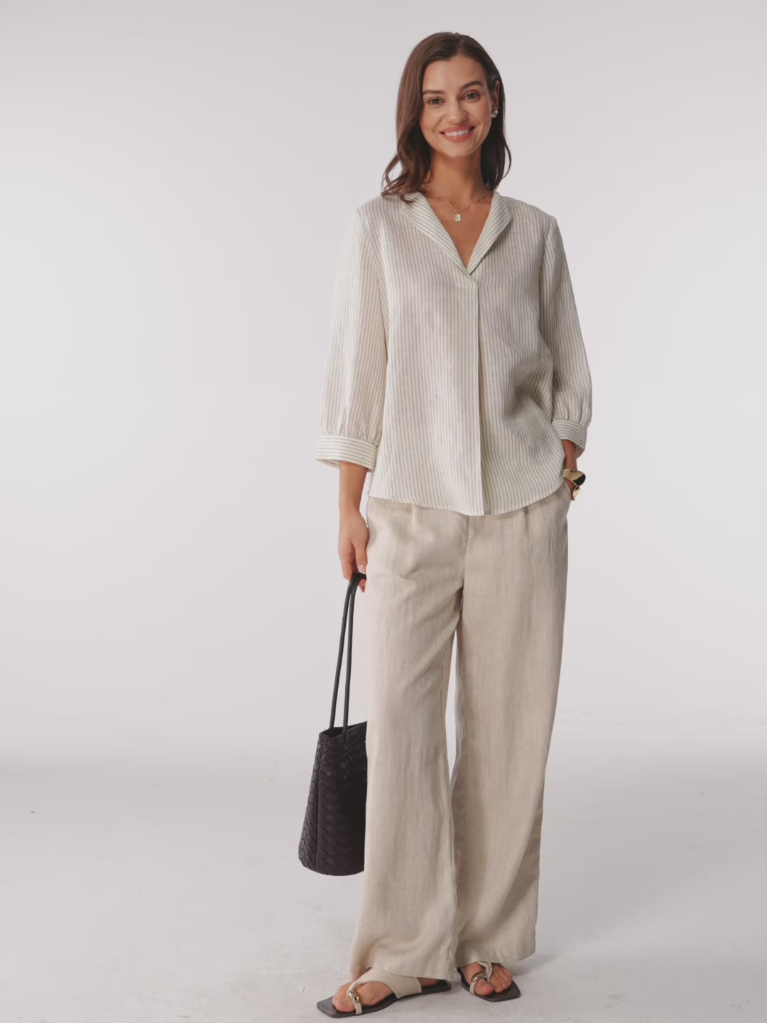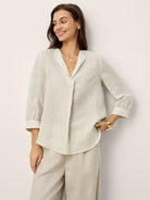 Linen-Lyocell Striped Lapel Inverted Pleat Pullover Top MARGOT