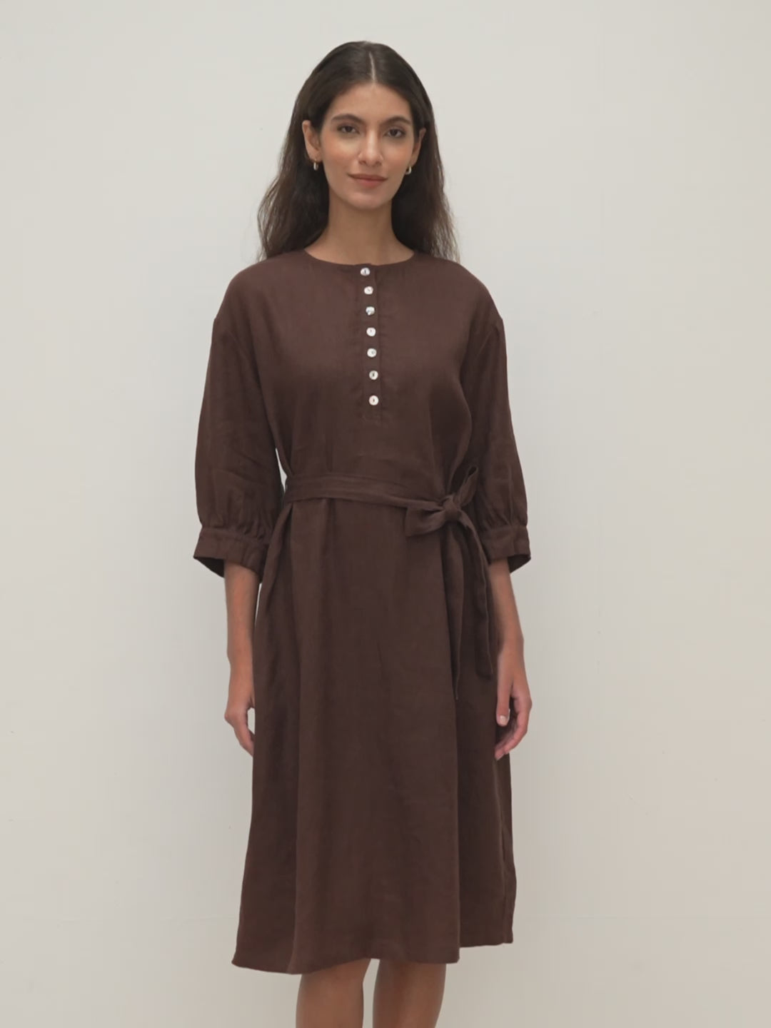 100% Linen Button Detail Midi Dress with Detachable Belt EIRA