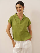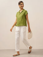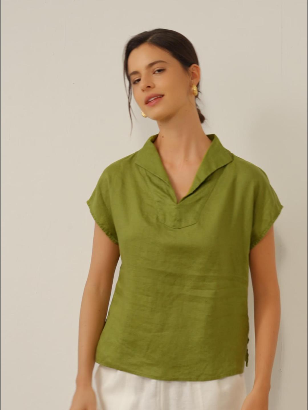 100% linen, cool and comfortable. This collar design is very special, I paired it with white trousers