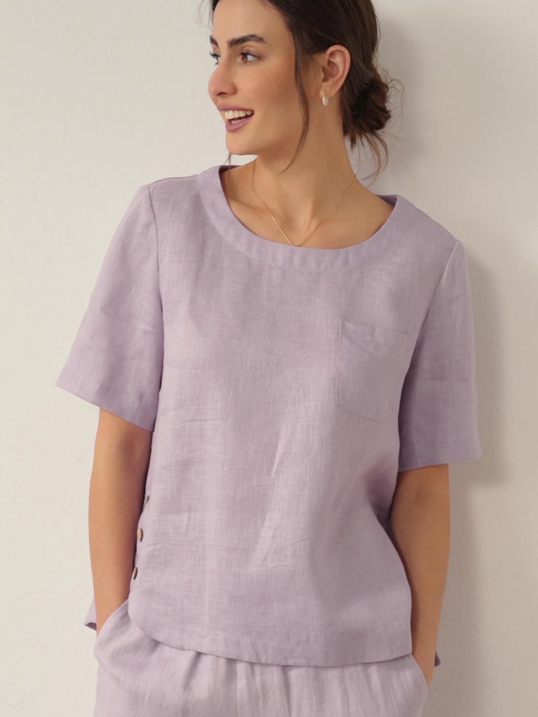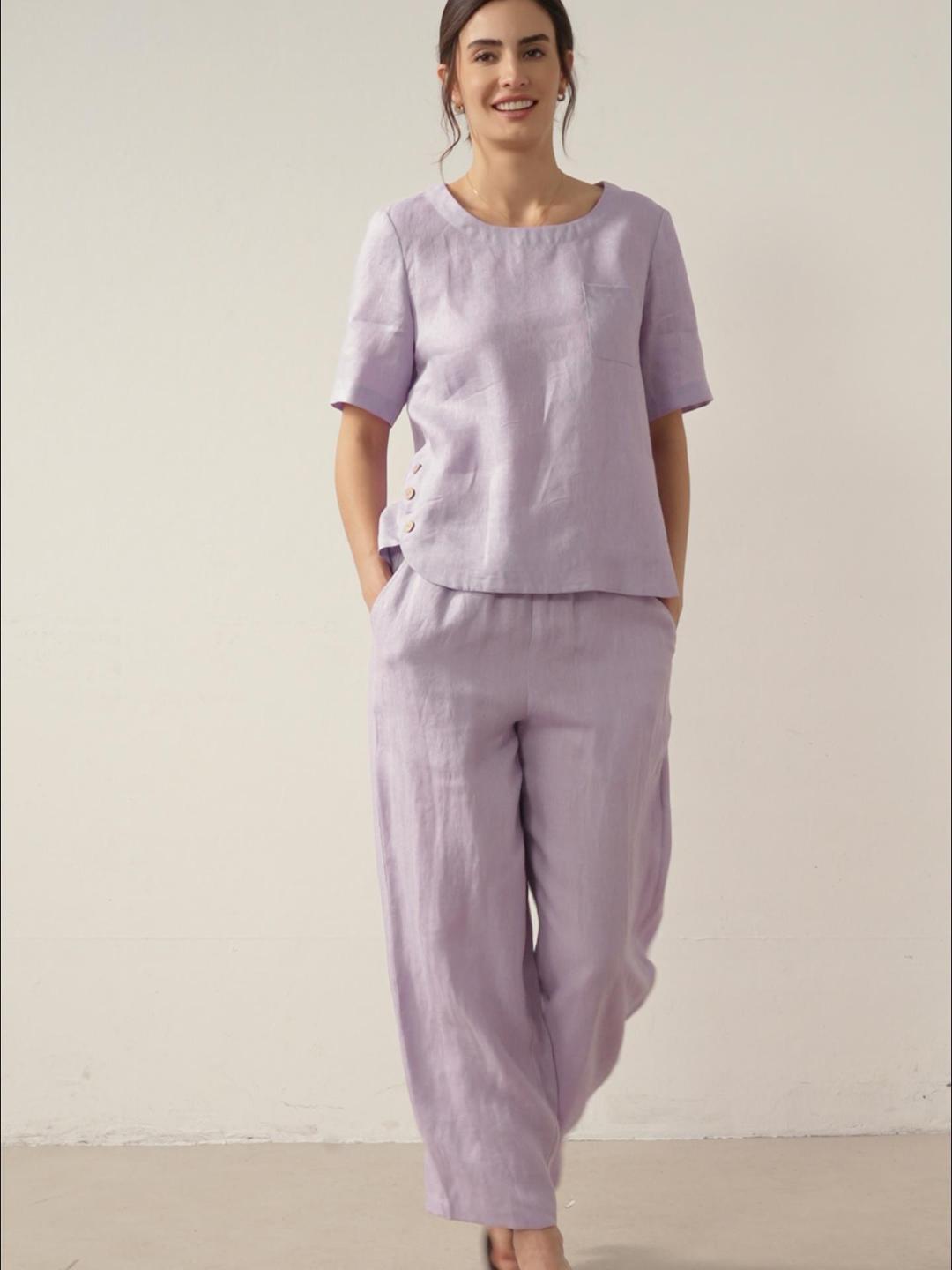 100% Linen Short-Sleeve Round Neck Button Detail Top & Pants Set SASHA